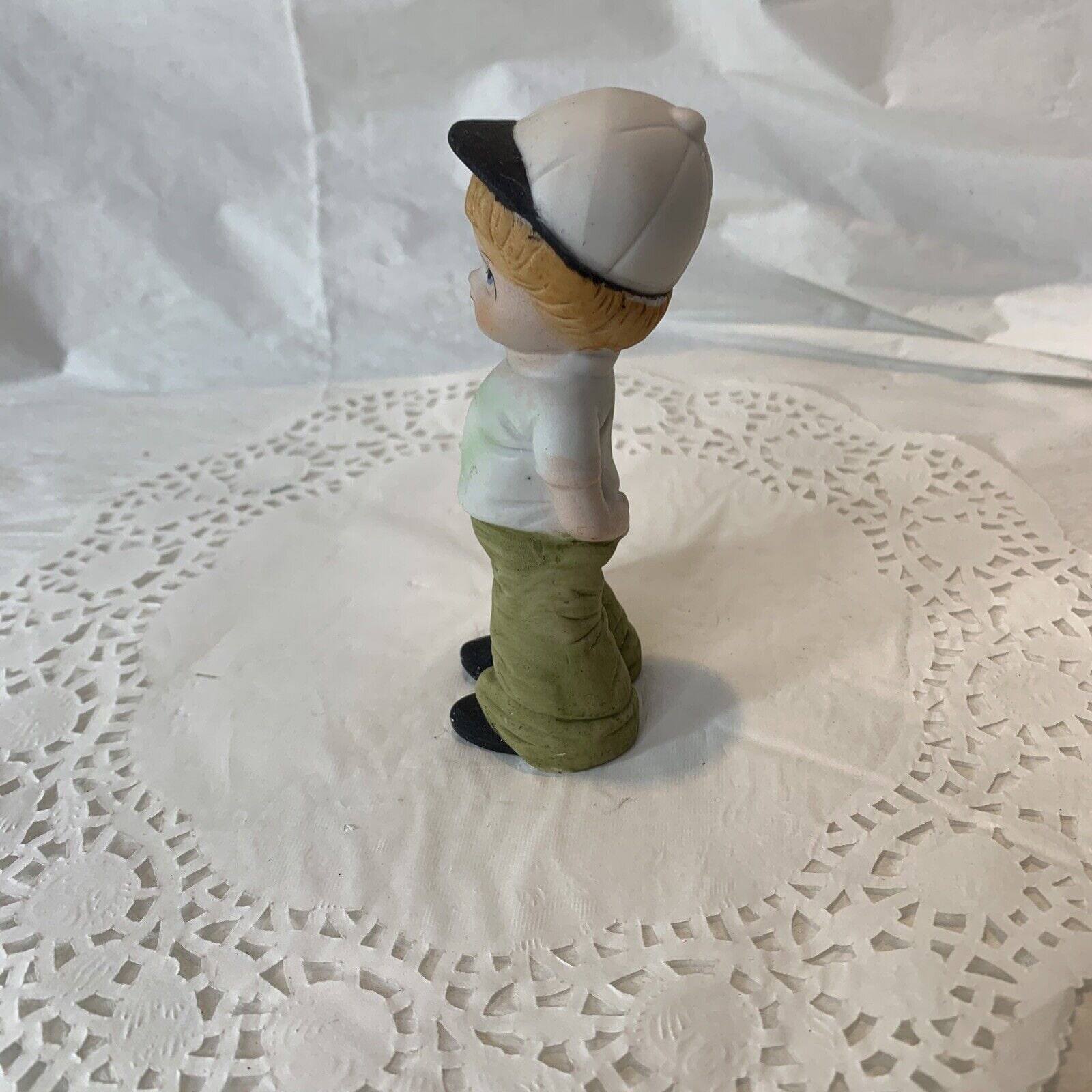 ~Features a child wearing a baseball cap with a kitty beside his leg!