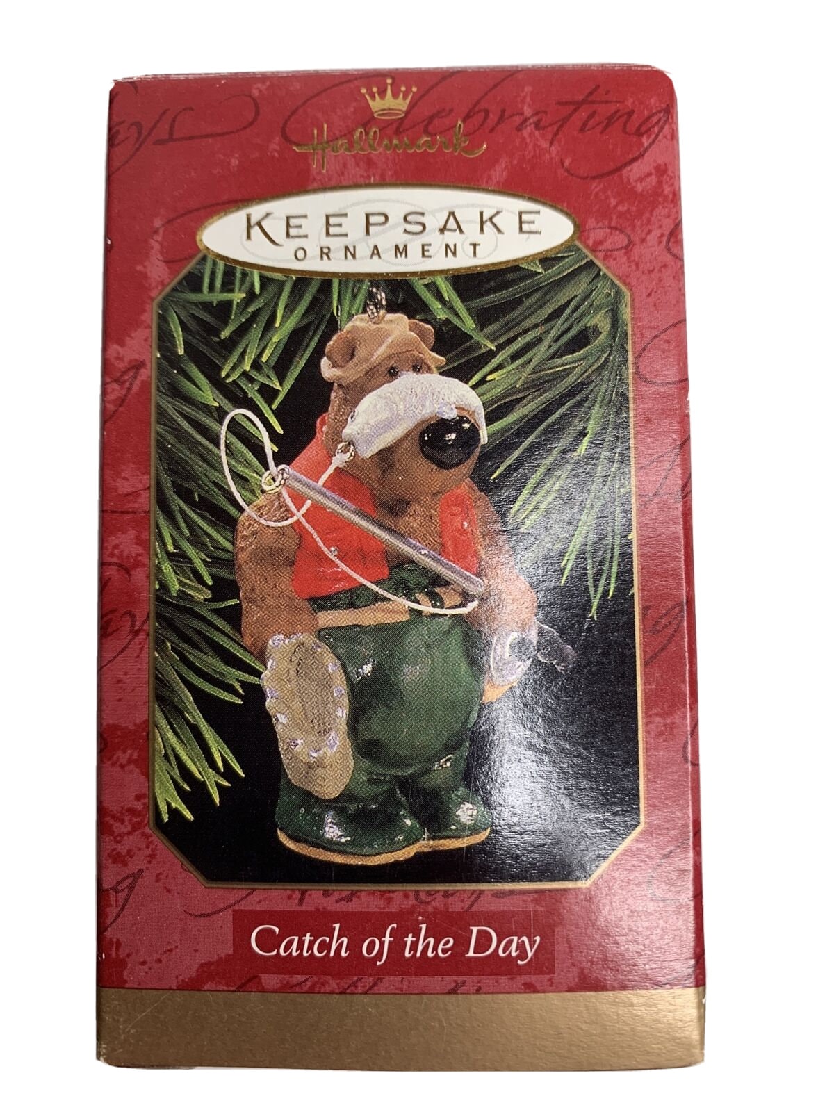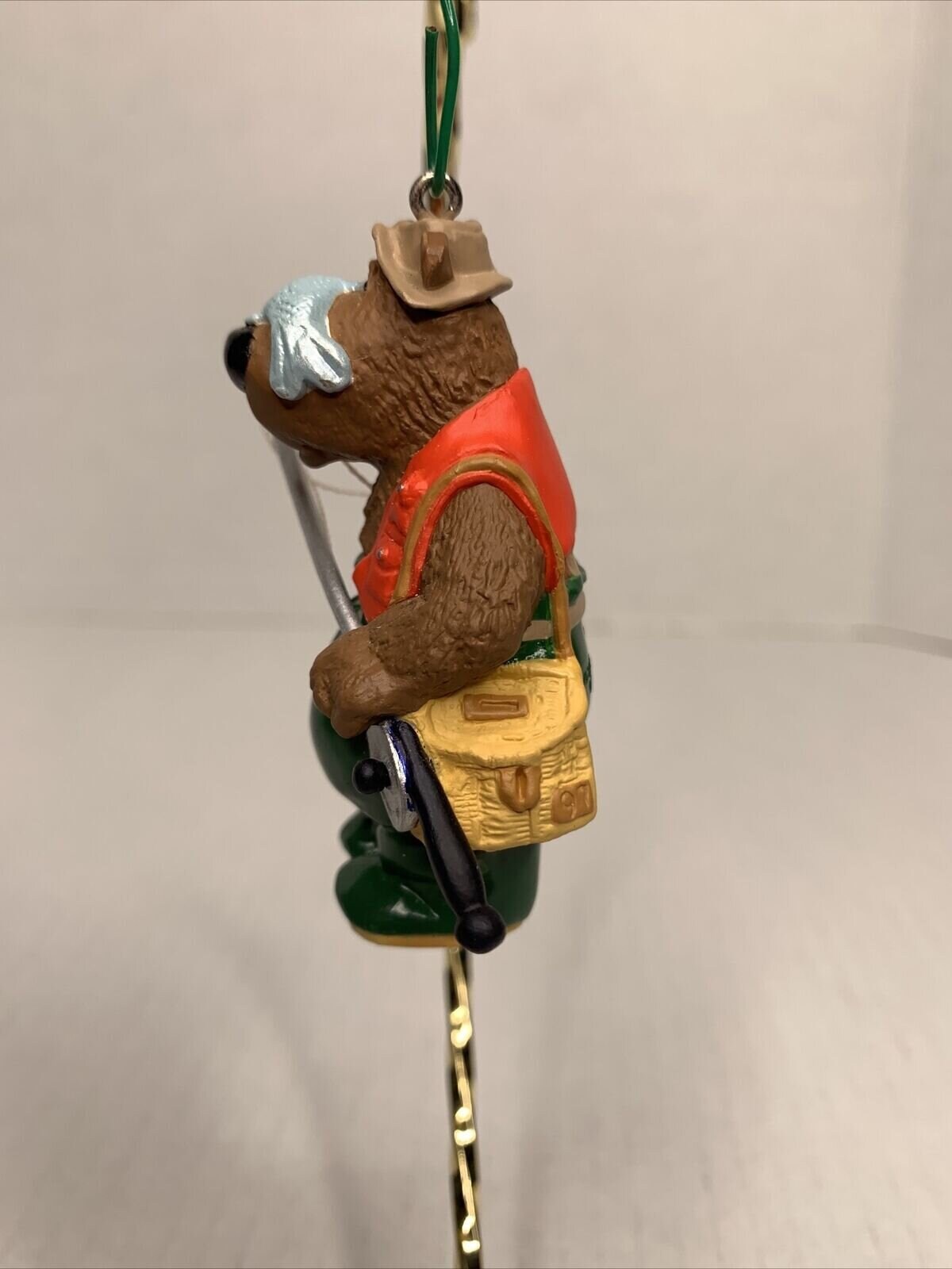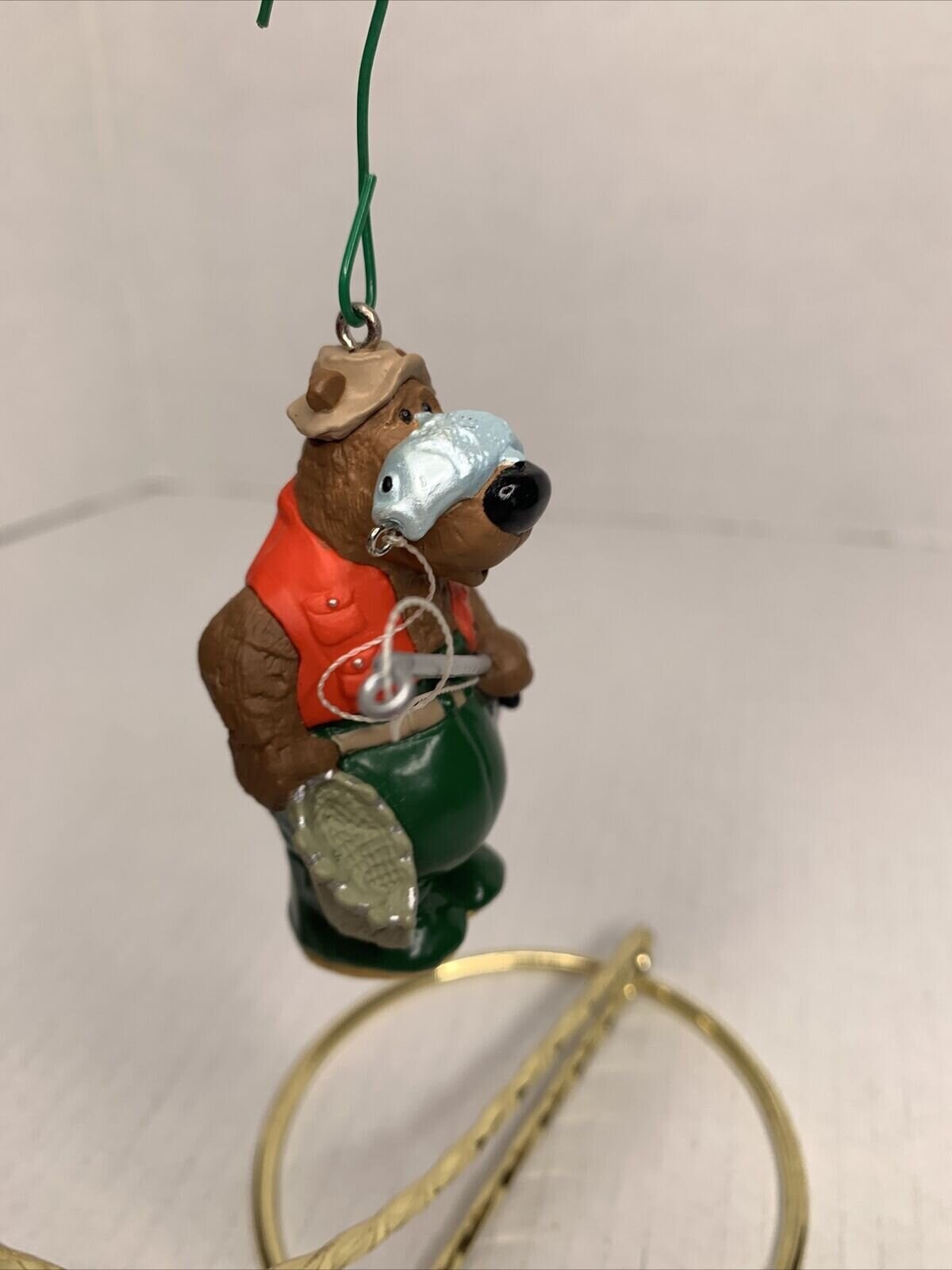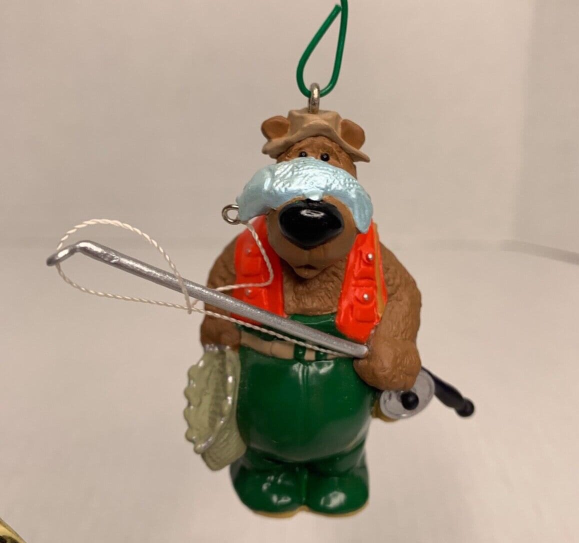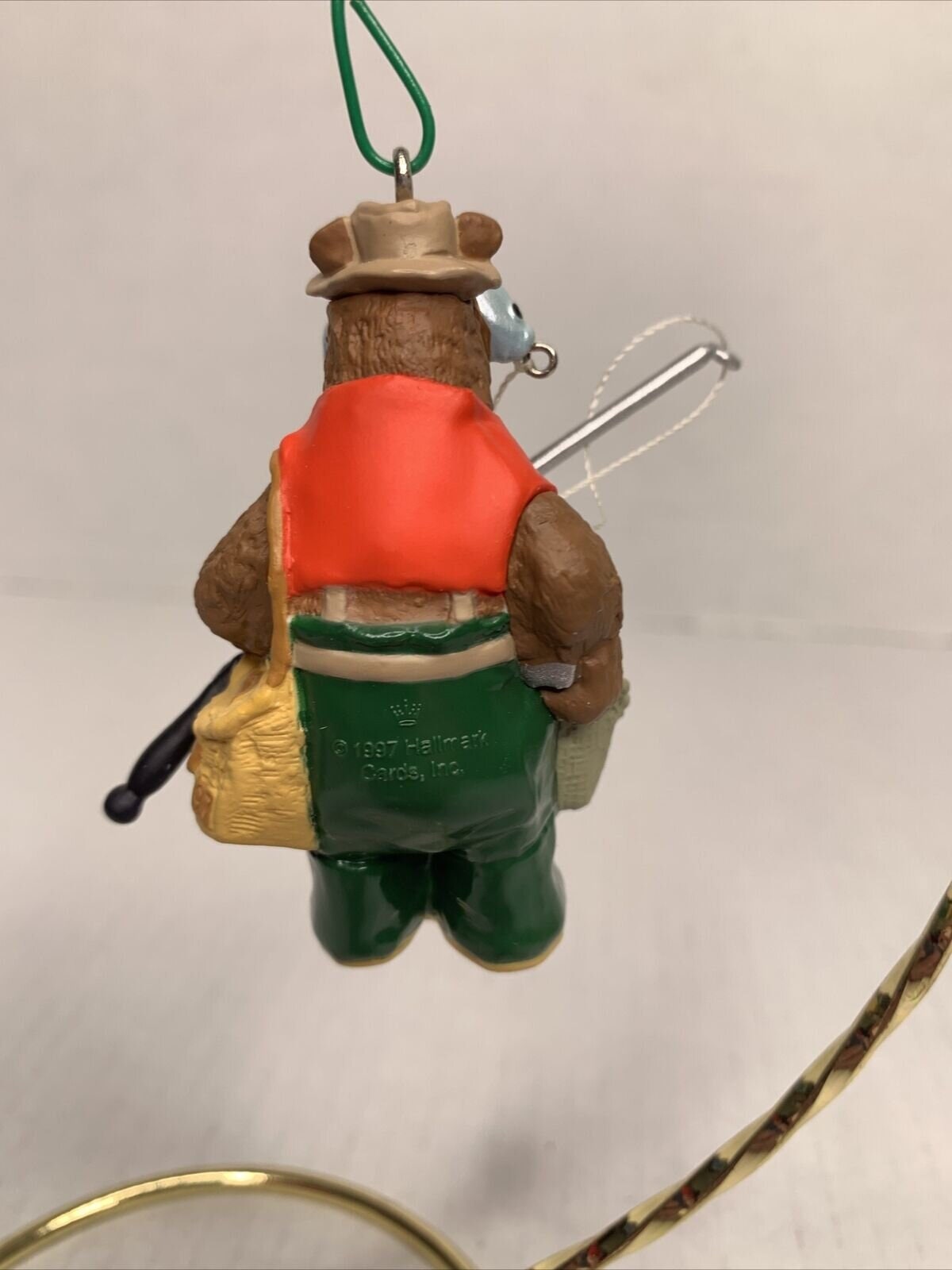 It features a brown bear with a fishing pole and a fish that somehow ended up on his nose!