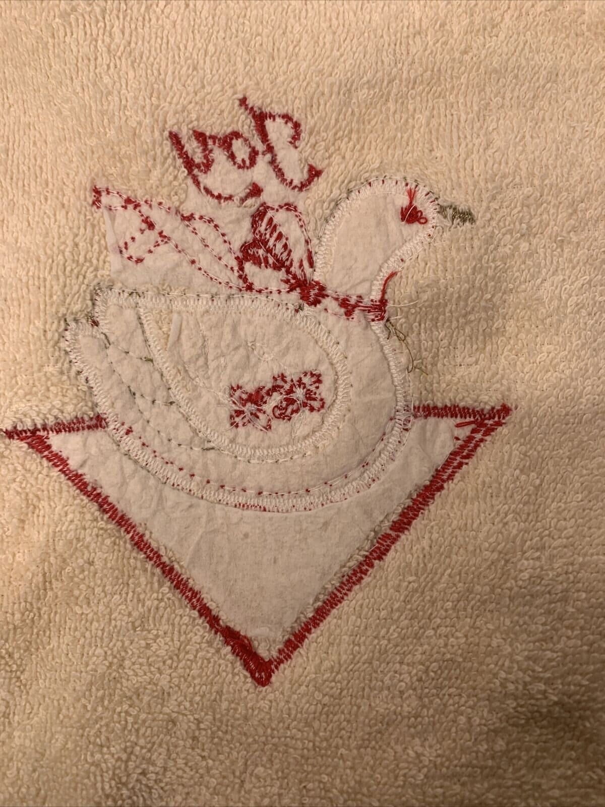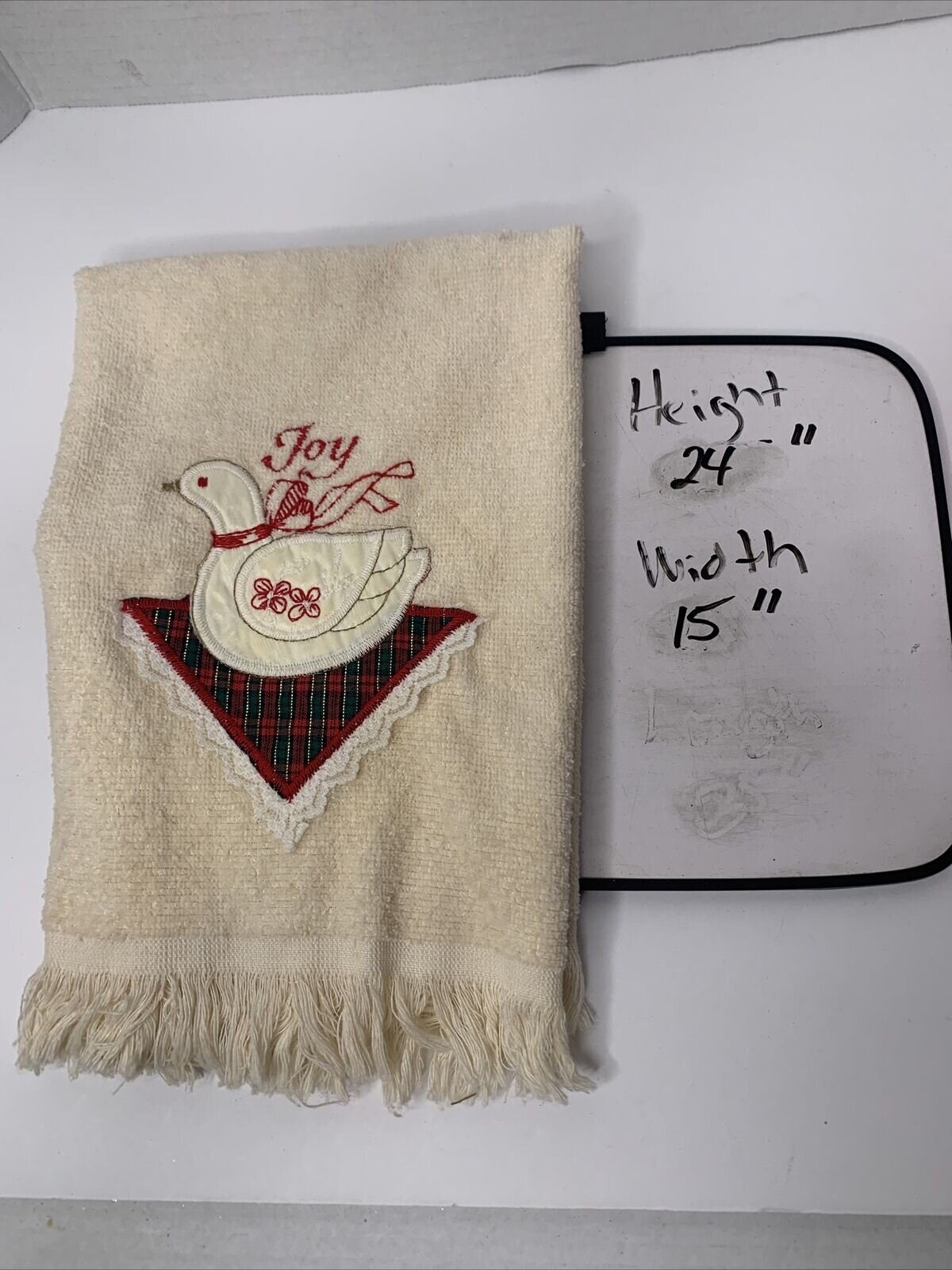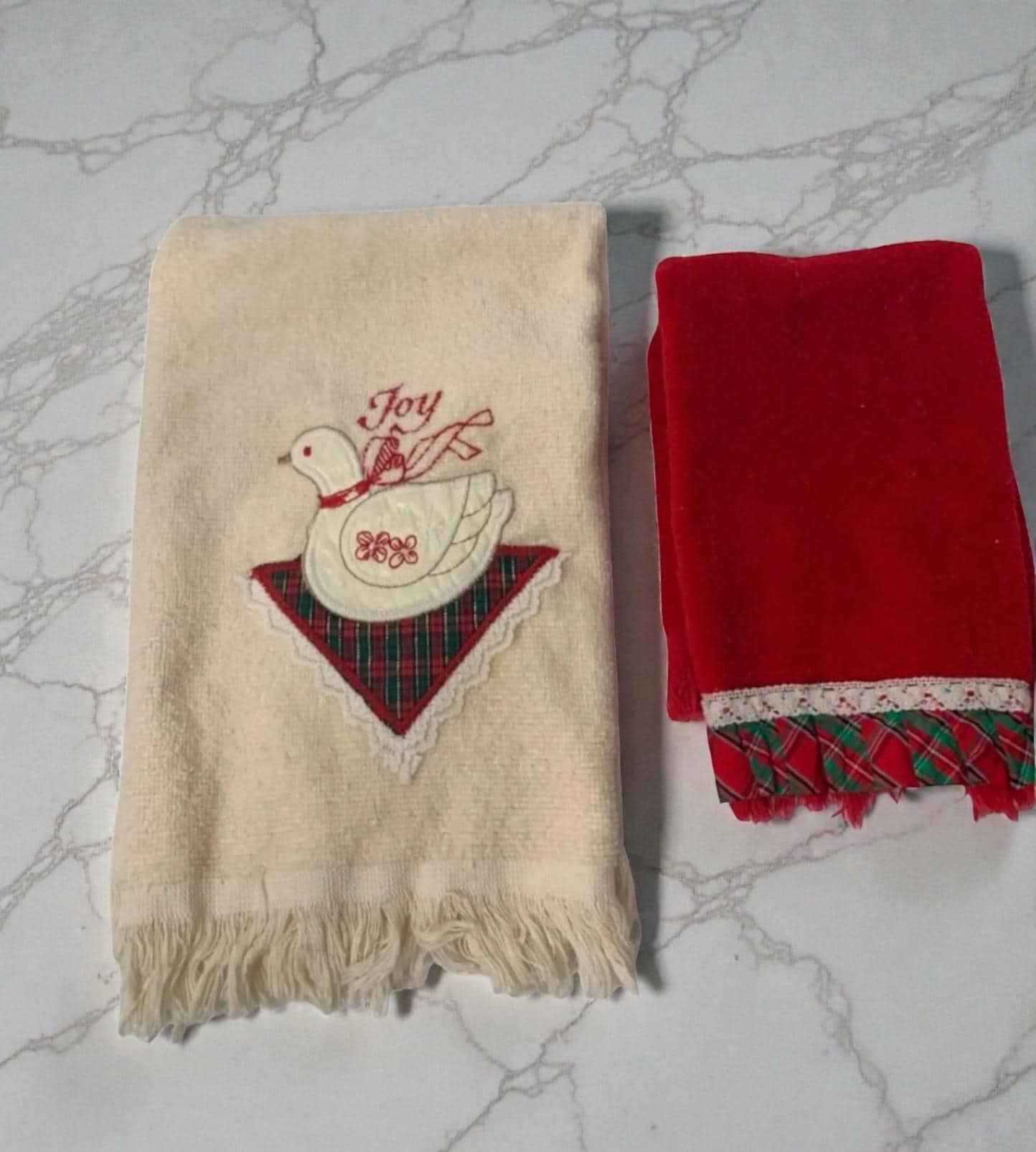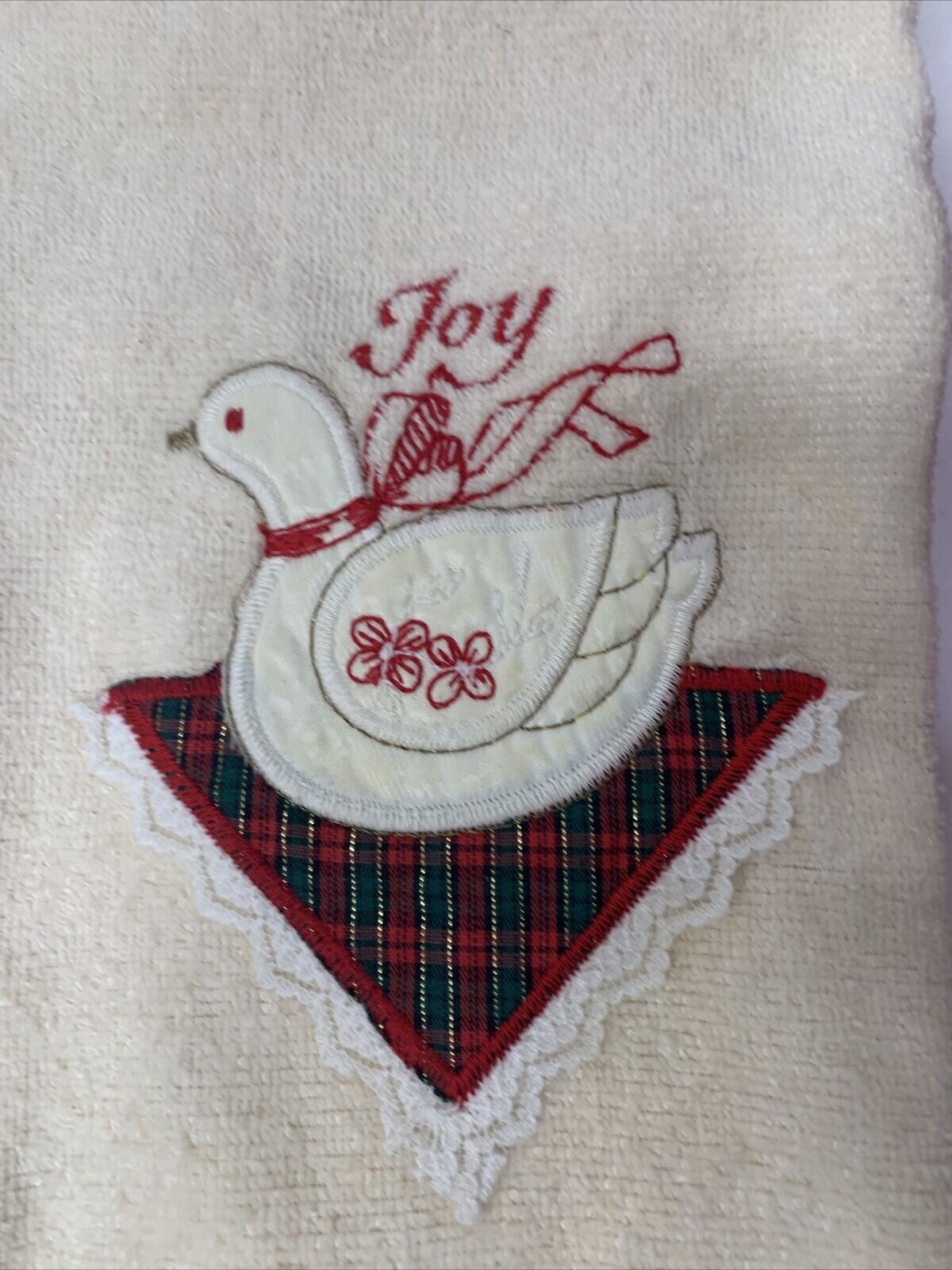 One white towel with green and red plaid accents and white lace trim with embroidered bird/dove wearing a red ribbon and the word "Joy" embroidered above it.