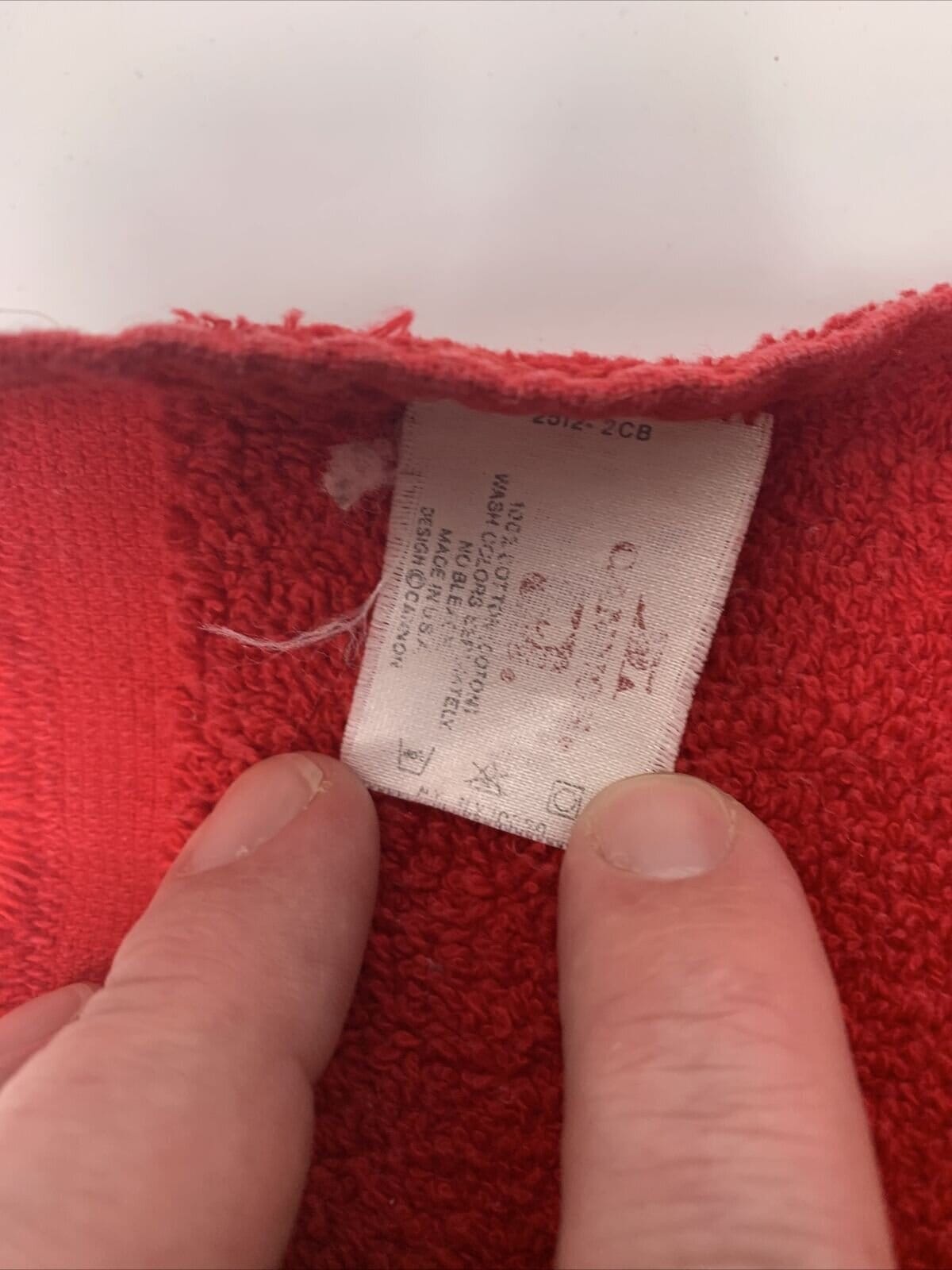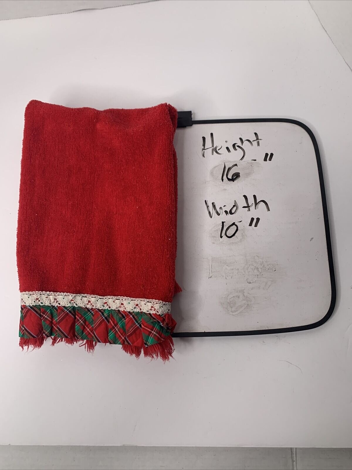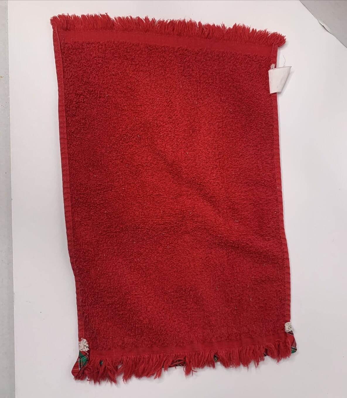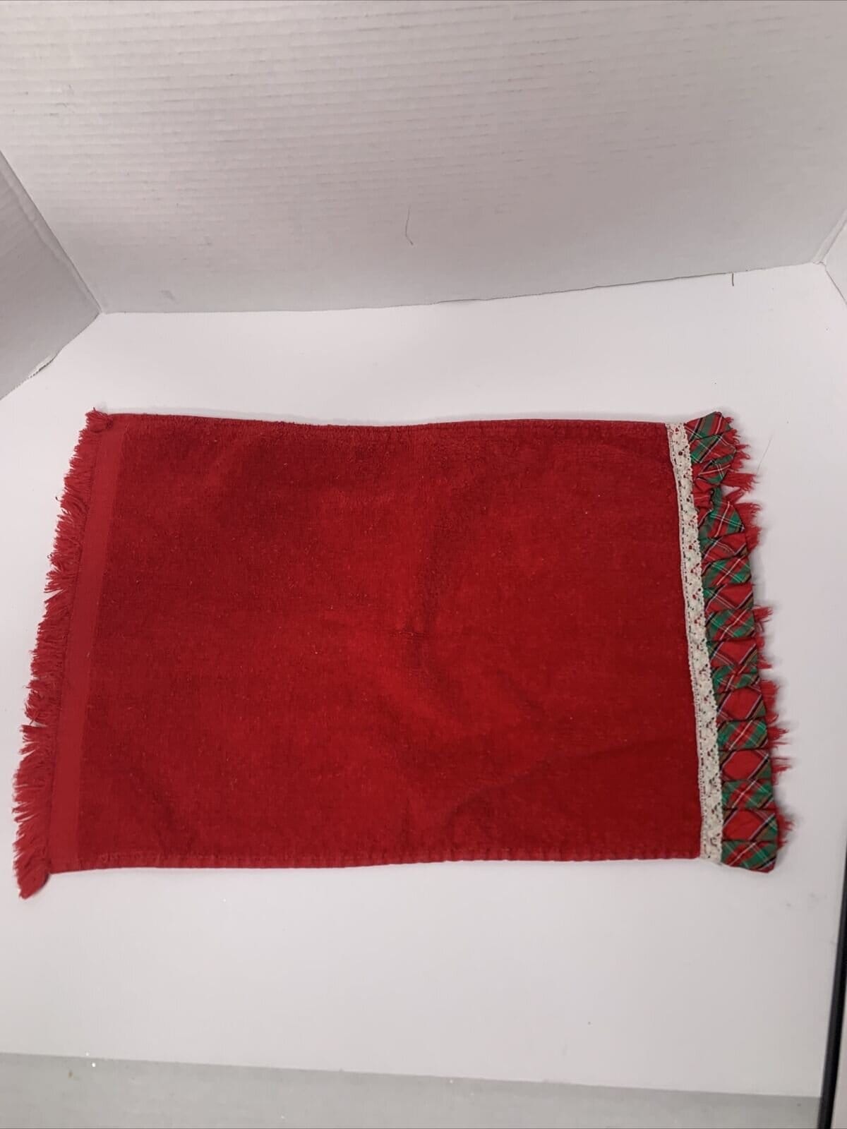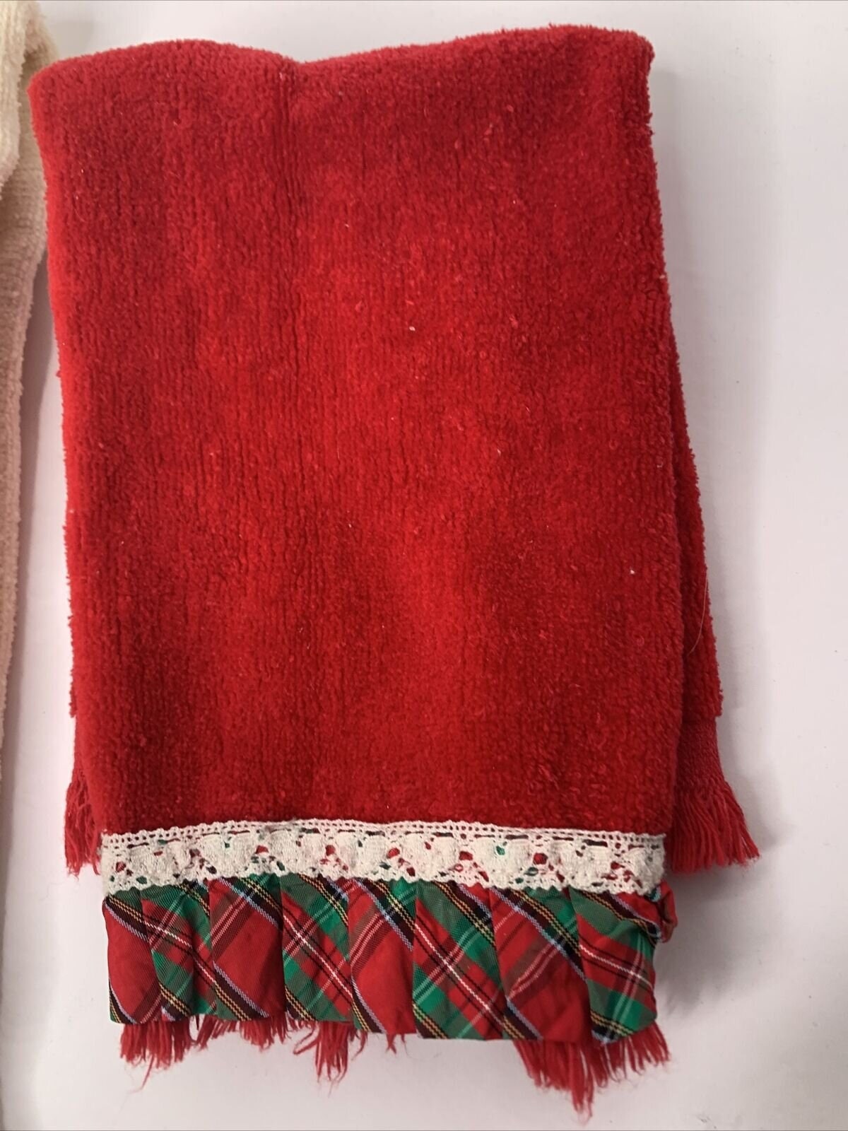 One red hand towel with matching green and red plaid accents and white lace trim.