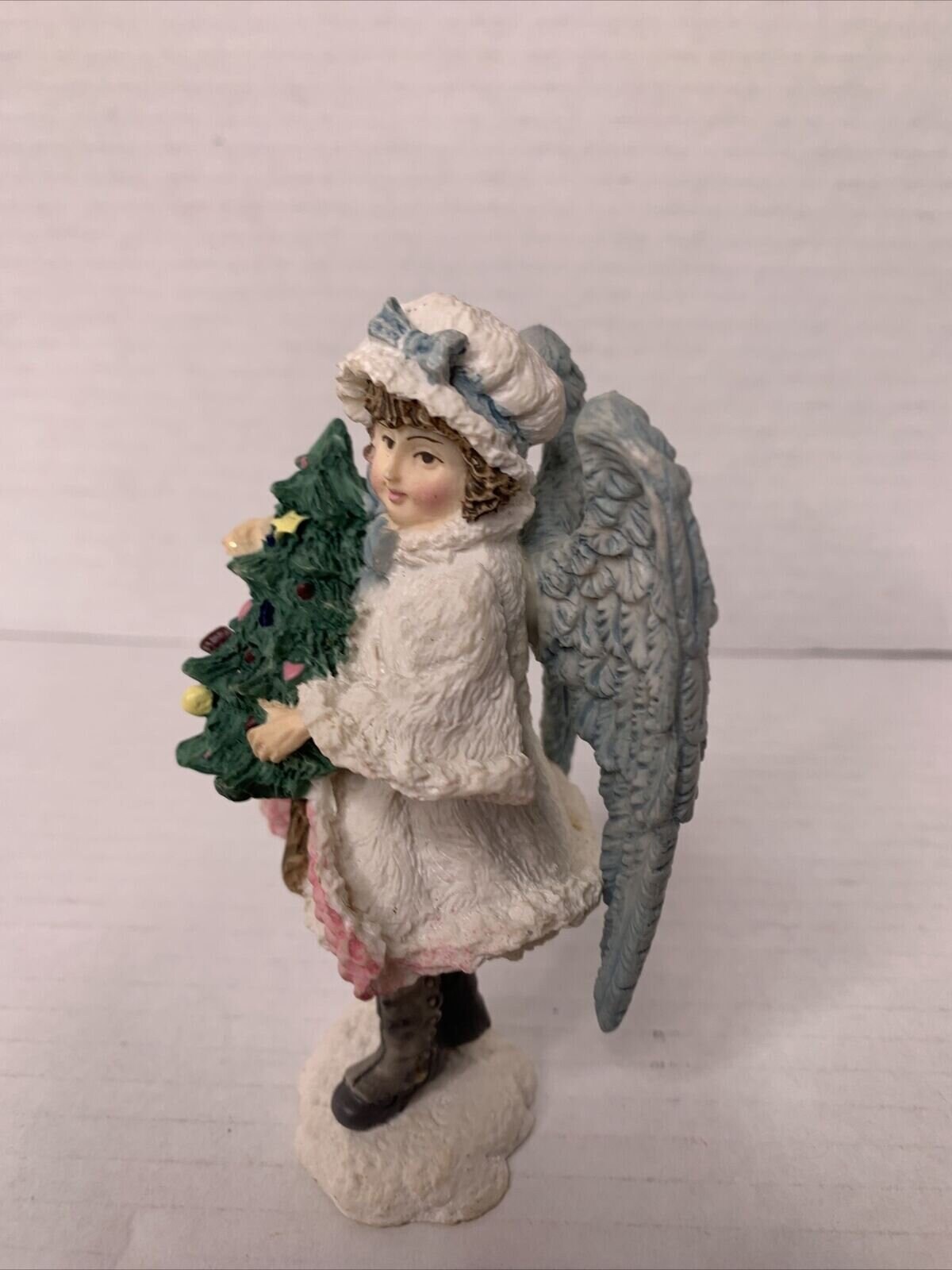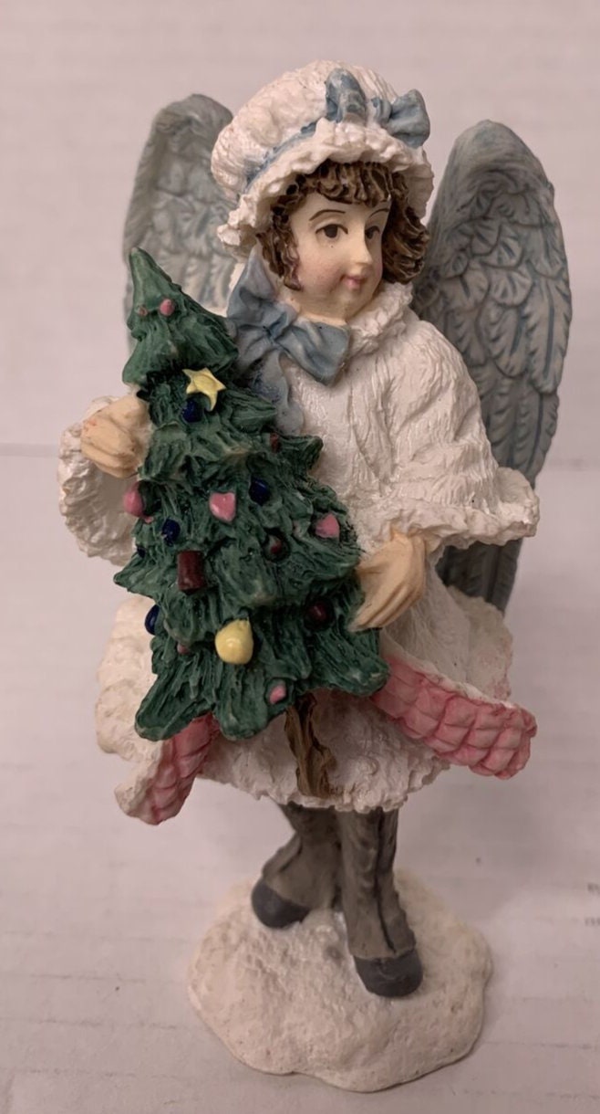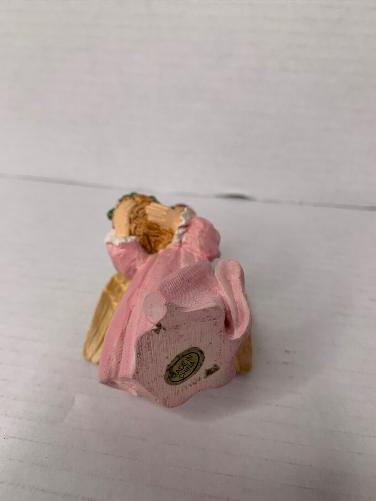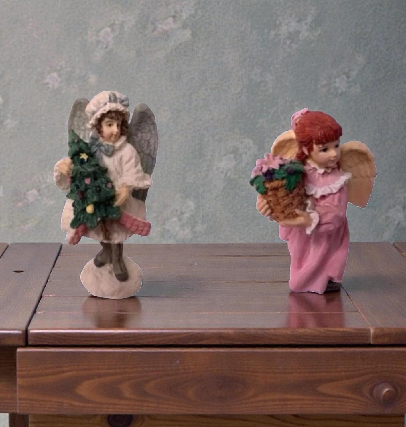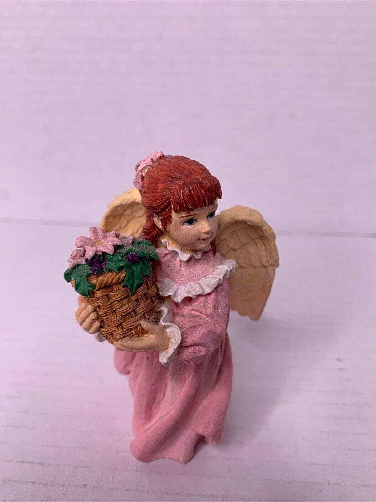 One is dressed in pink and holding a basket of flowers (unbranded but very similar in style to the other angel).