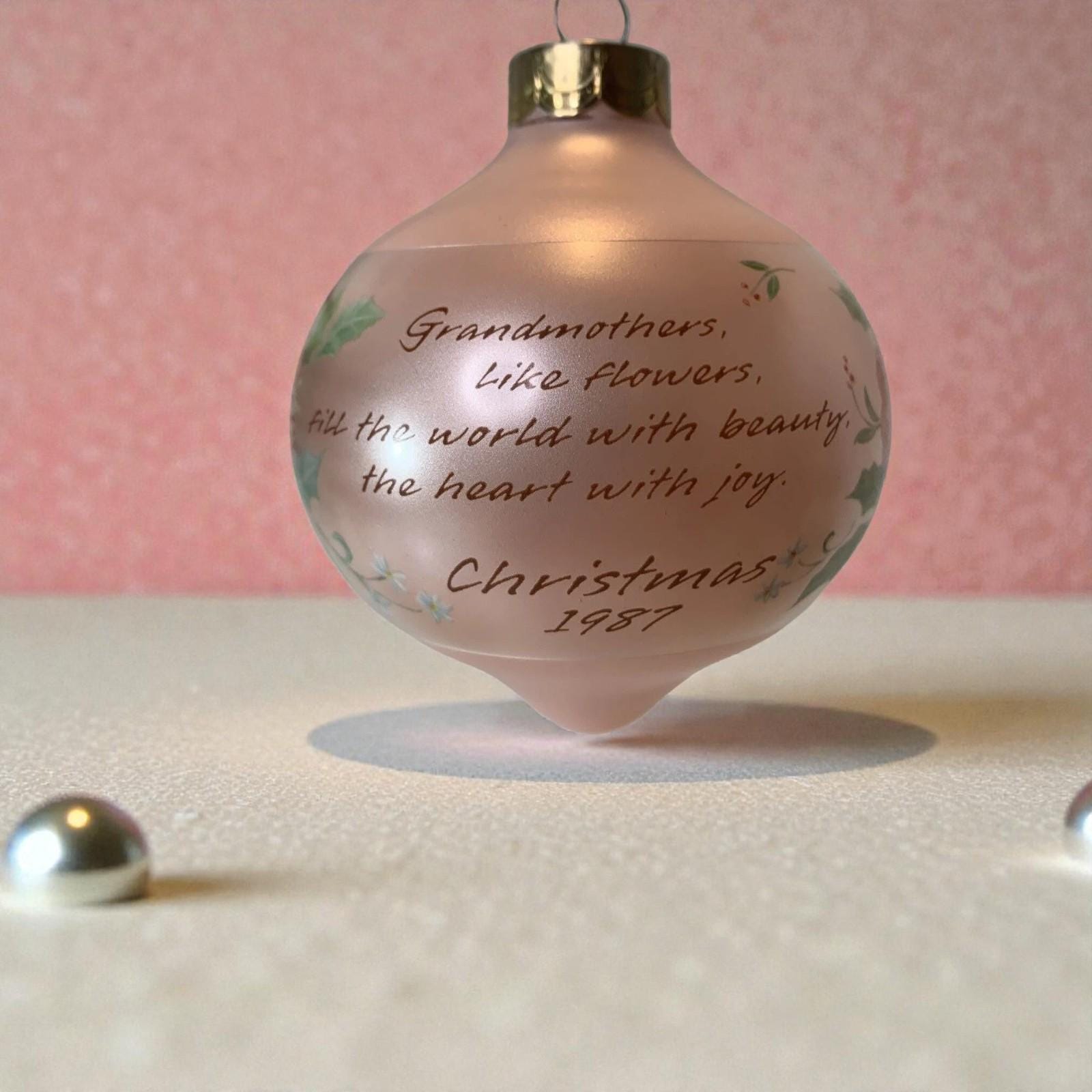 Features a floral pattern inscribed with "Grandmother, like flowers, fill the world with beauty, the heart with joy."
