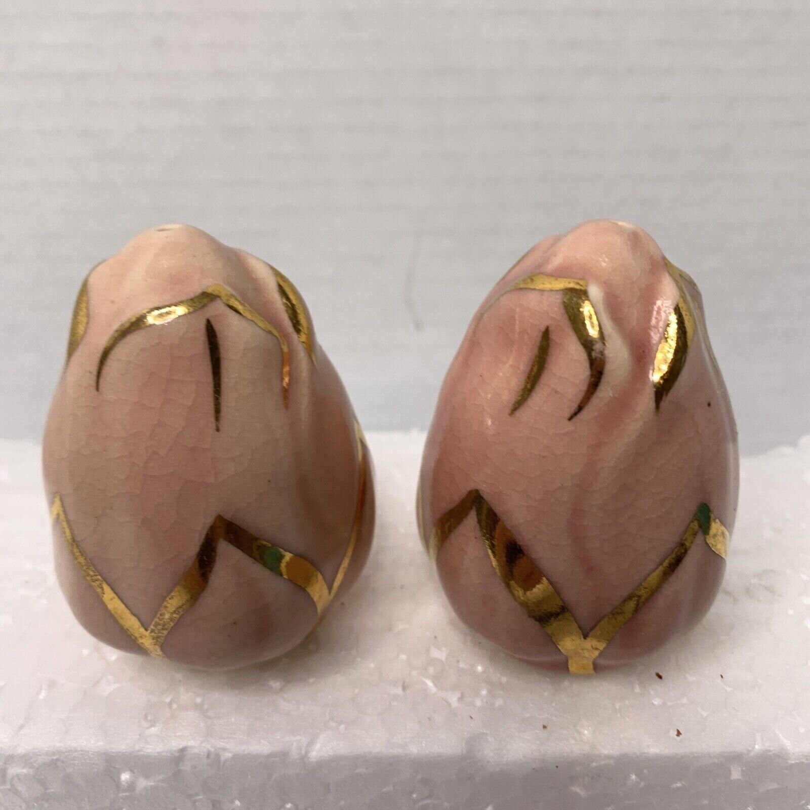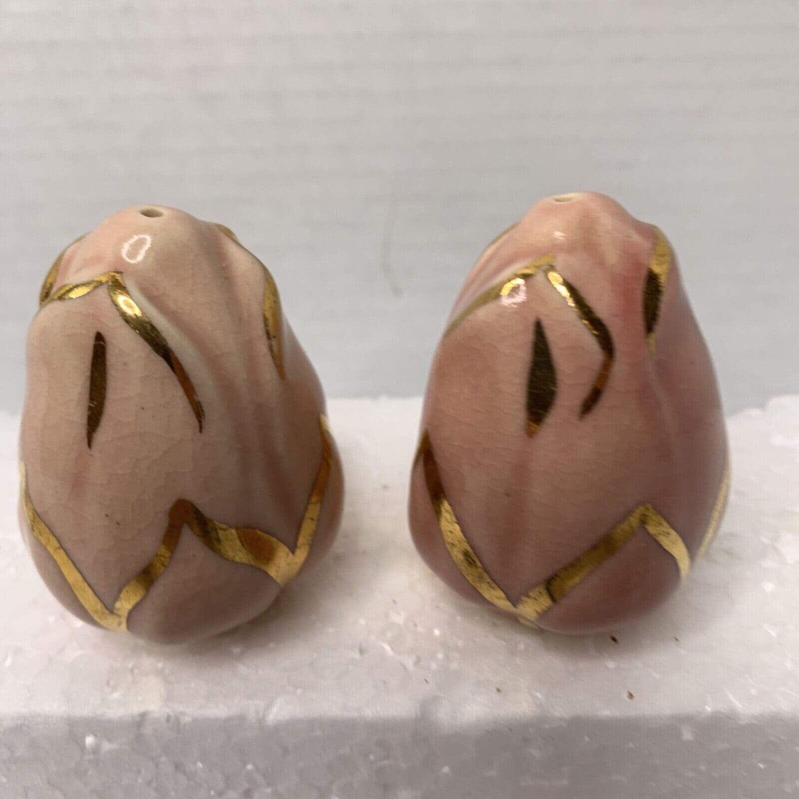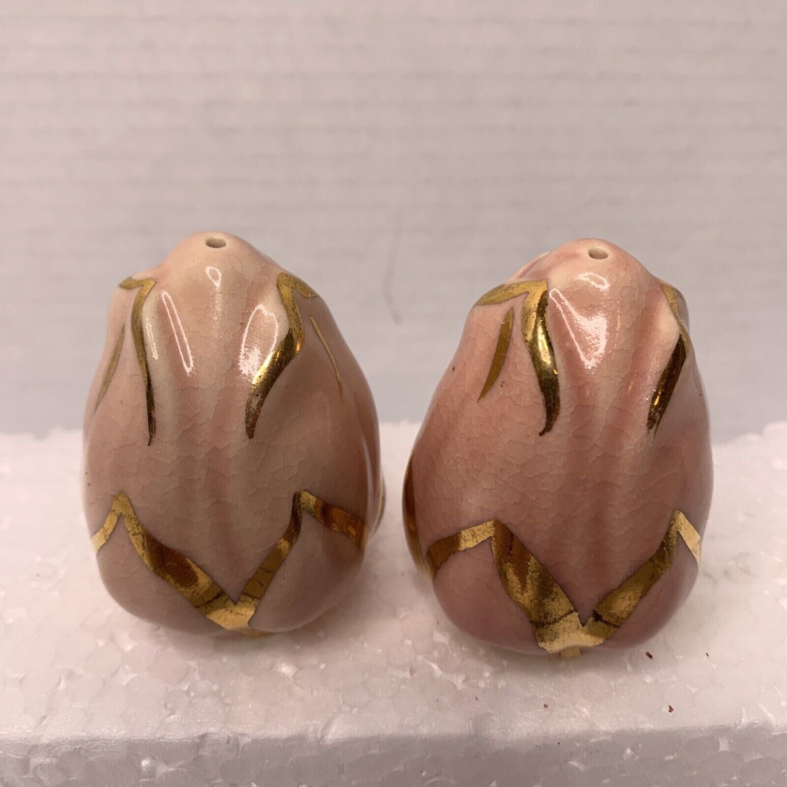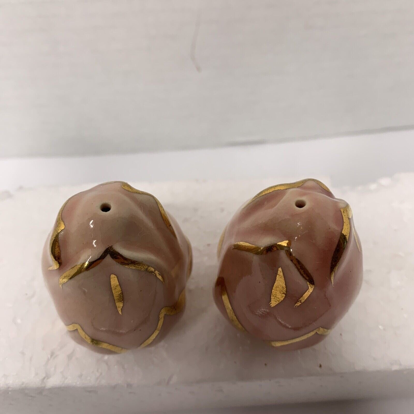 Vintage Mid-Century Modern Ceramic Pink And Gold Rosebud Salt And Pepper Shakers