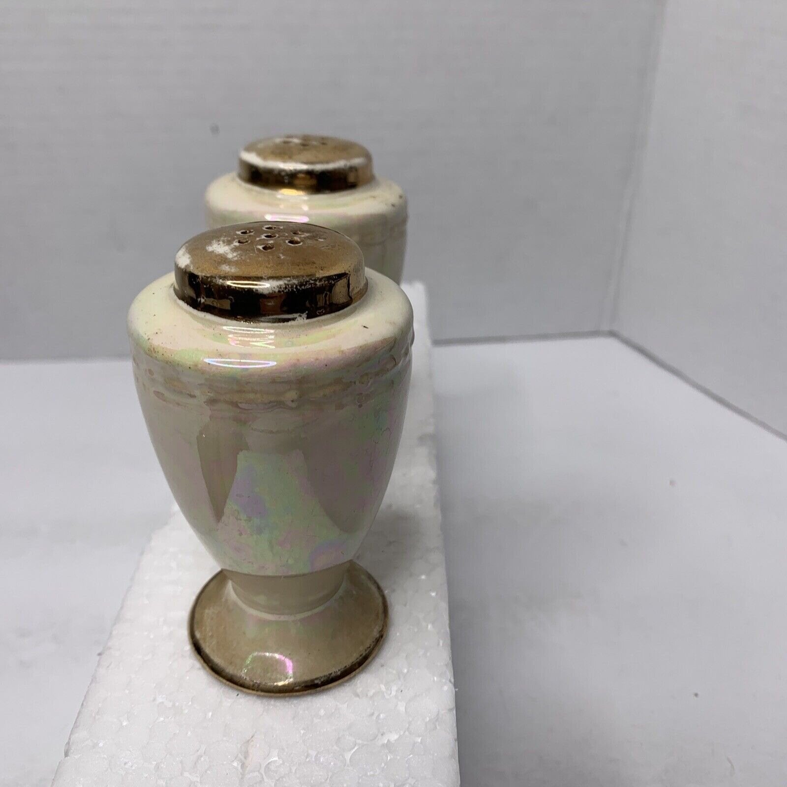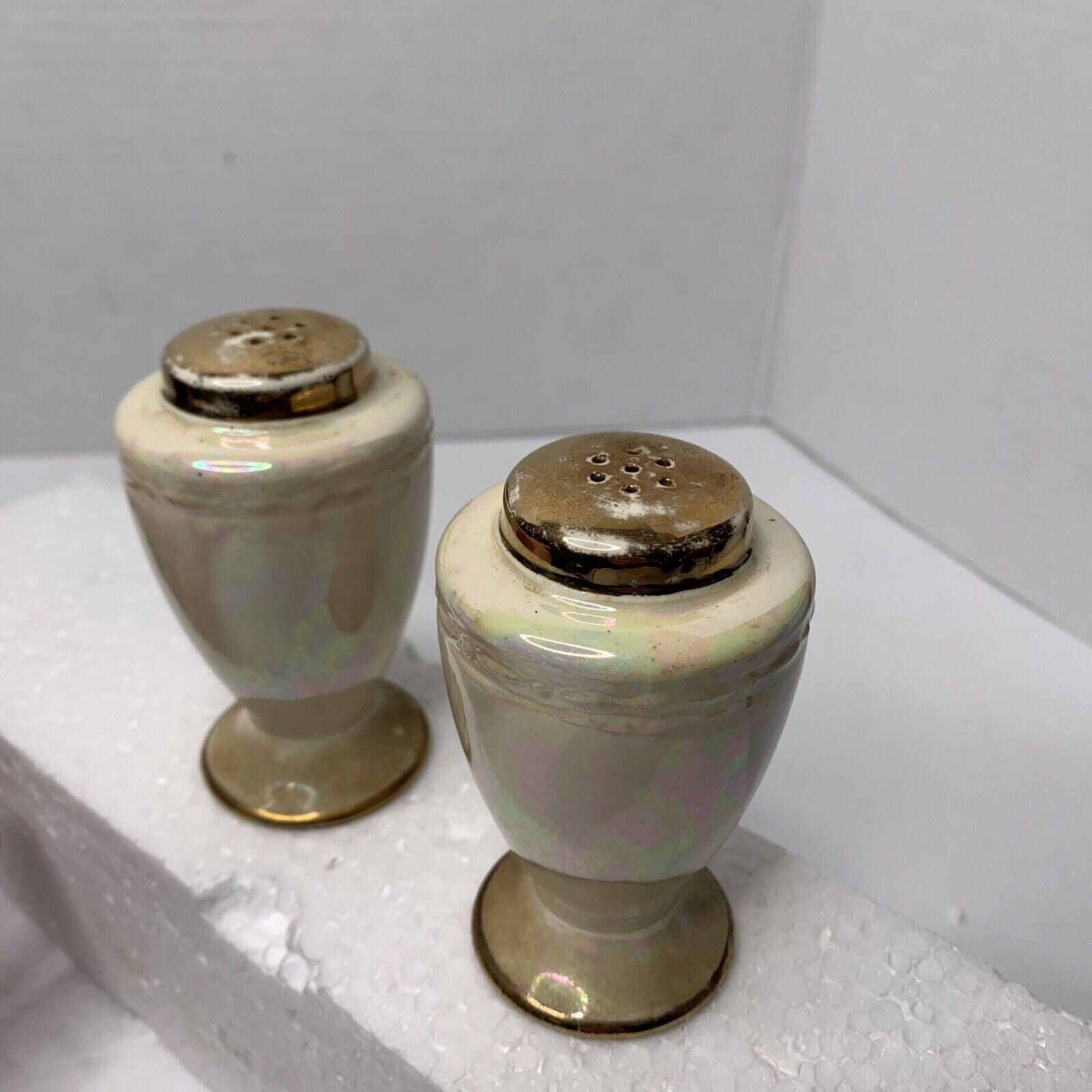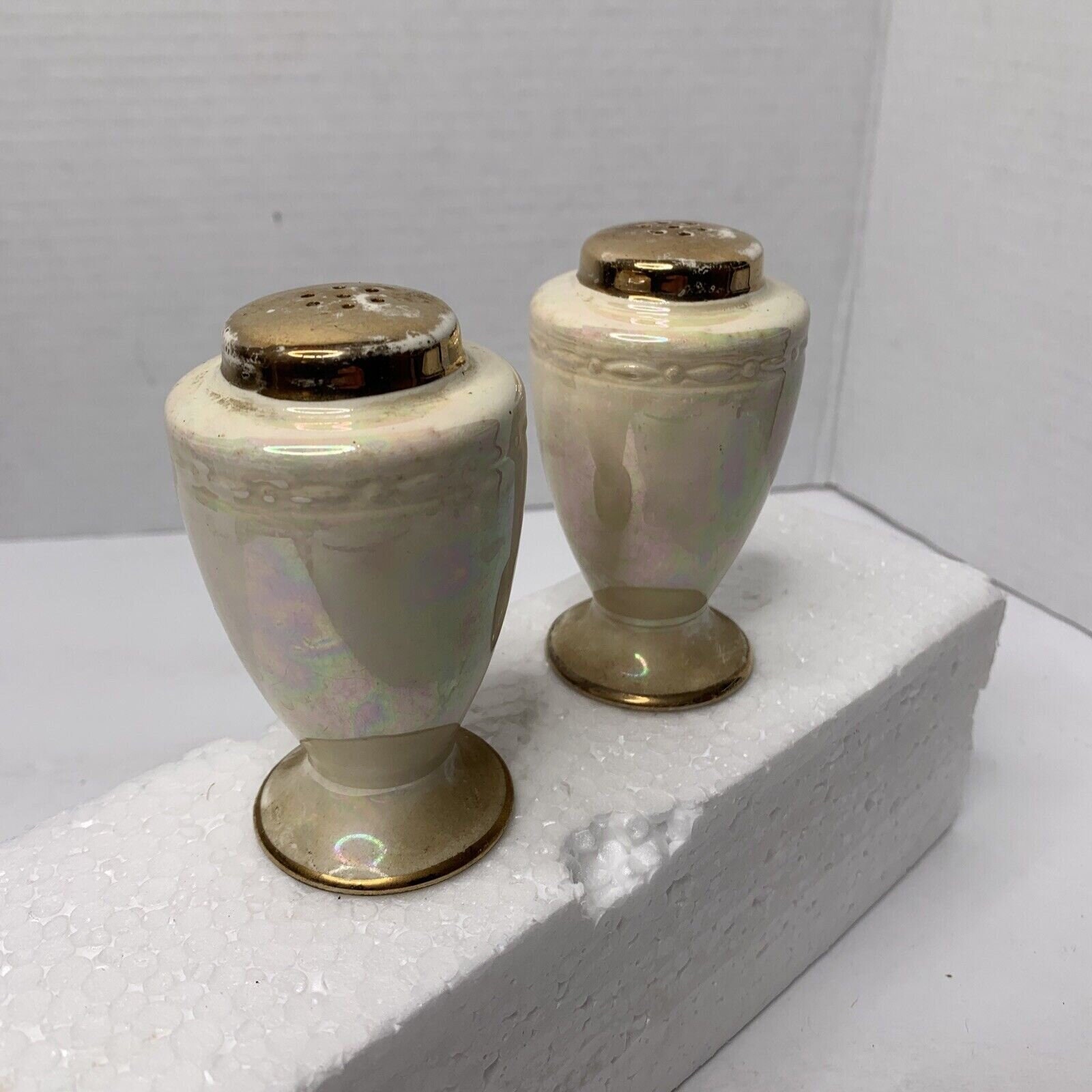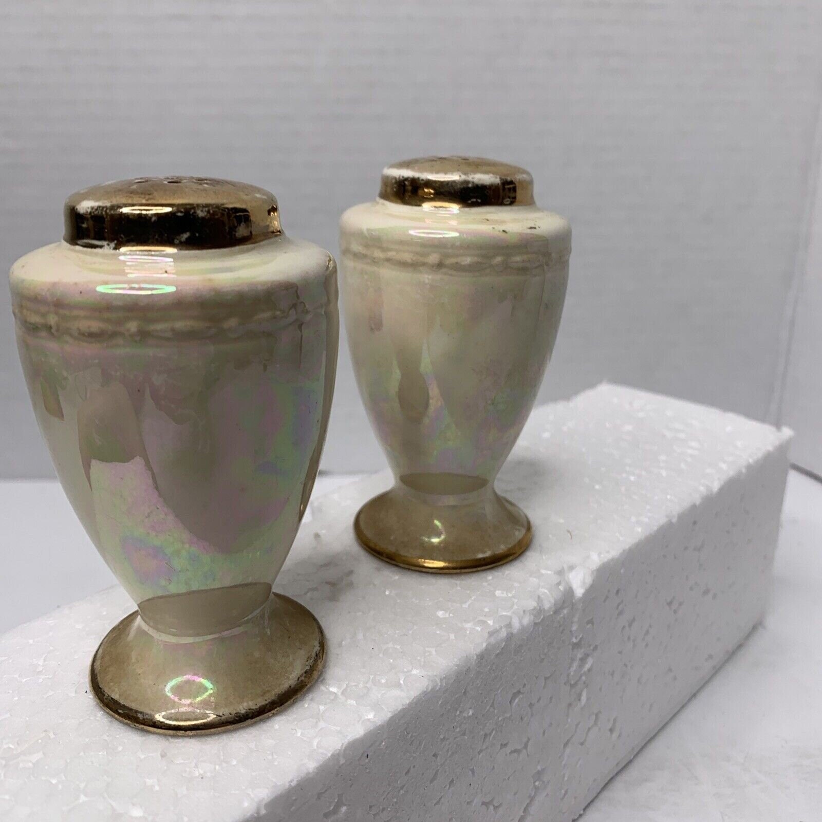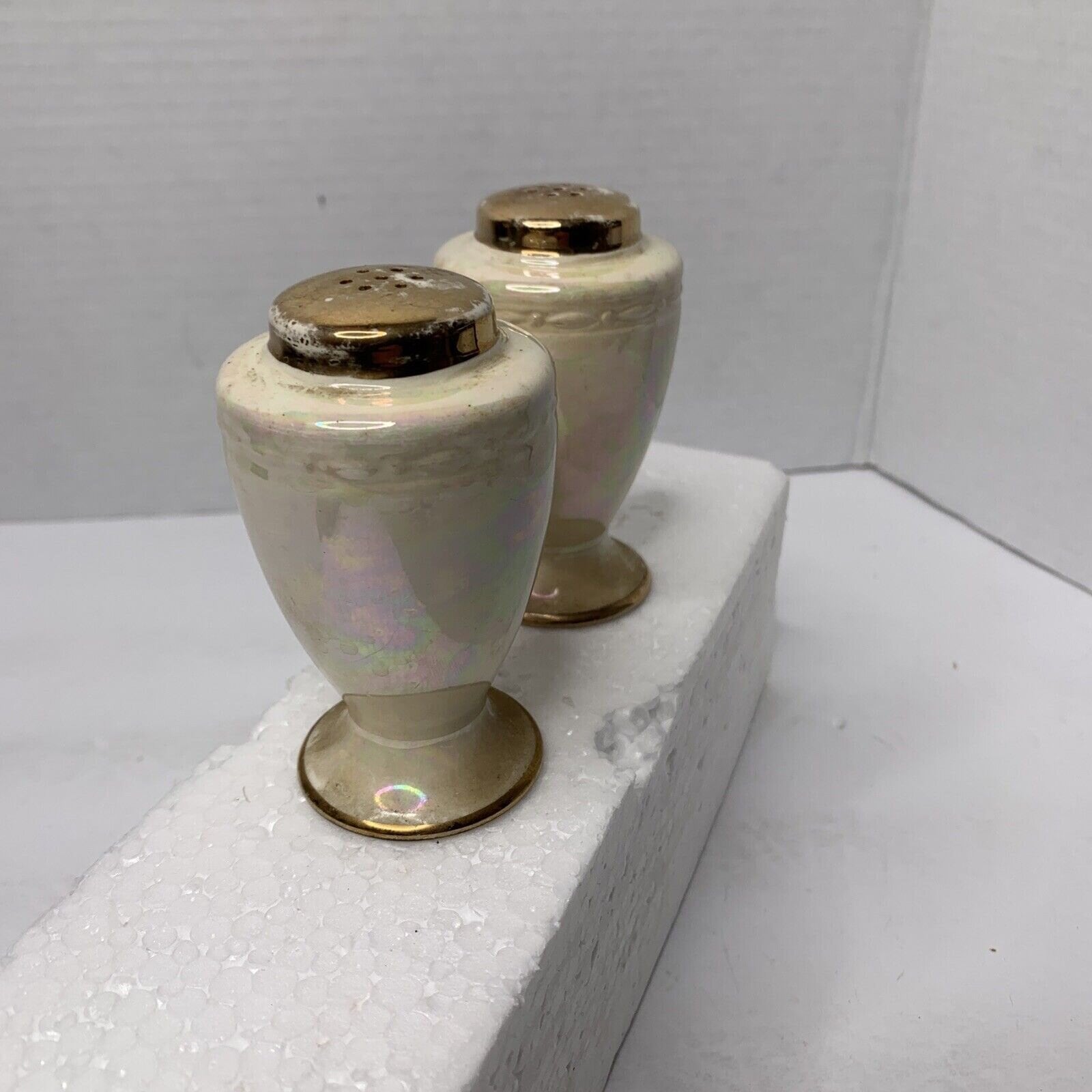 Vintage Lusterware Ceramic Salt And Pepper Shakers Iridescent Pearl White With Gold Accents