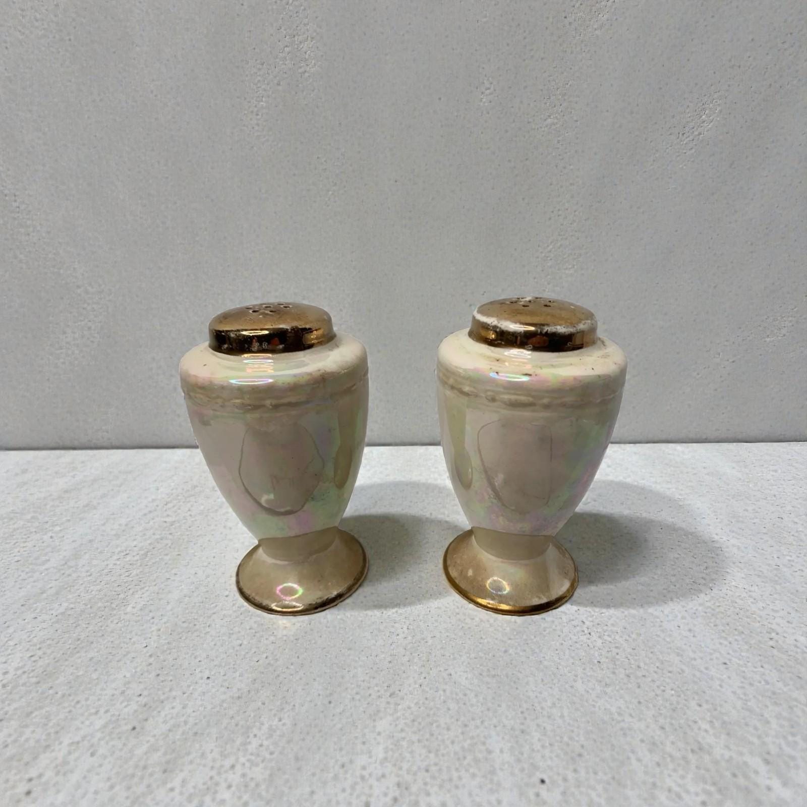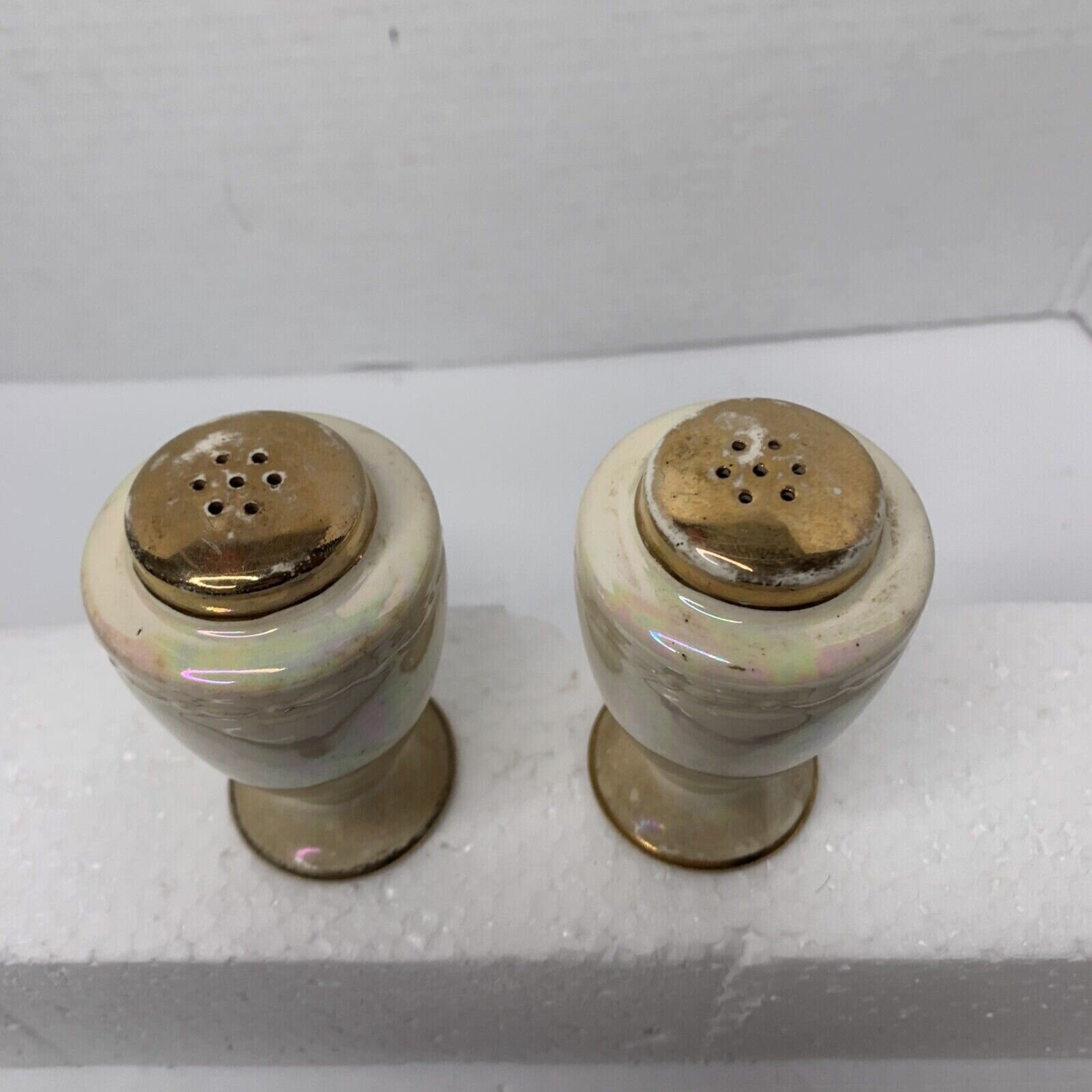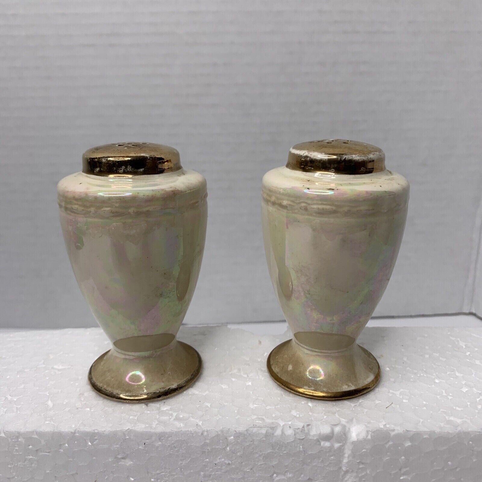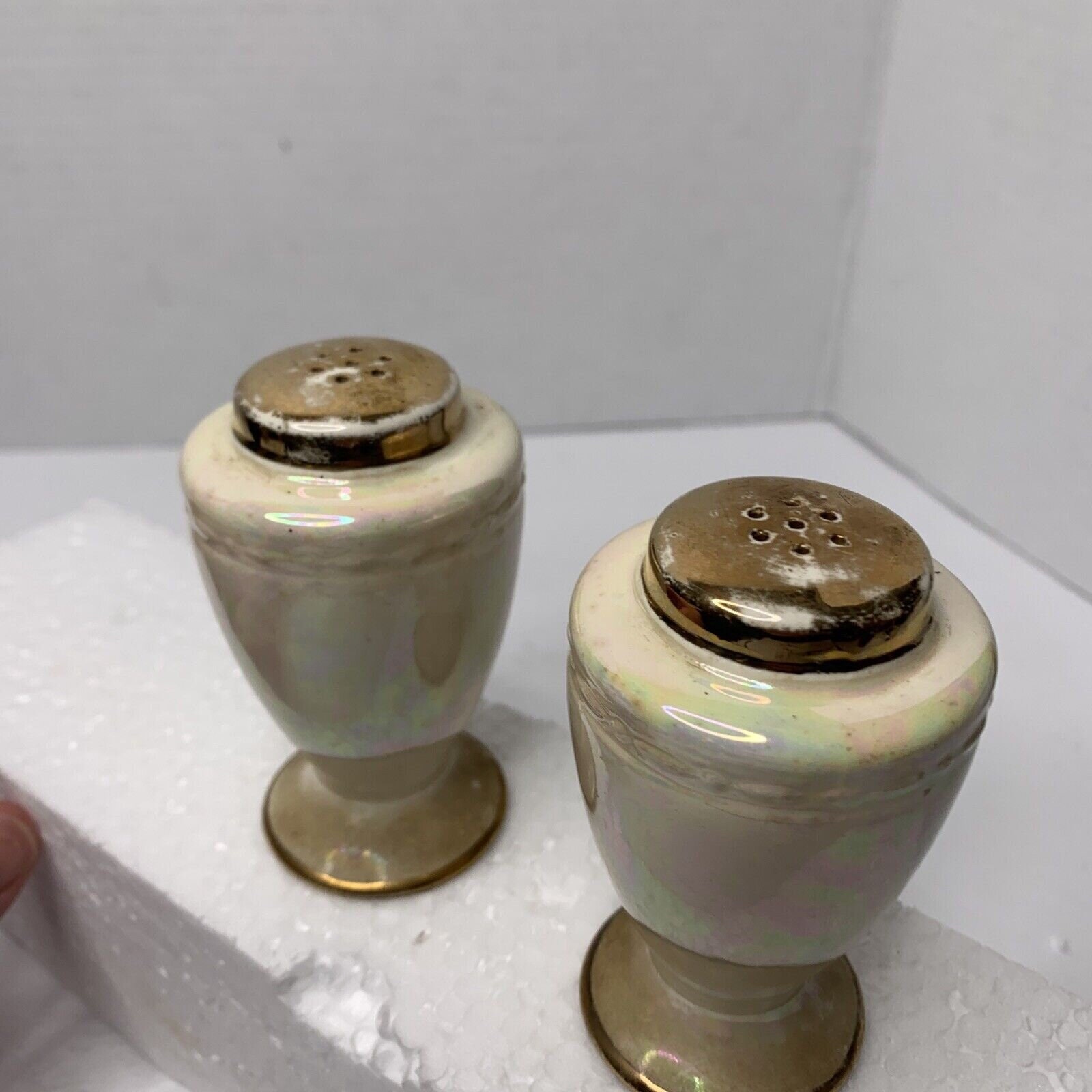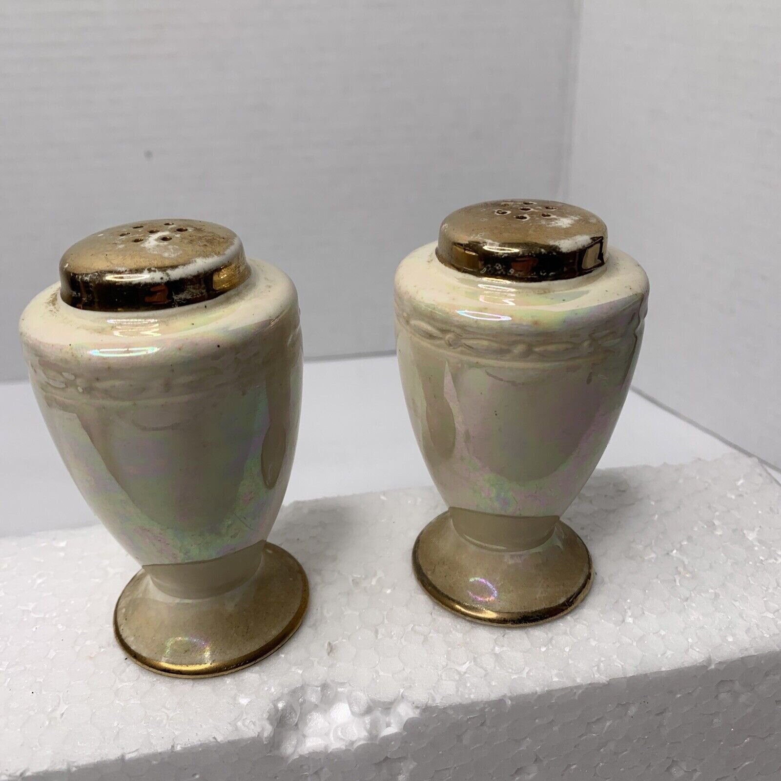 Vintage Lusterware Ceramic Salt And Pepper Shakers Iridescent Pearl White With Gold Accents