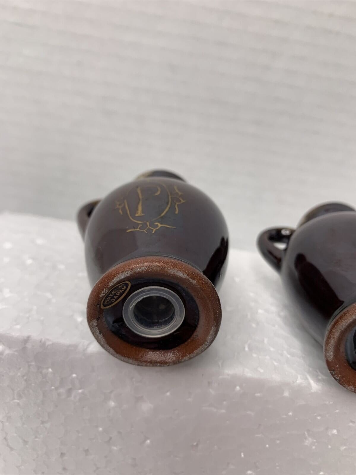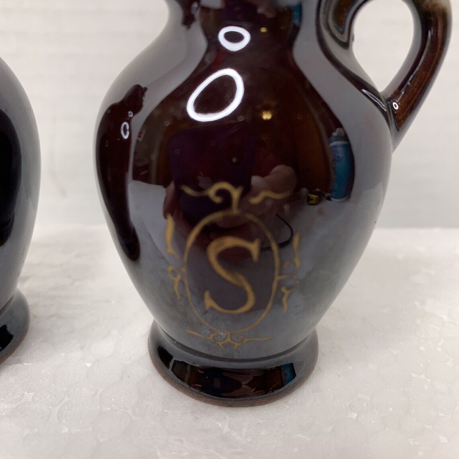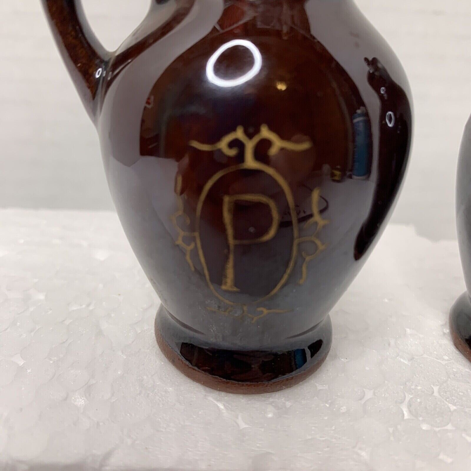 Teapot-shaped shakers with a glossy finish and painted antique gold designs with the letters "S" and "P" on them. They have plastic stoppers.
