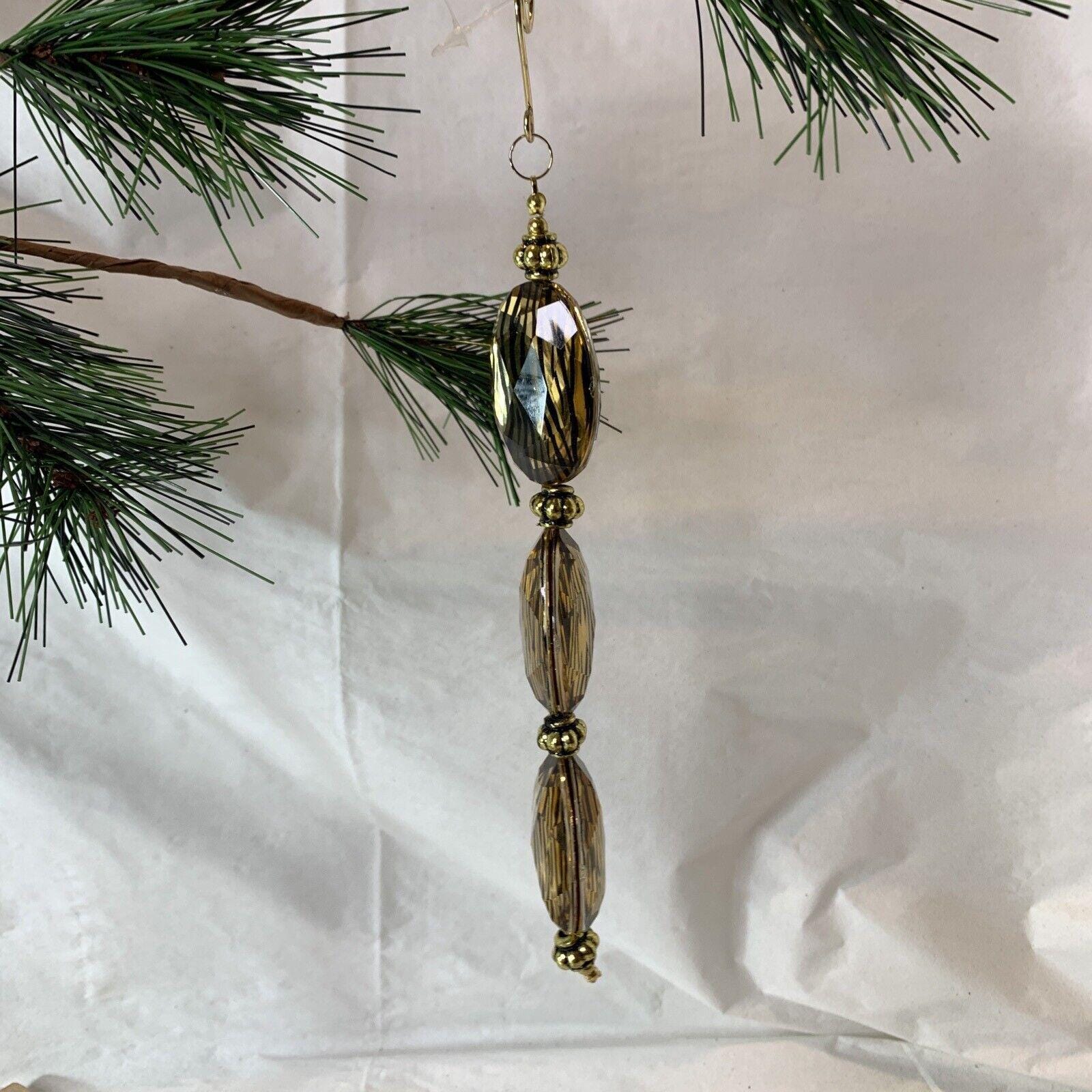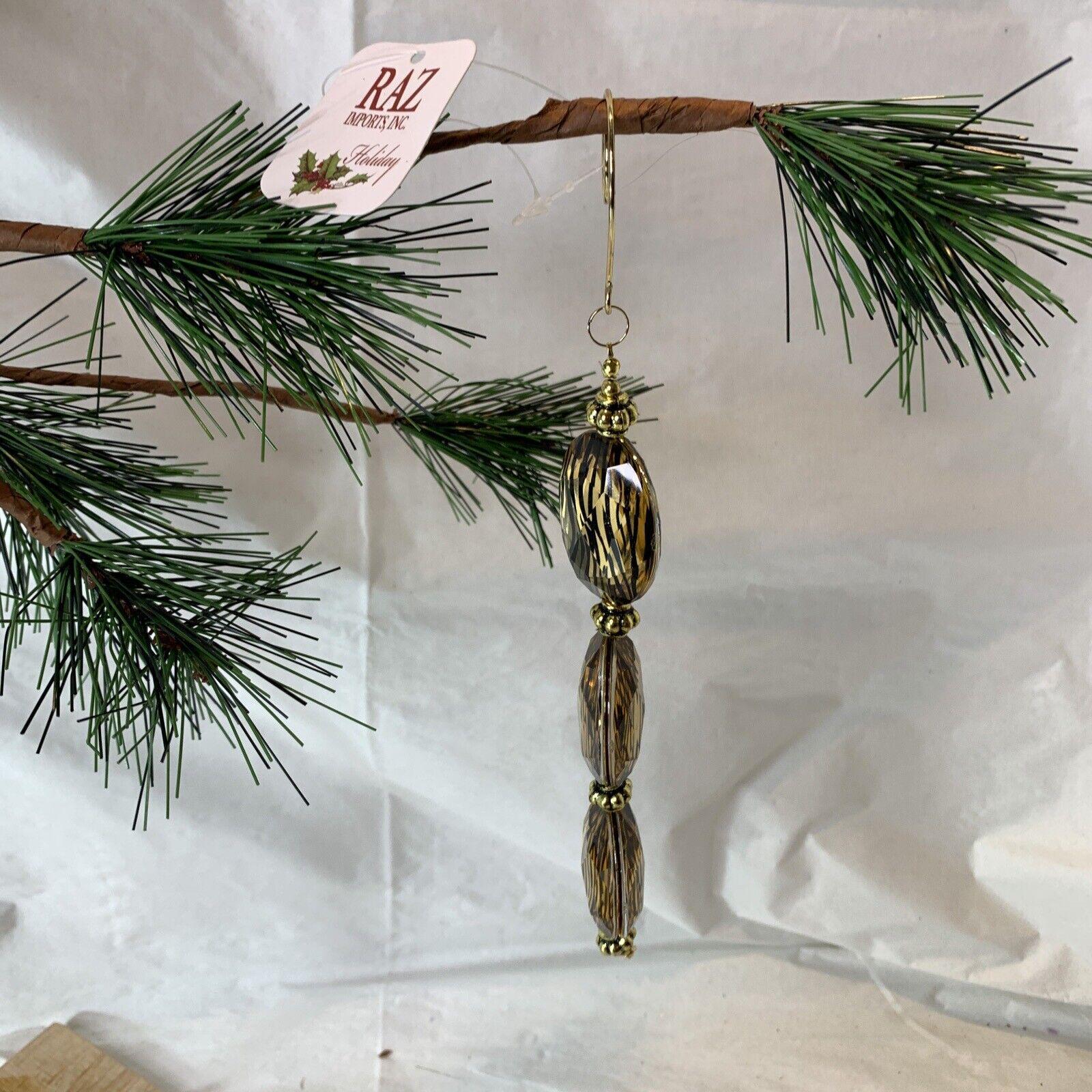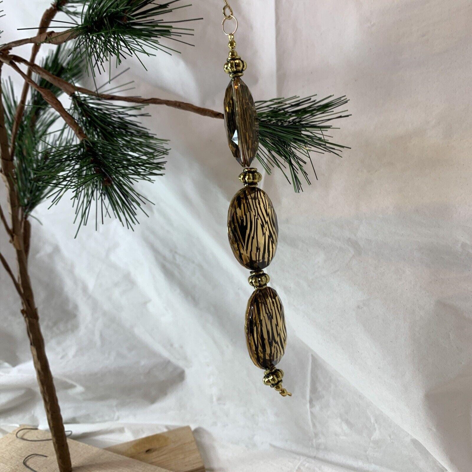 Three gold round reflective beads with a zebra stripe pattern, dangling ornament with accent beads between each large bead. A spiral-shaped hook hangs it from the tree. A must-have for the tiger print lover!