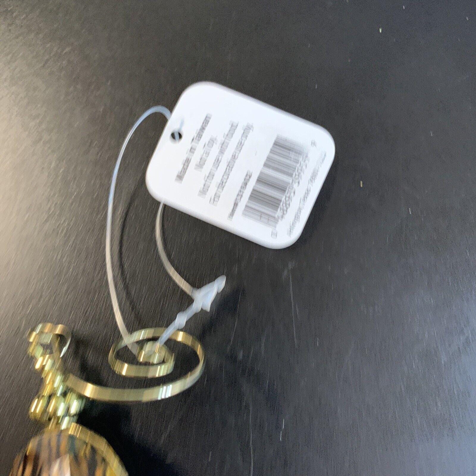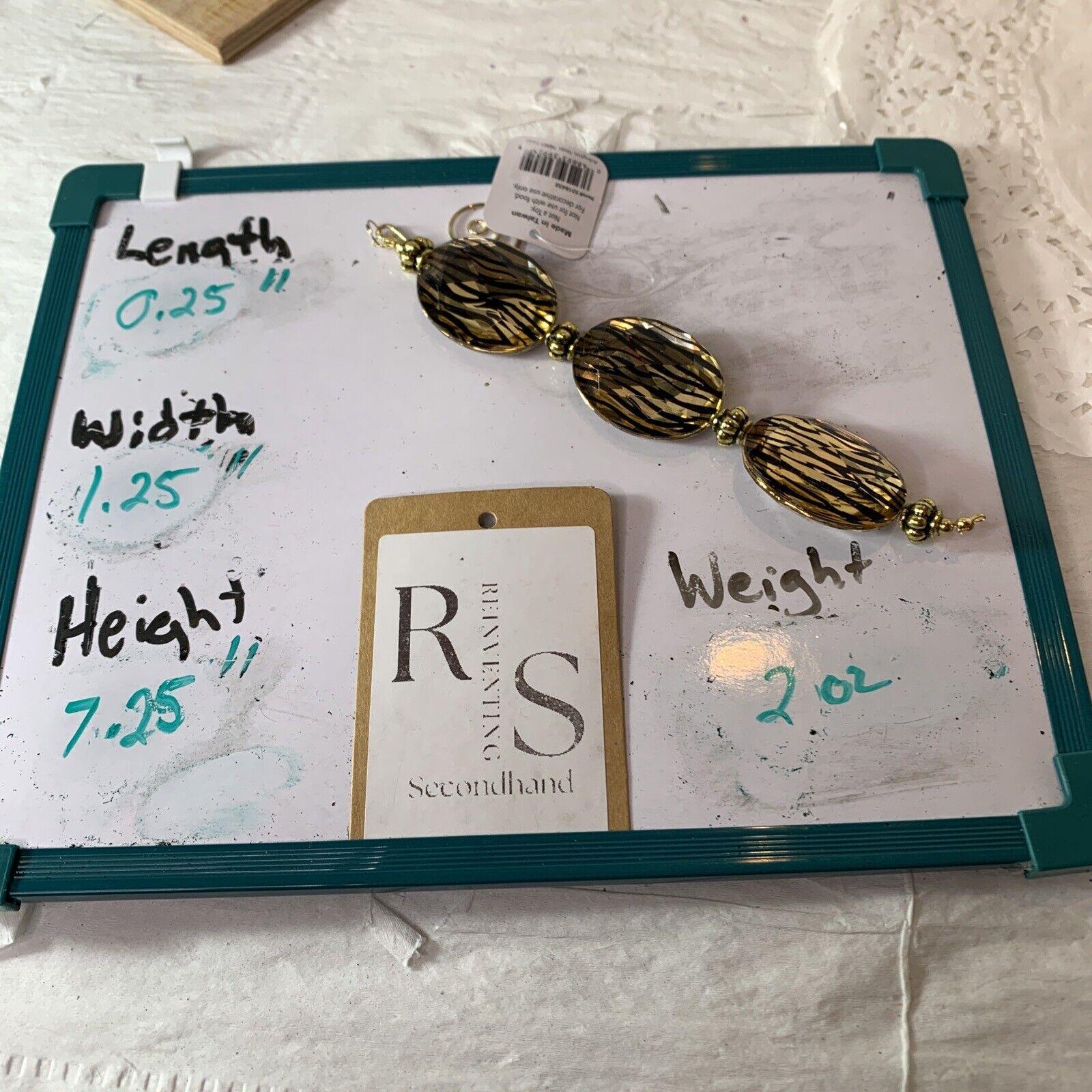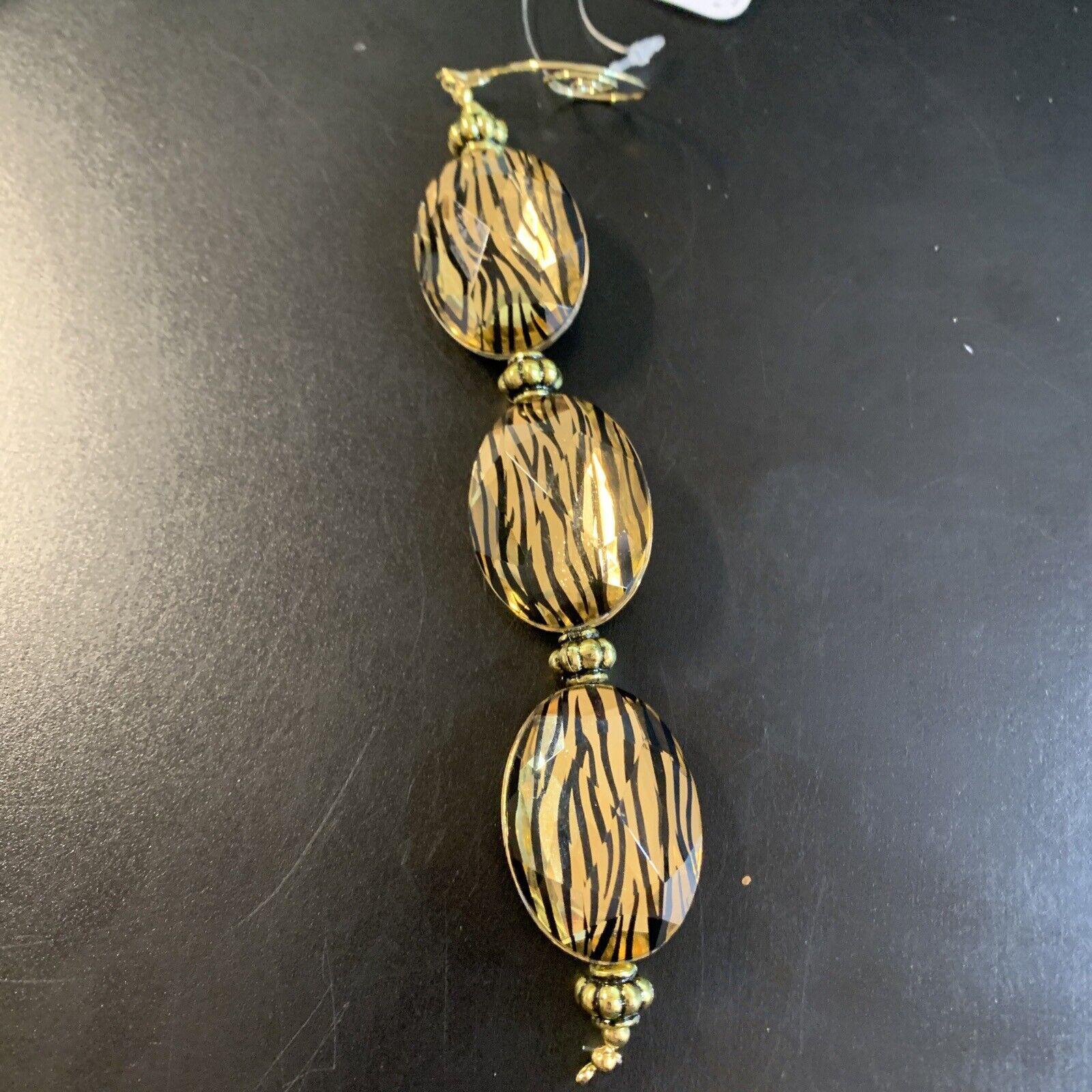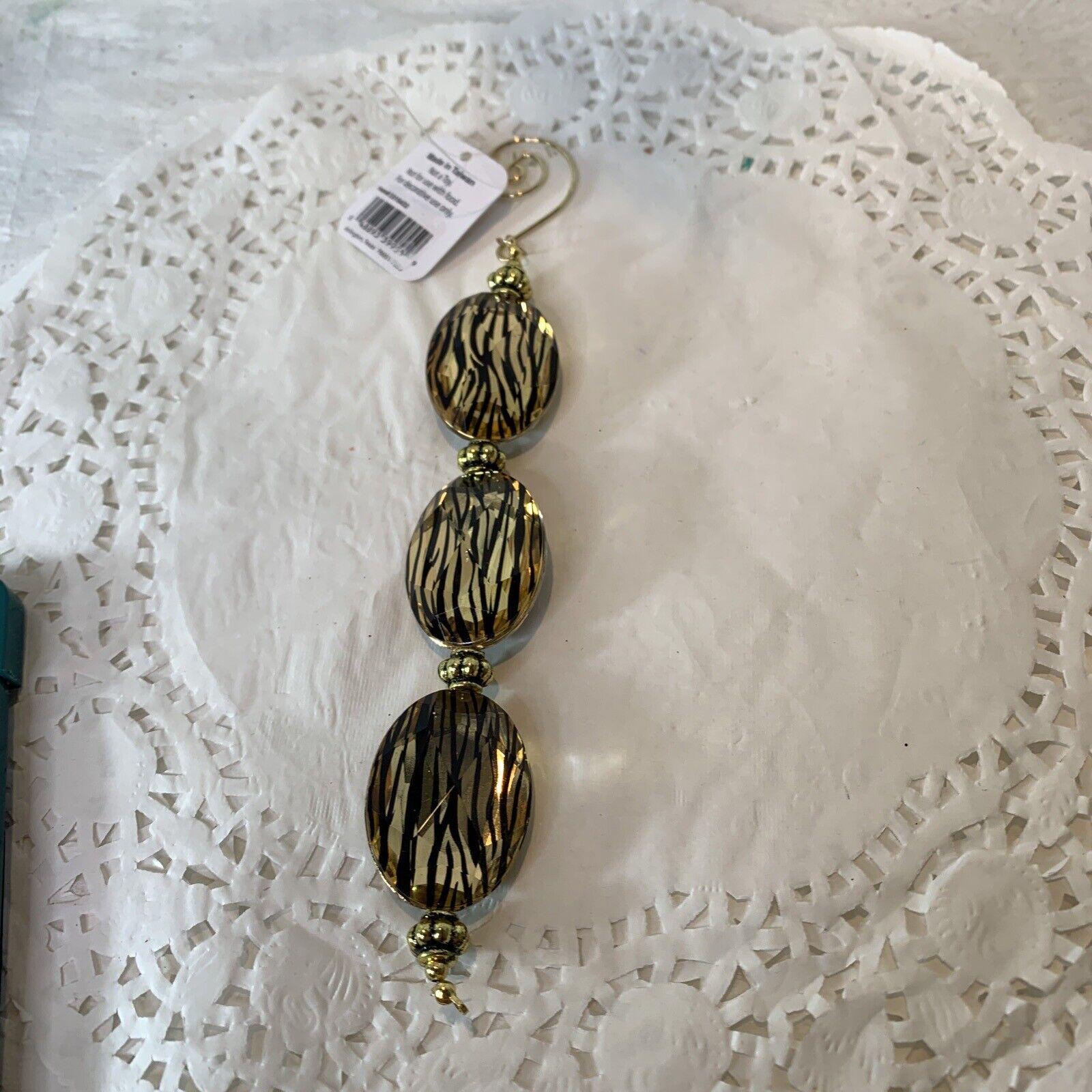 Three gold round reflective beads with a zebra stripe pattern, dangling ornament with accent beads between each large bead. A spiral-shaped hook hangs it from the tree. A must-have for the tiger print lover!