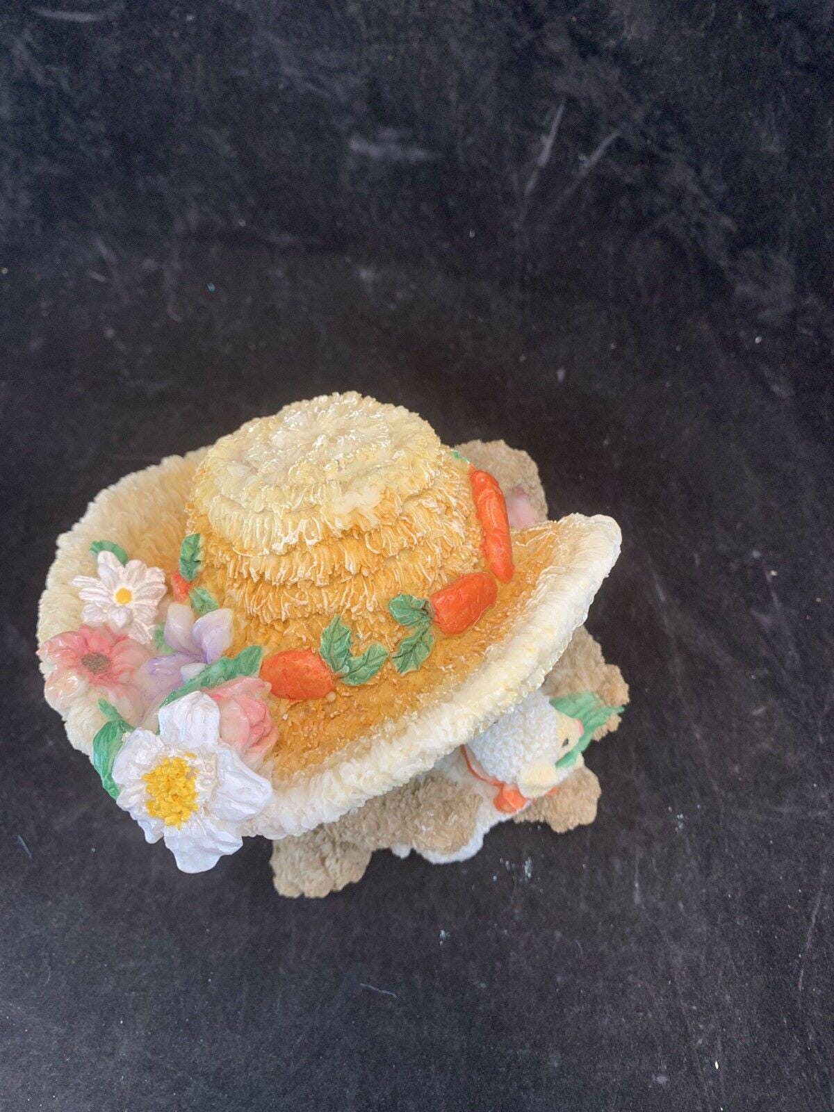 Decorative bunny with baby lamb. Bunny is wearing a big Easter hat with a flower.