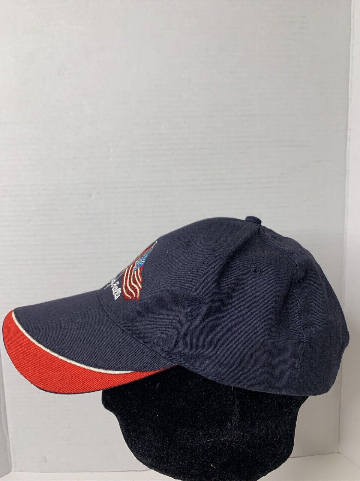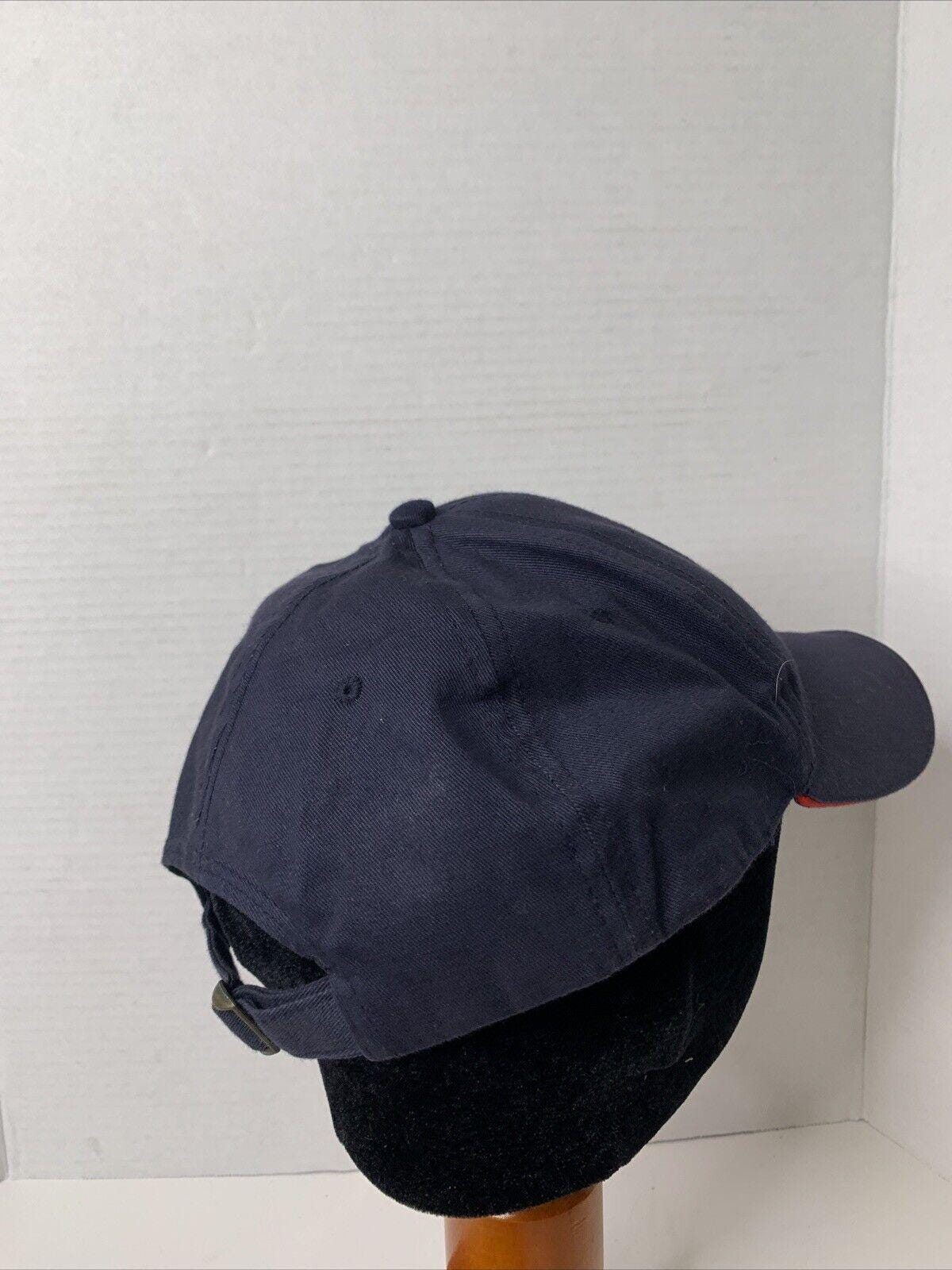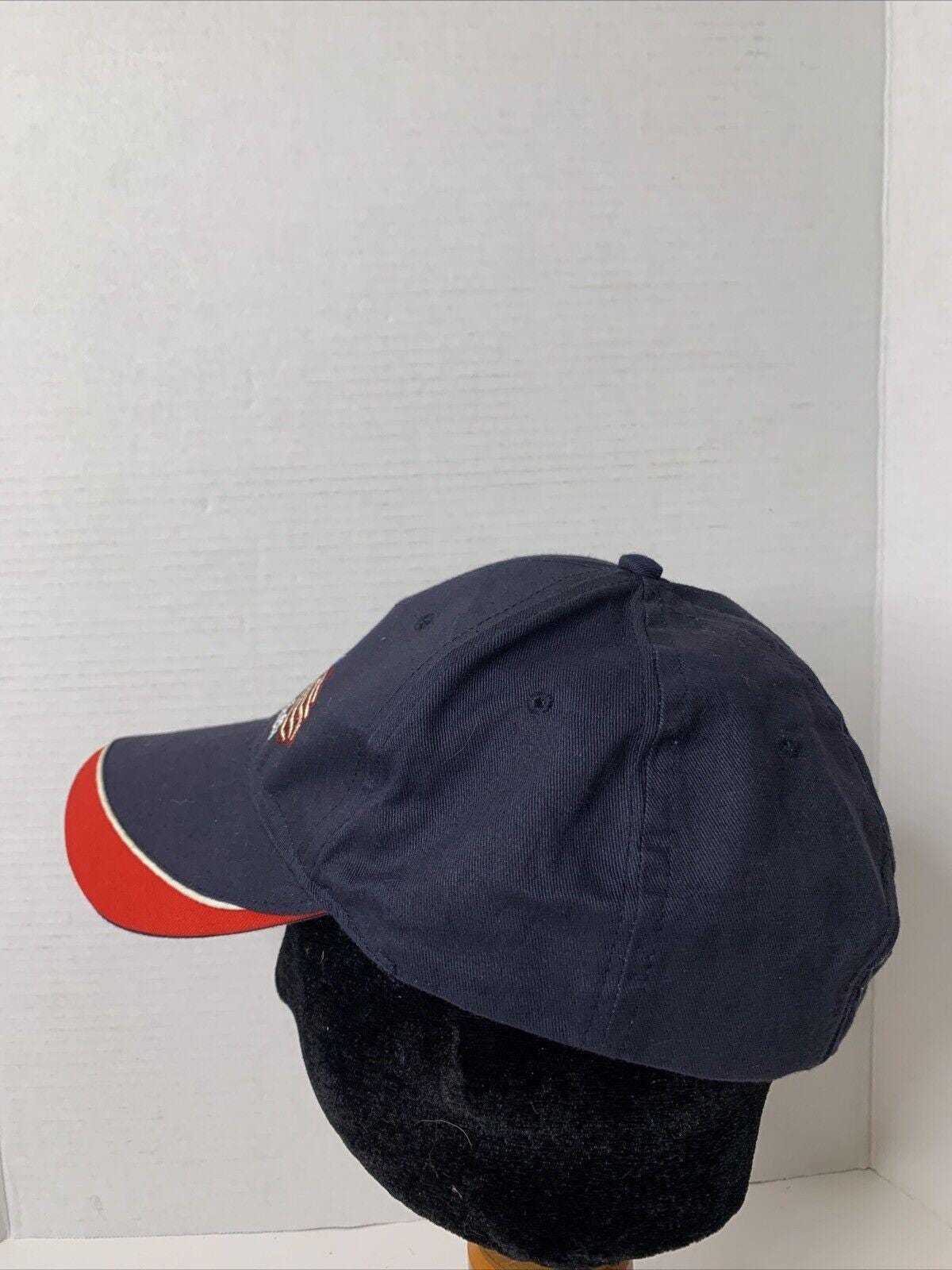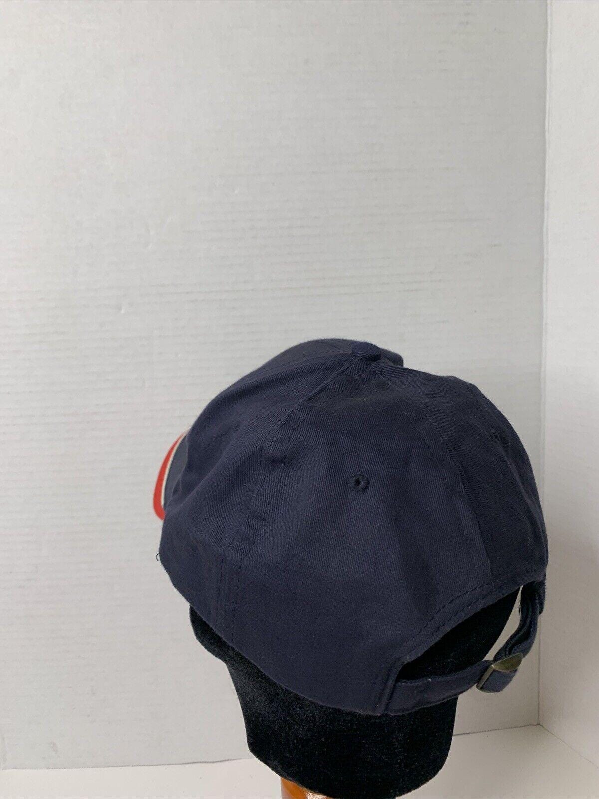 * Blue hat with red and white accents on curved brim