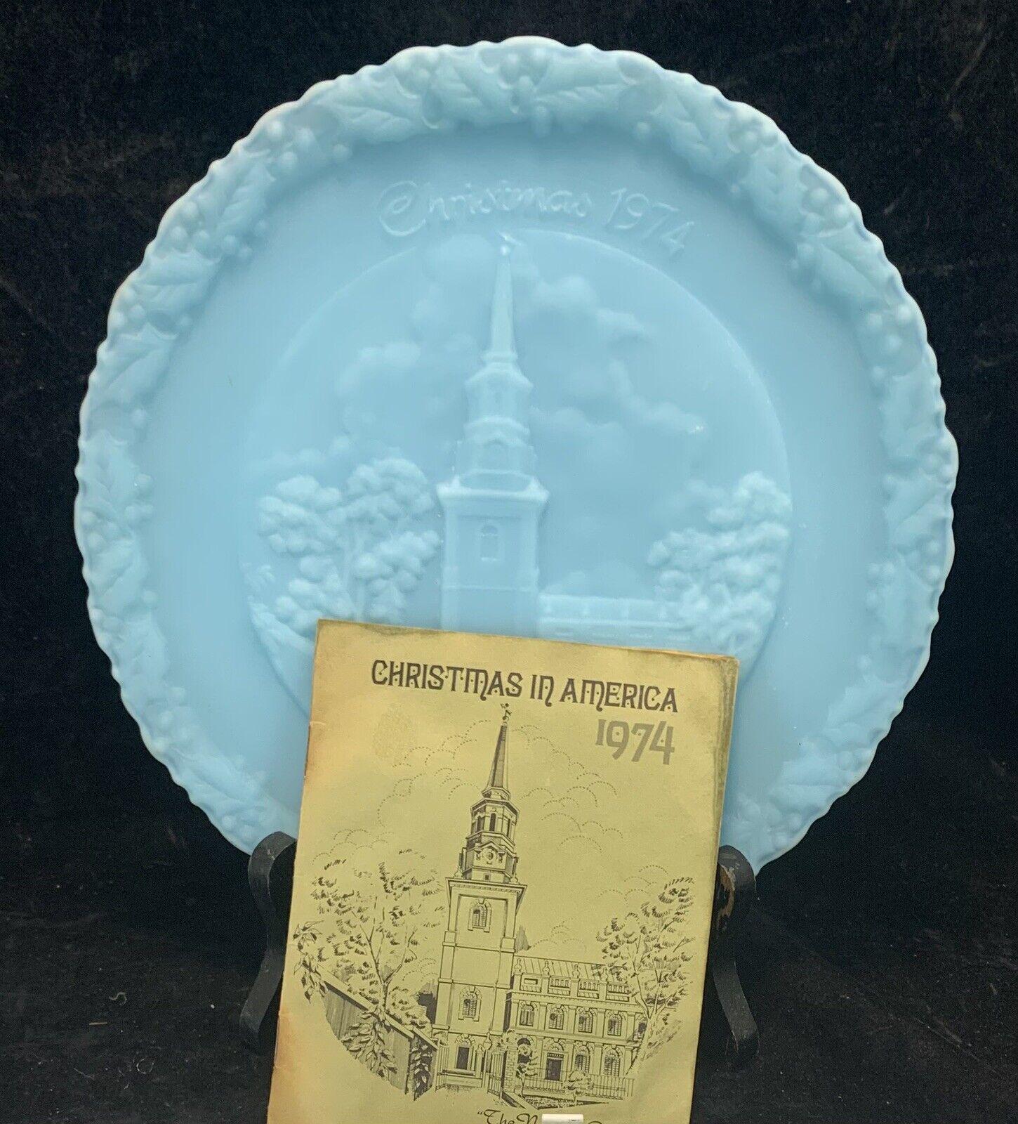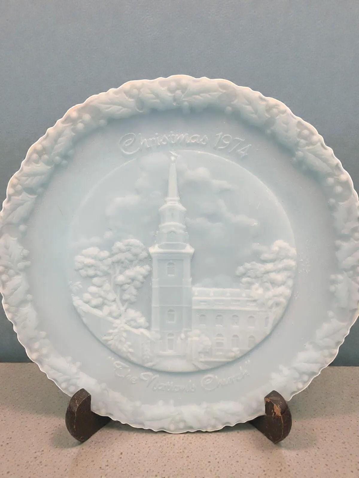 Embrace the holiday spirit with the Fenton blue milk glass Christmas in America #4 "The Nation's Church" plate, a stunning collector's item from 1974.