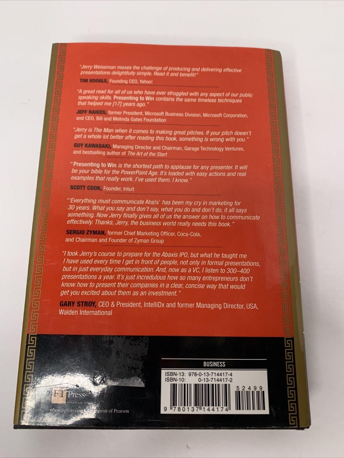 Presenting to Win contains the same timeless techniques that helped me [18] years ago. Jeff Raikes, former President of Microsoft Business Division, Microsoft Corporation, and CEO of Bill and Melinda Gates Foundation, Jerry is The Man when it comes to making great pitches. If your pitch doesn't improve after reading this book, something is wrong with you. Guy Kawasaki, Managing Director and Chairman, Garage Technology Ventures, and bestselling author of The Art of the Start, Presenting to Win is the shortest path to applause for any presenter. It will be your bible for the PowerPoint Age. It's loaded with easy actions and real examples that work. I've used them. I know. Scott Cook, Founder, Intuit