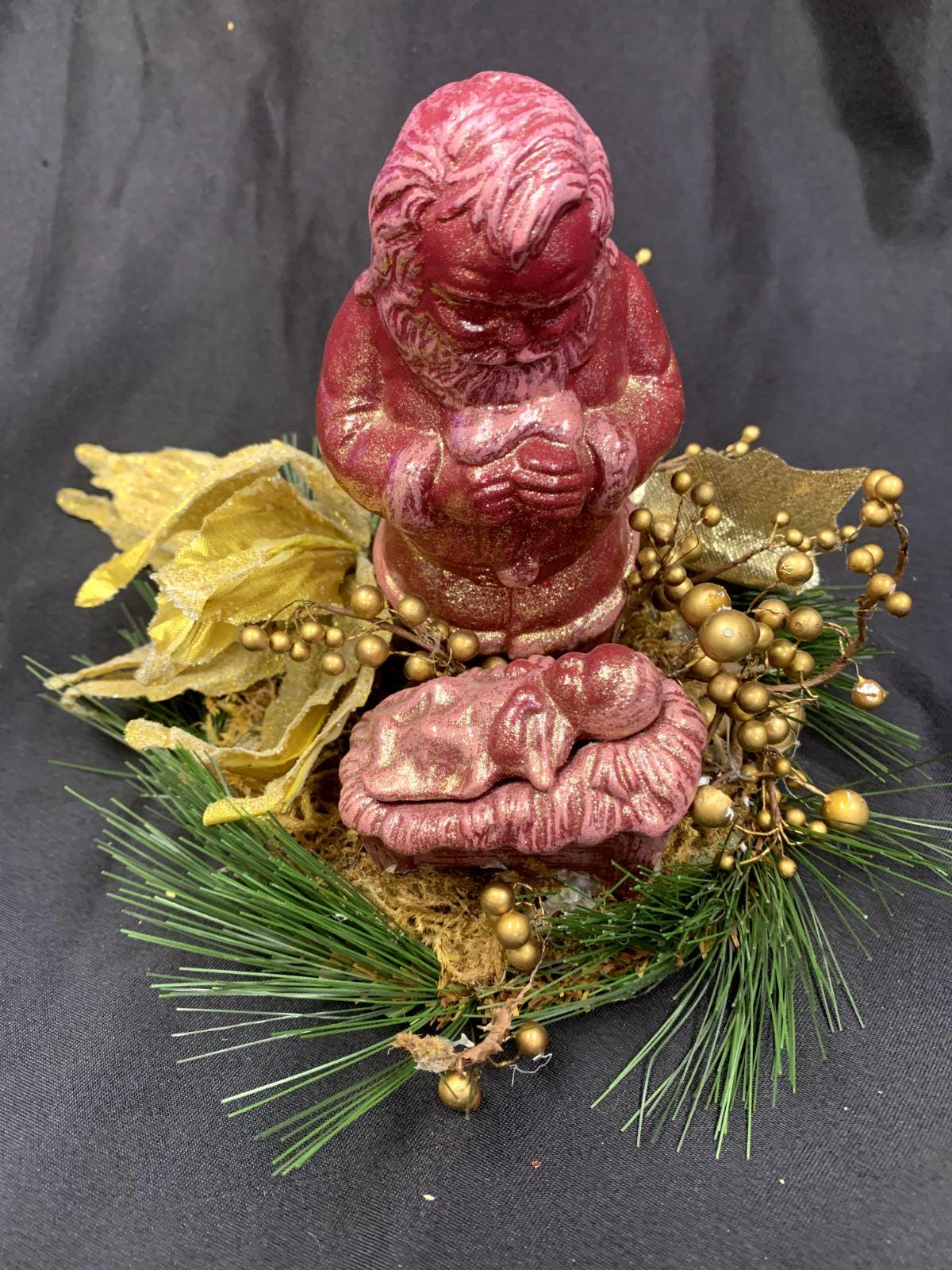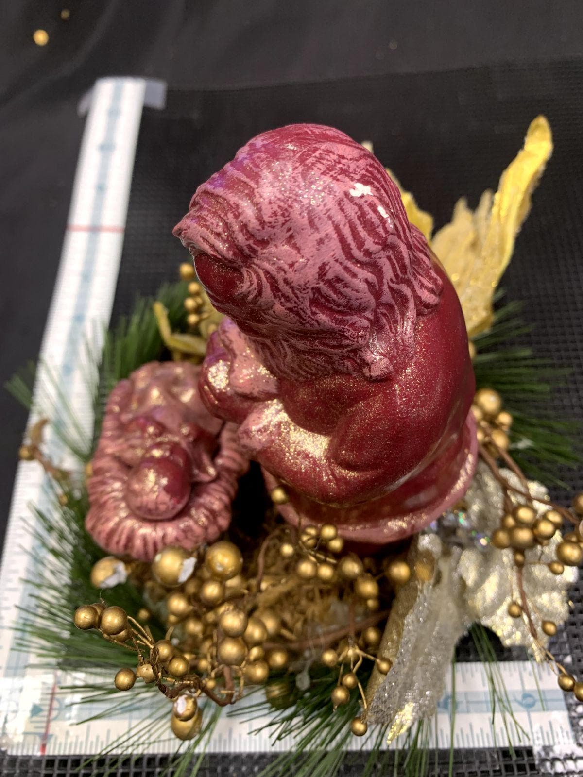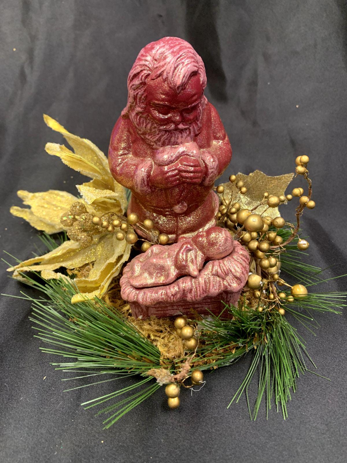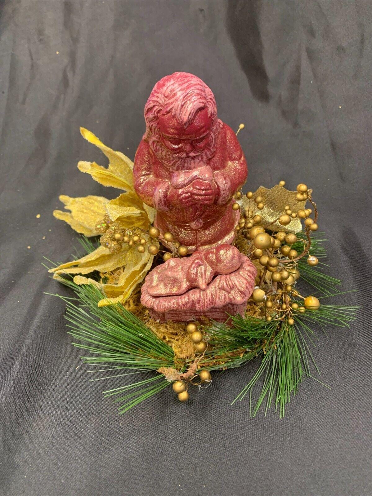 Vintage Christmas Centerpiece Santa Claus Praying Over Baby Jesus In The Manger With Pine and Gold Accents