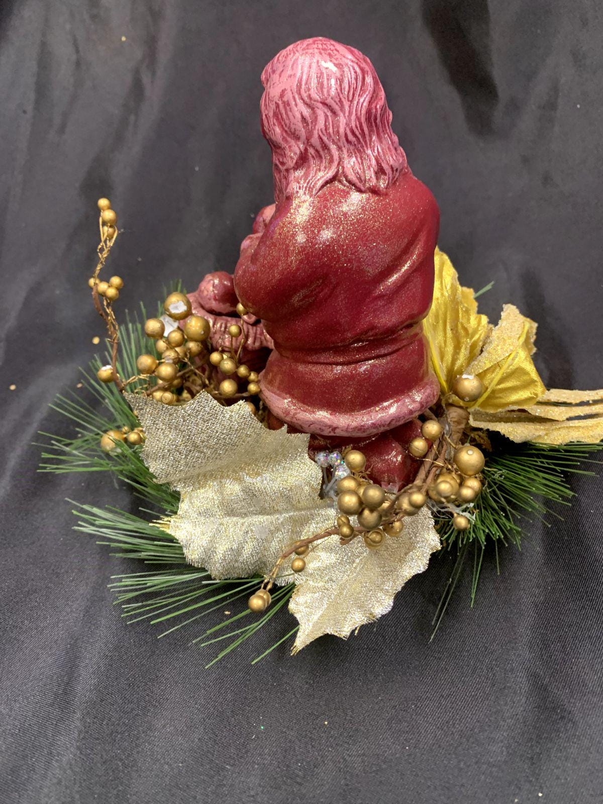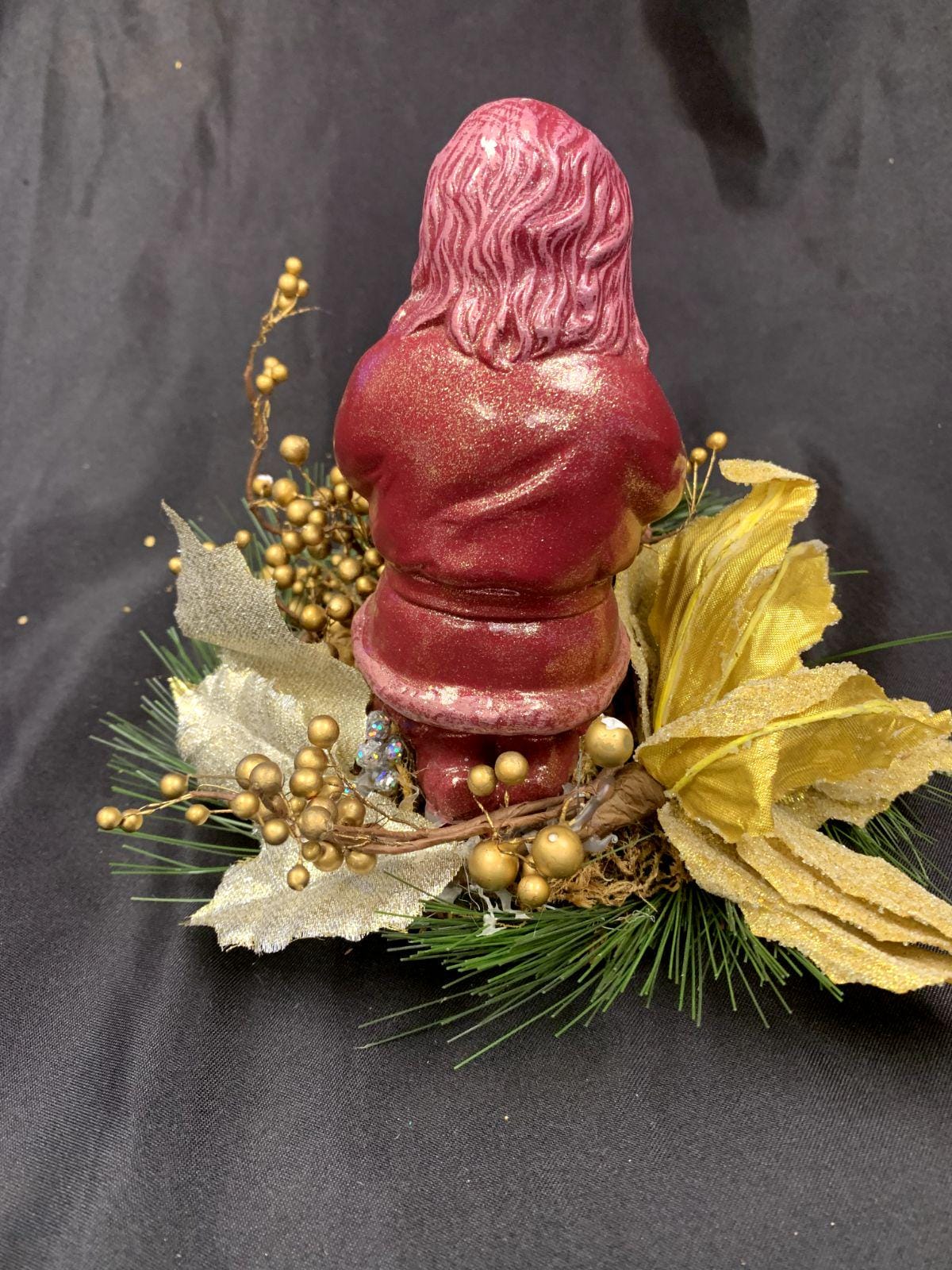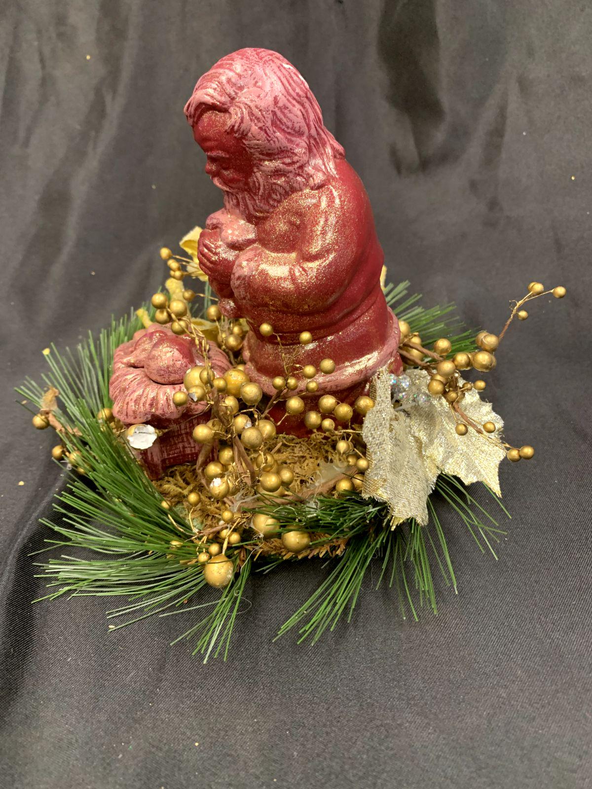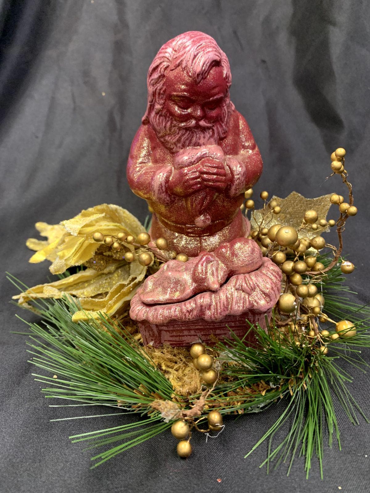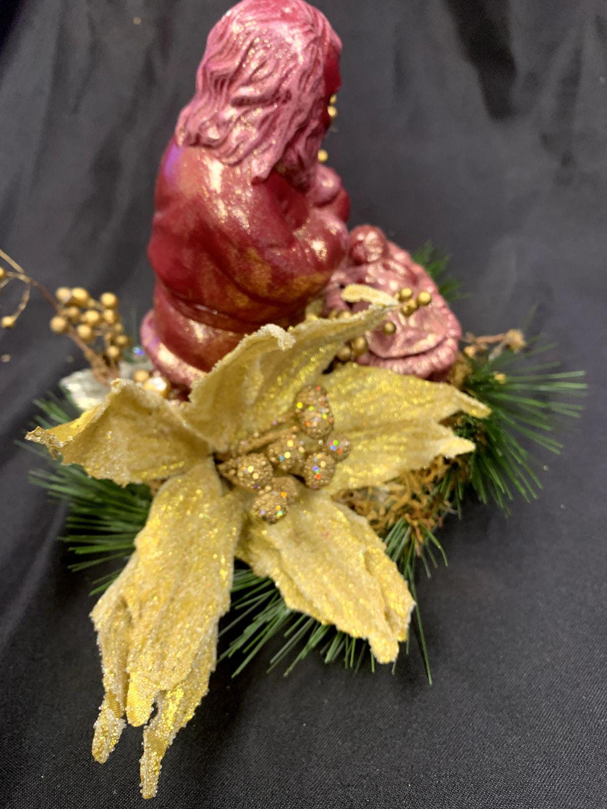 Vintage Christmas Centerpiece Santa Claus Praying Over Baby Jesus In The Manger With Pine and Gold Accents