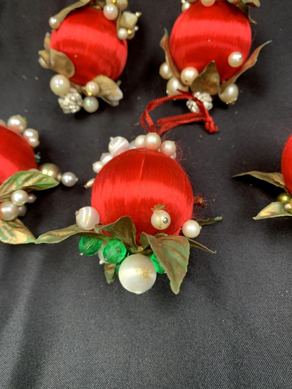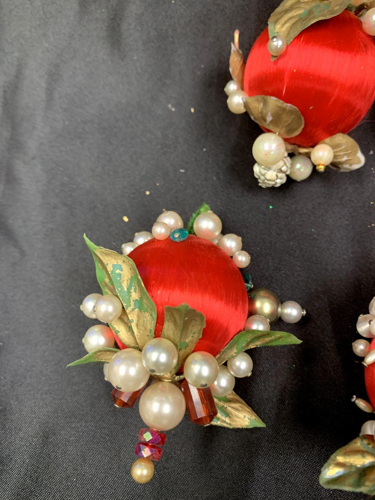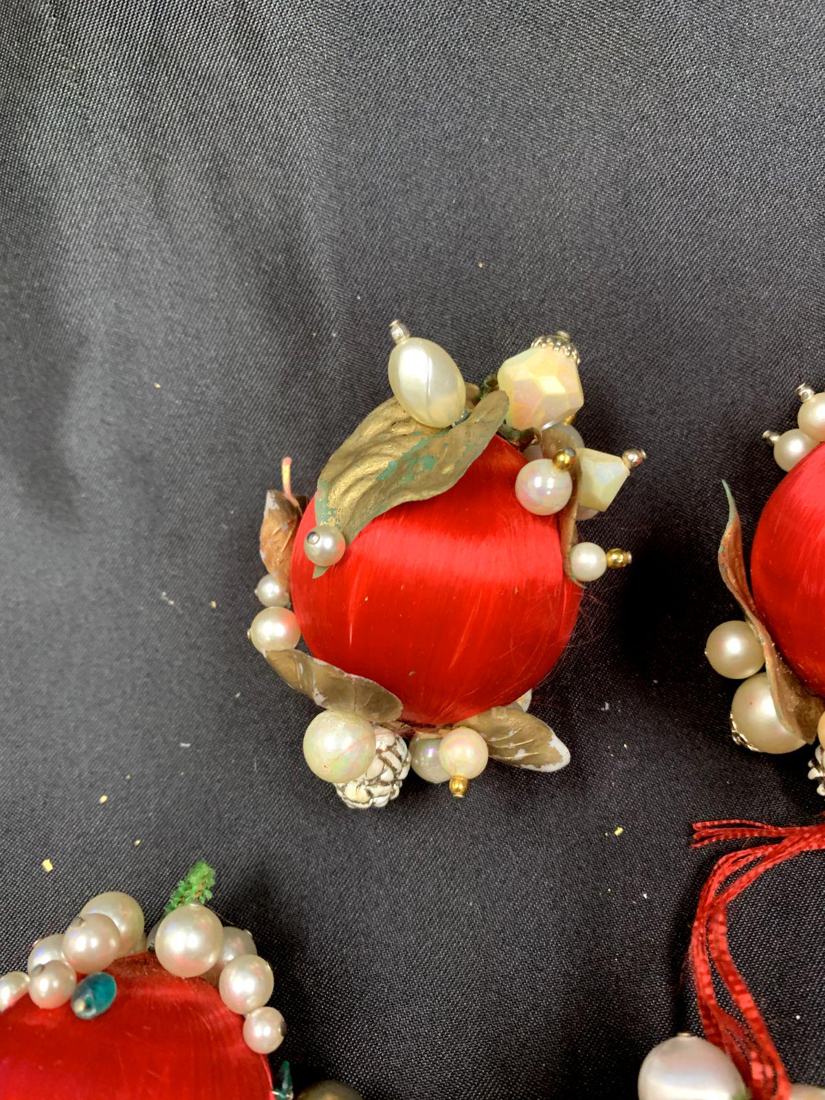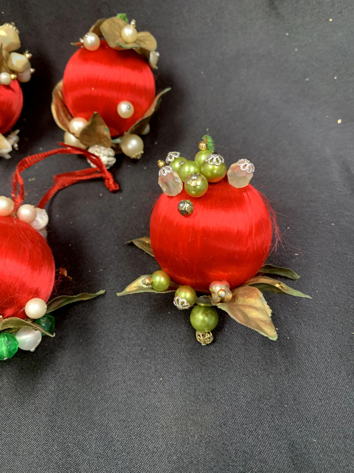 Vintage Christmas Holiday Fabric Bulb Ball Ornaments With Beaded Stick Pin Decoration In Red and White Set of 5