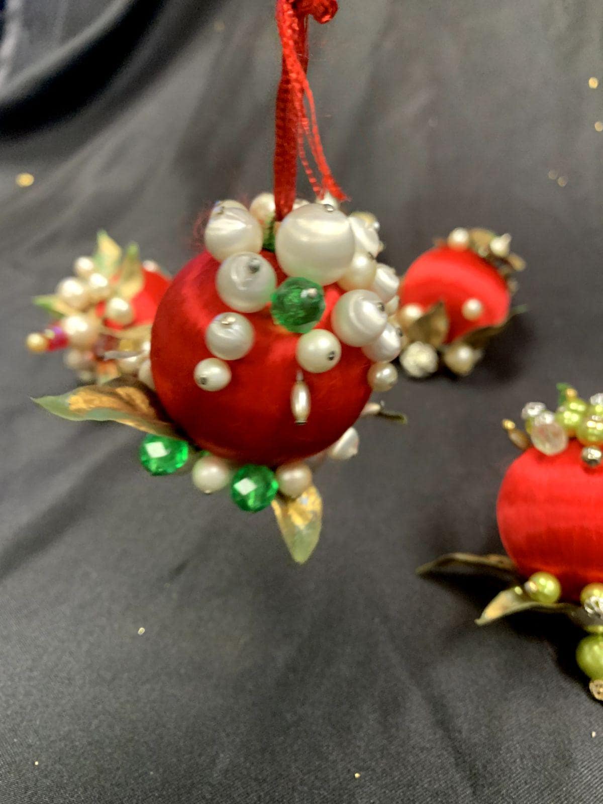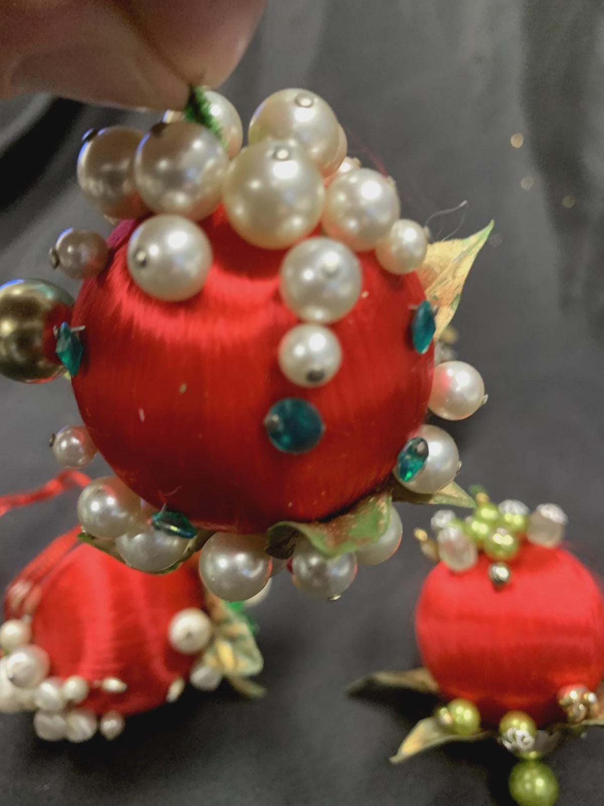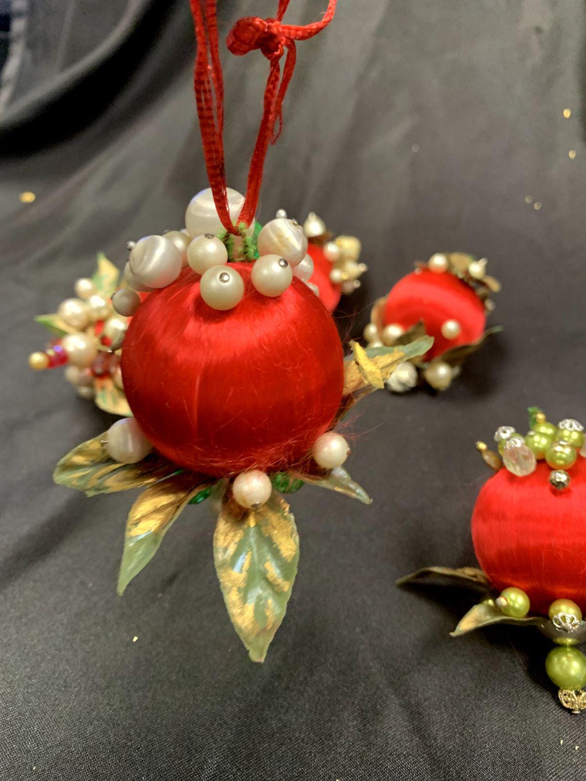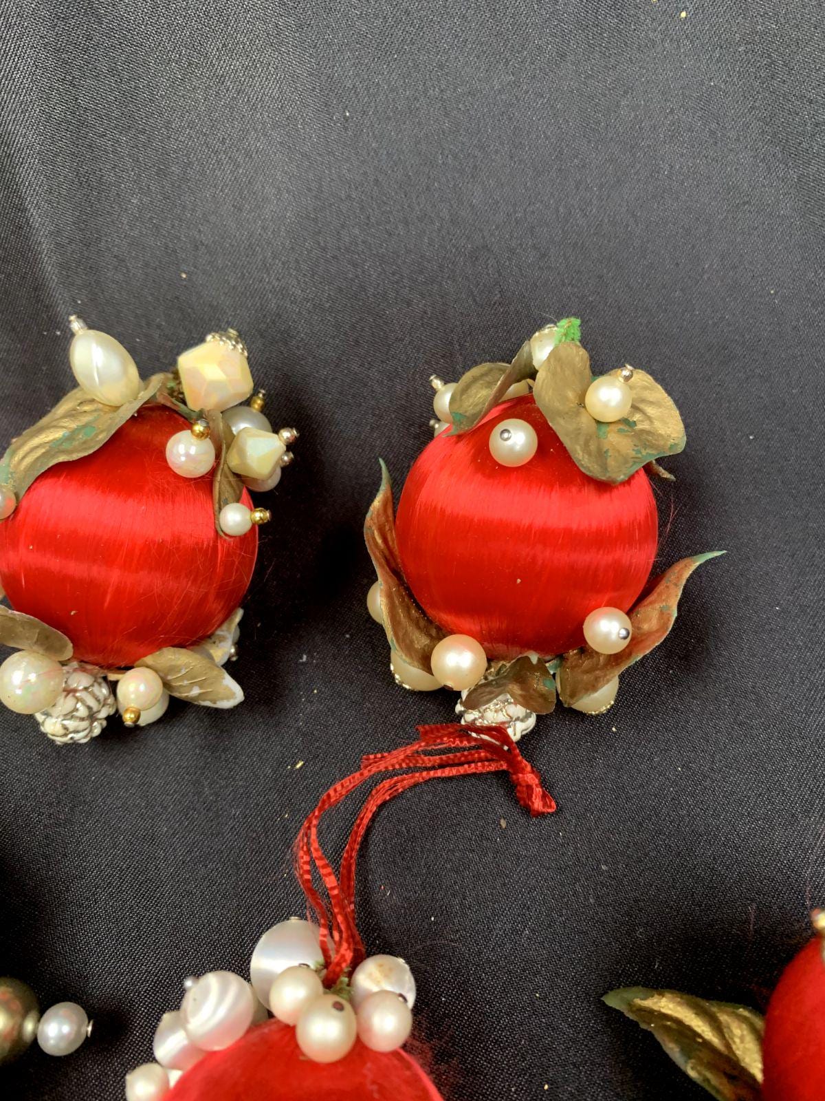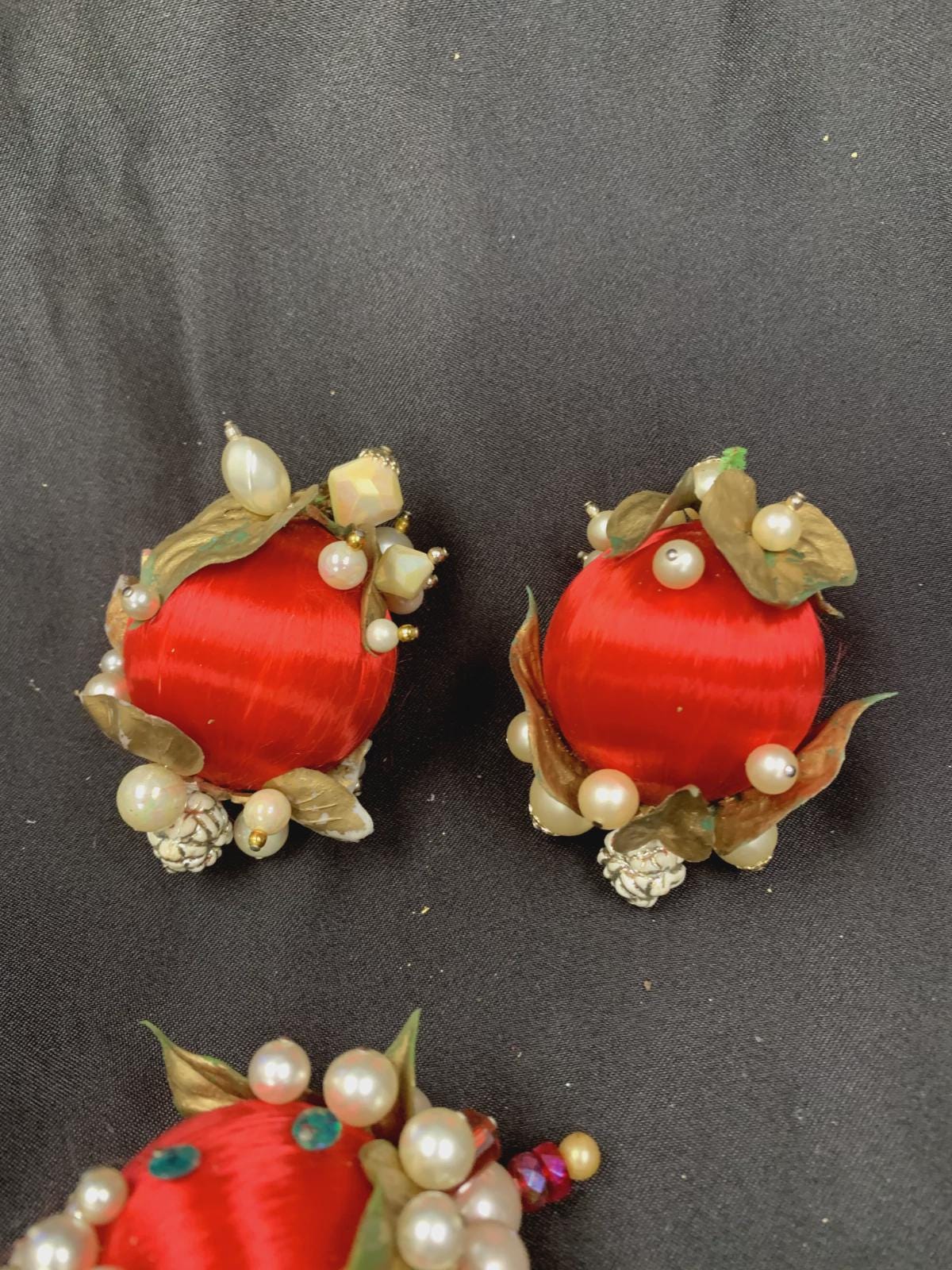 Vintage Christmas Holiday Fabric Bulb Ball Ornaments With Beaded Stick Pin Decoration In Red and White Set of 5