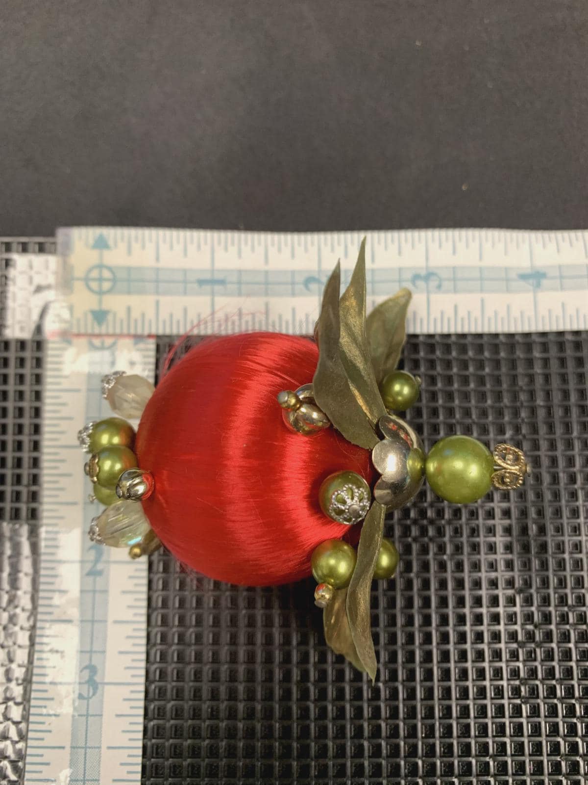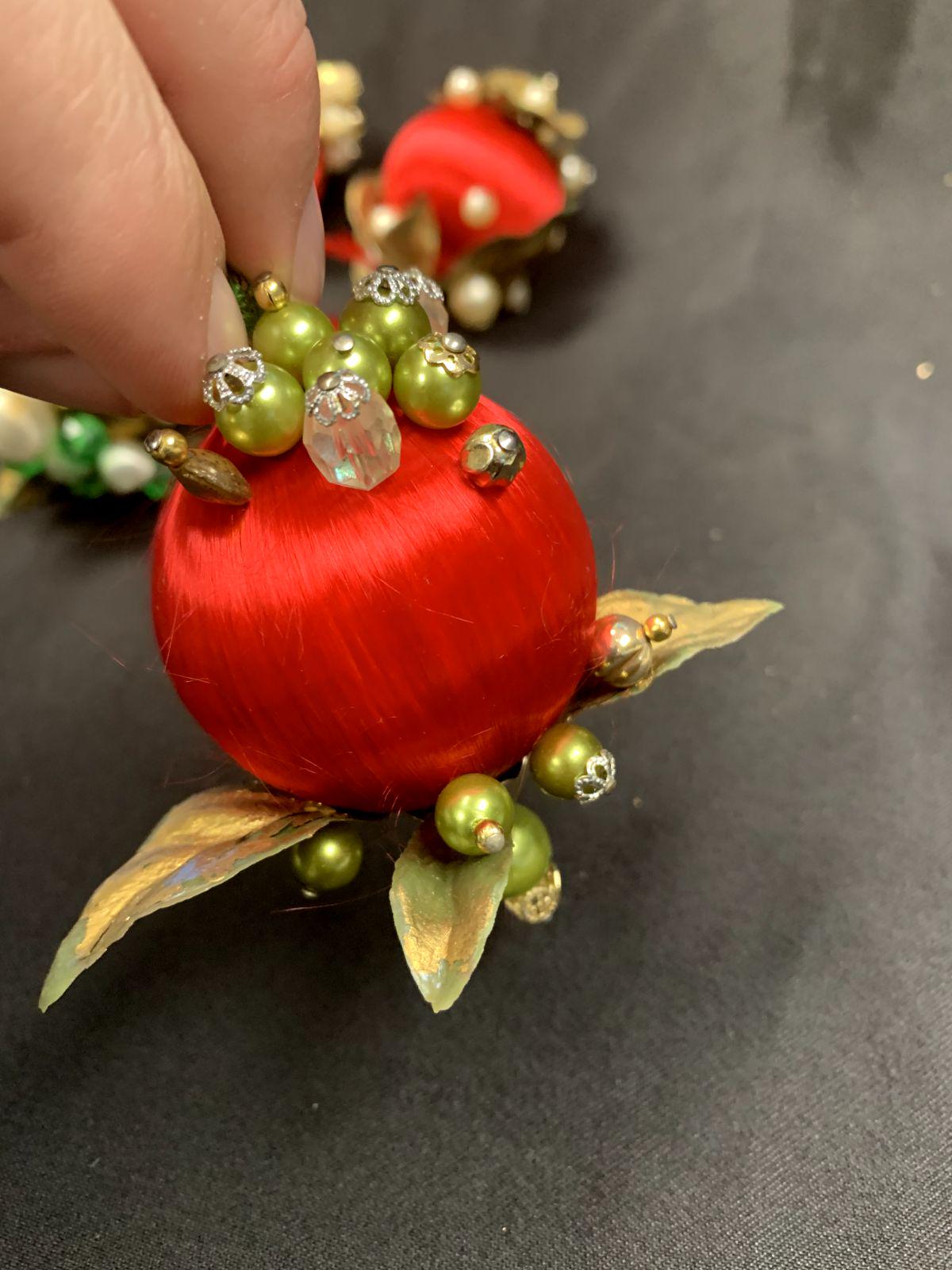 This kitschy mid-century modern Christmas ornament set is fun and whimsical! It features colorful fabric balls (bulbs) with beaded accent stick pins!