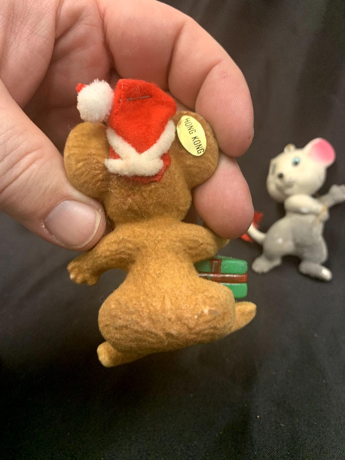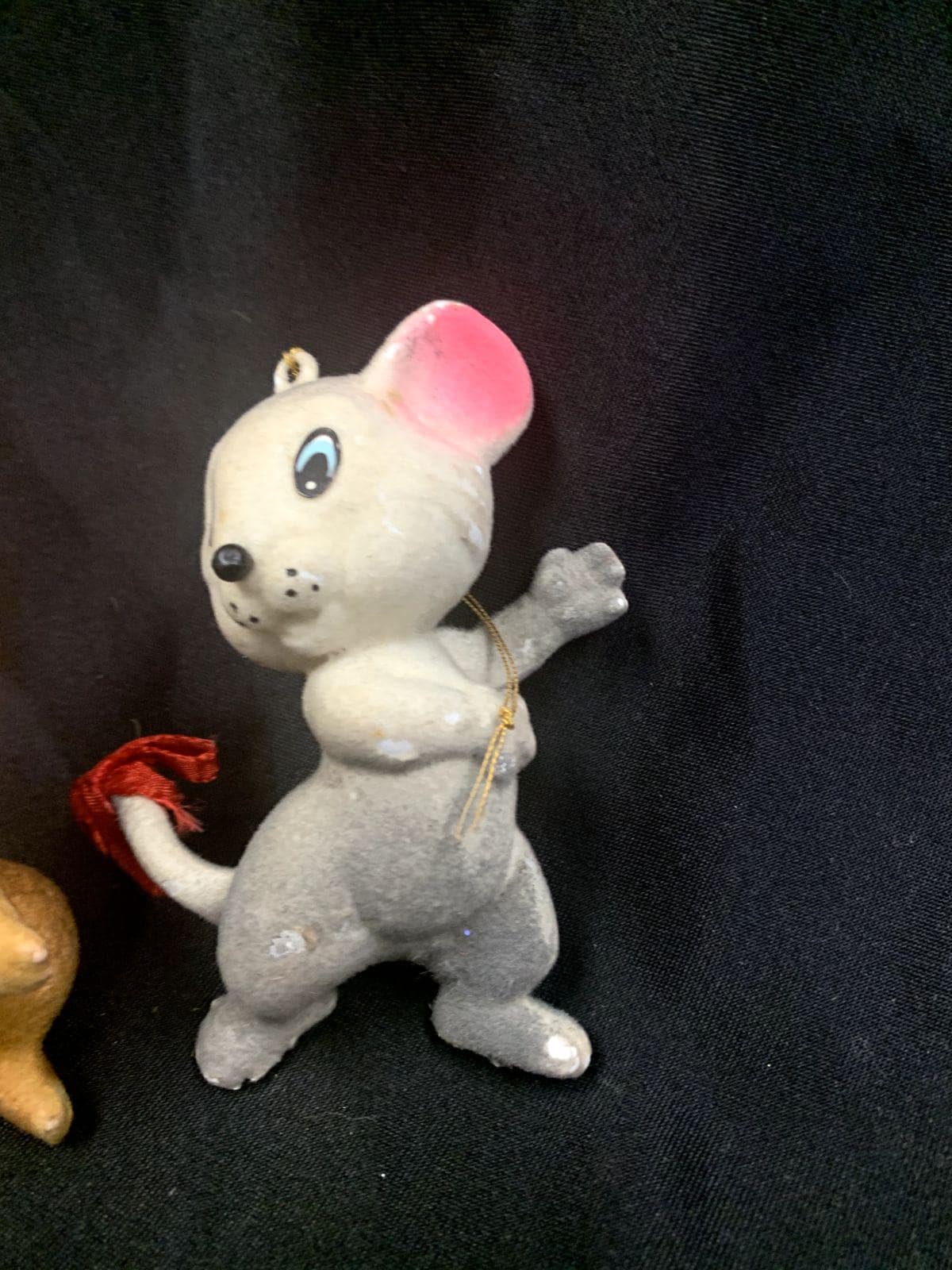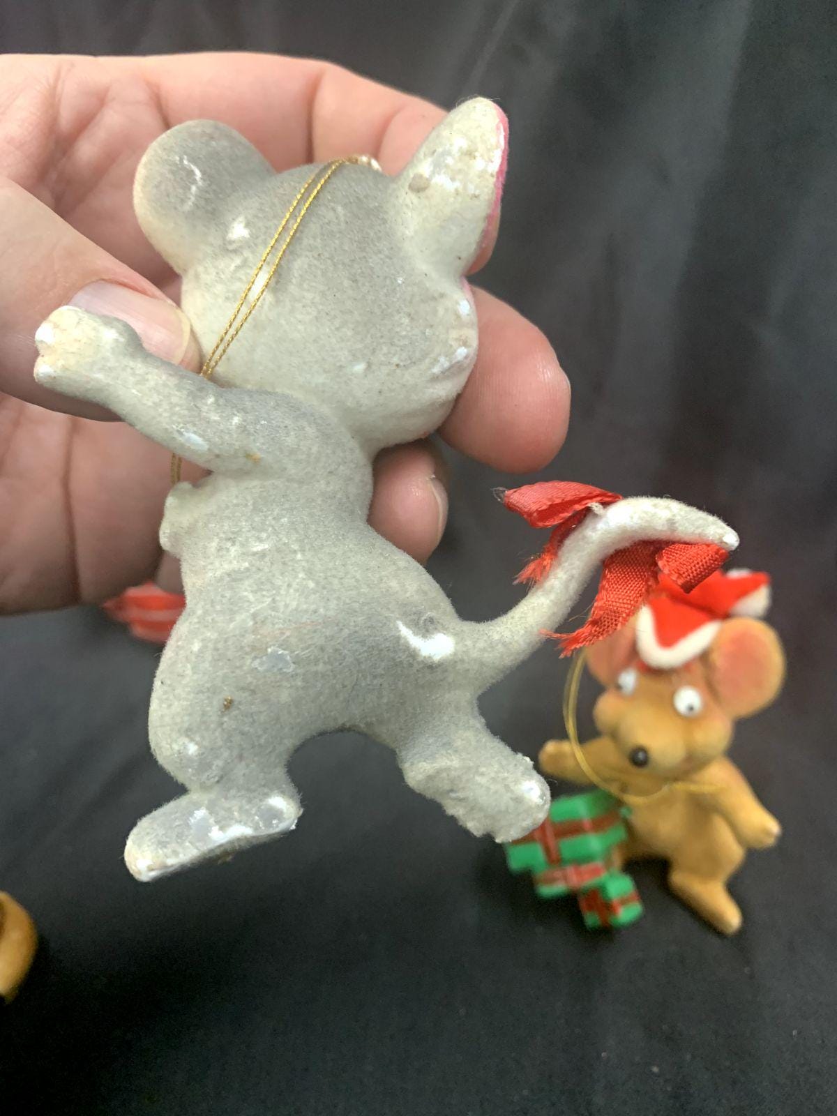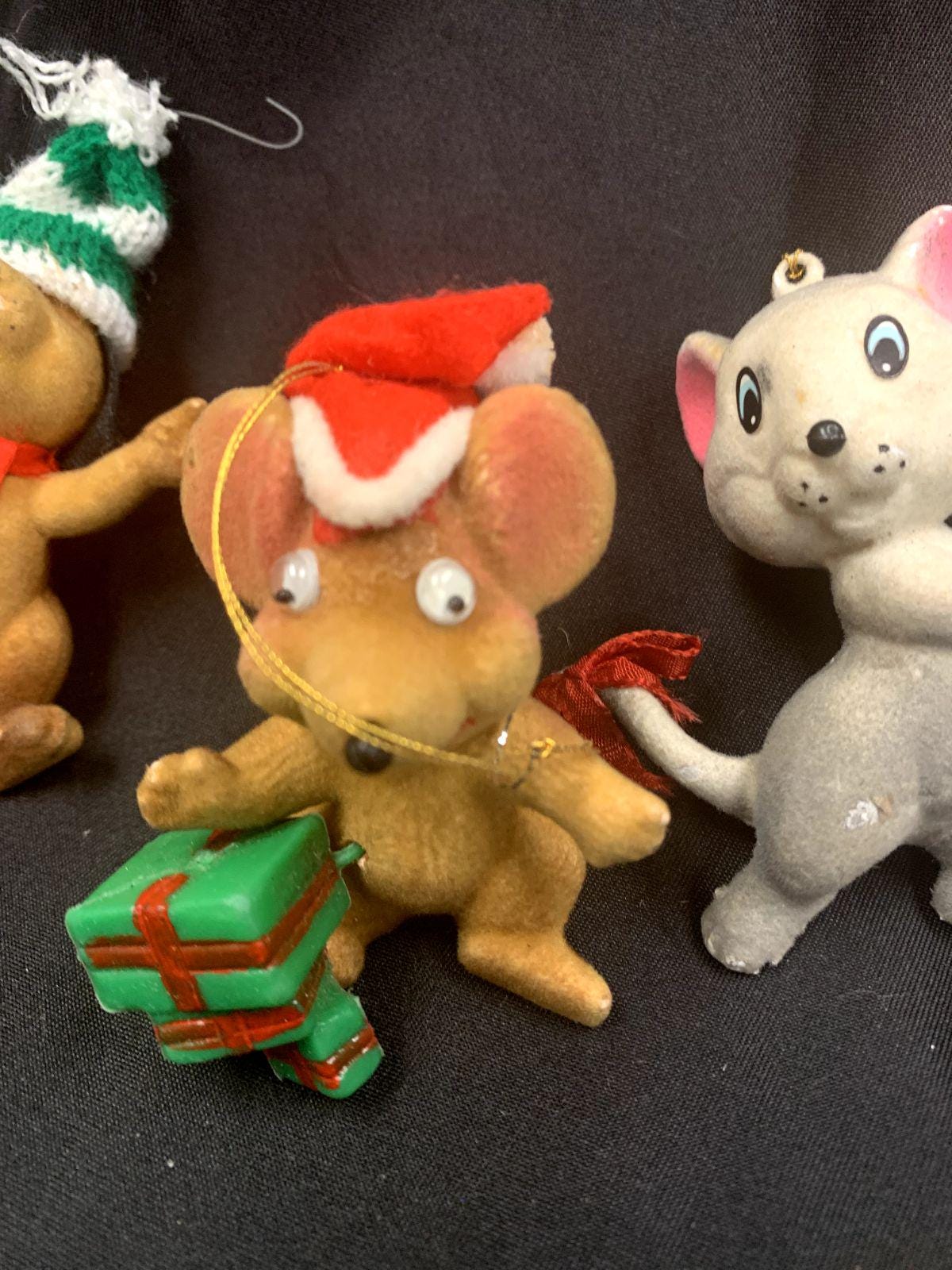 Three flocked ornaments - dog and mice made in Hong Kong