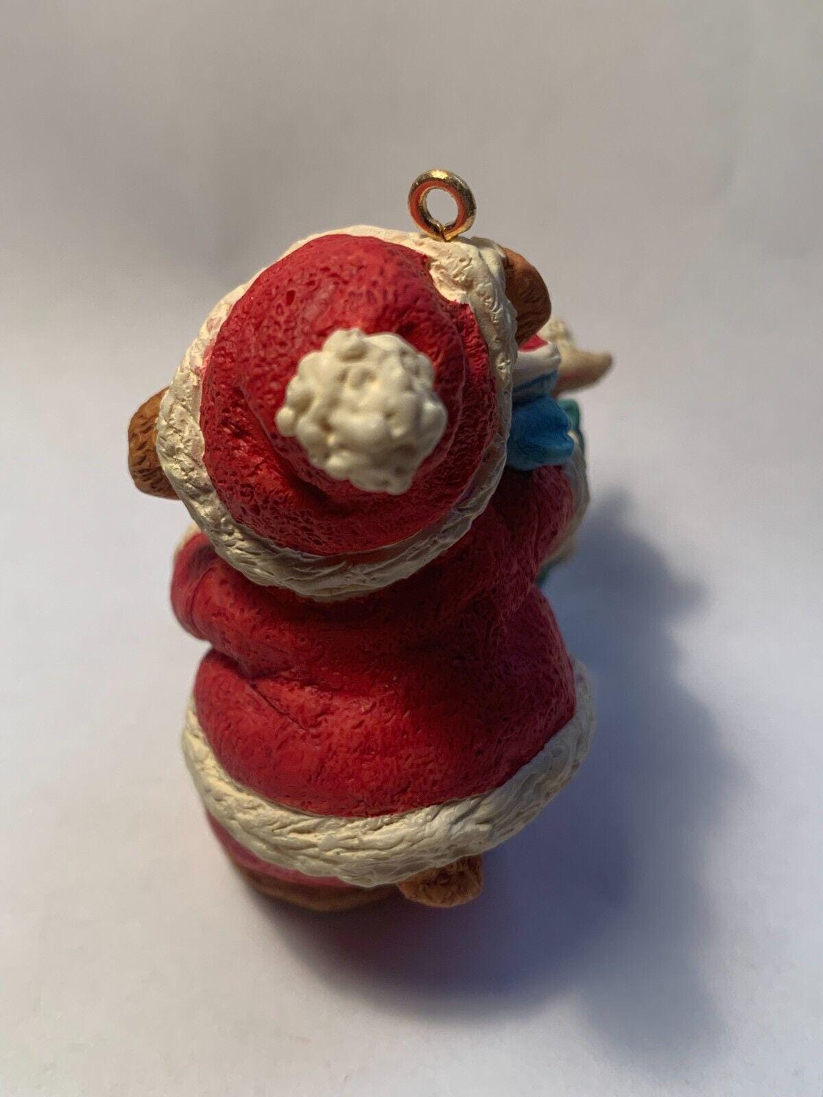 Featuring a hand crafted Bear in Santa suit sharing a gift!