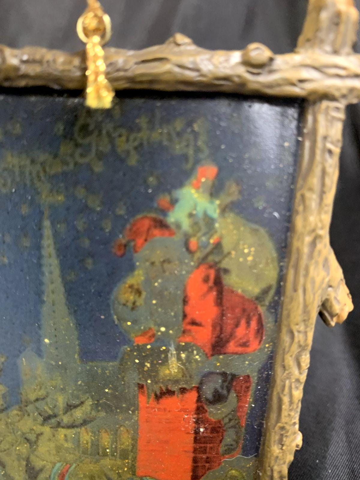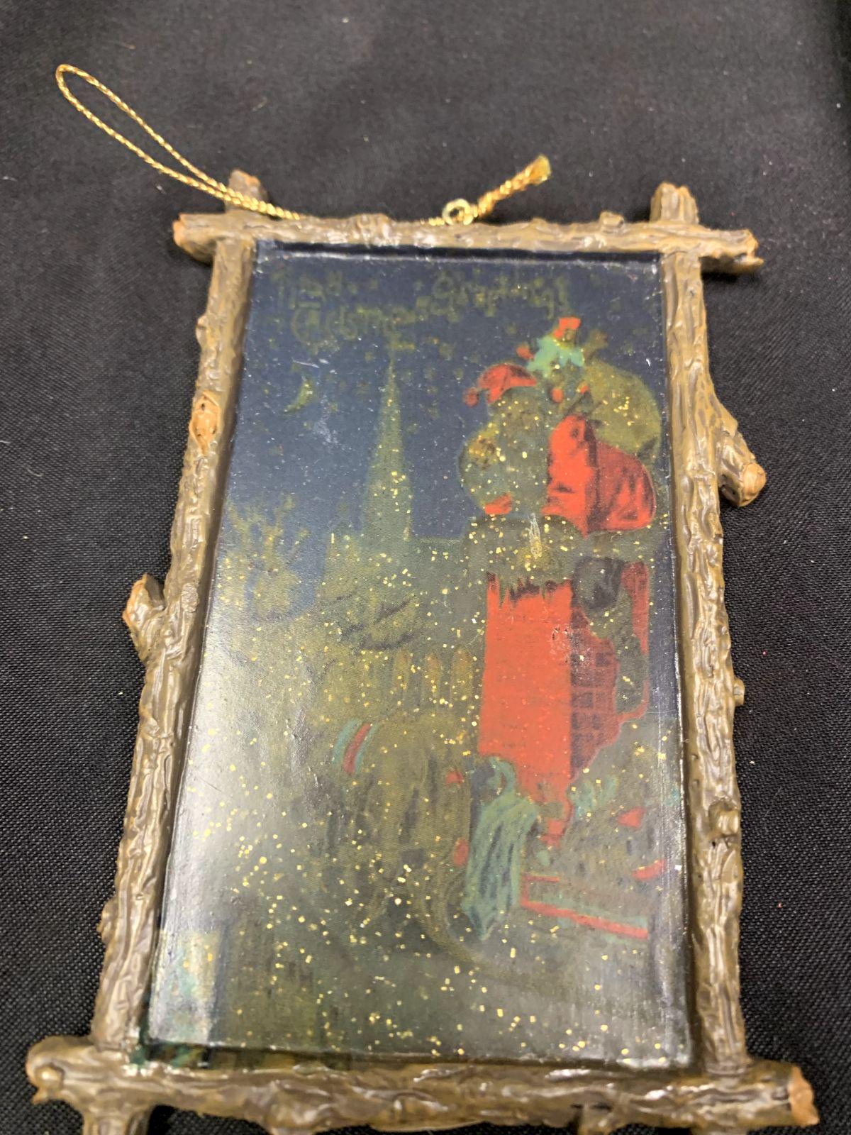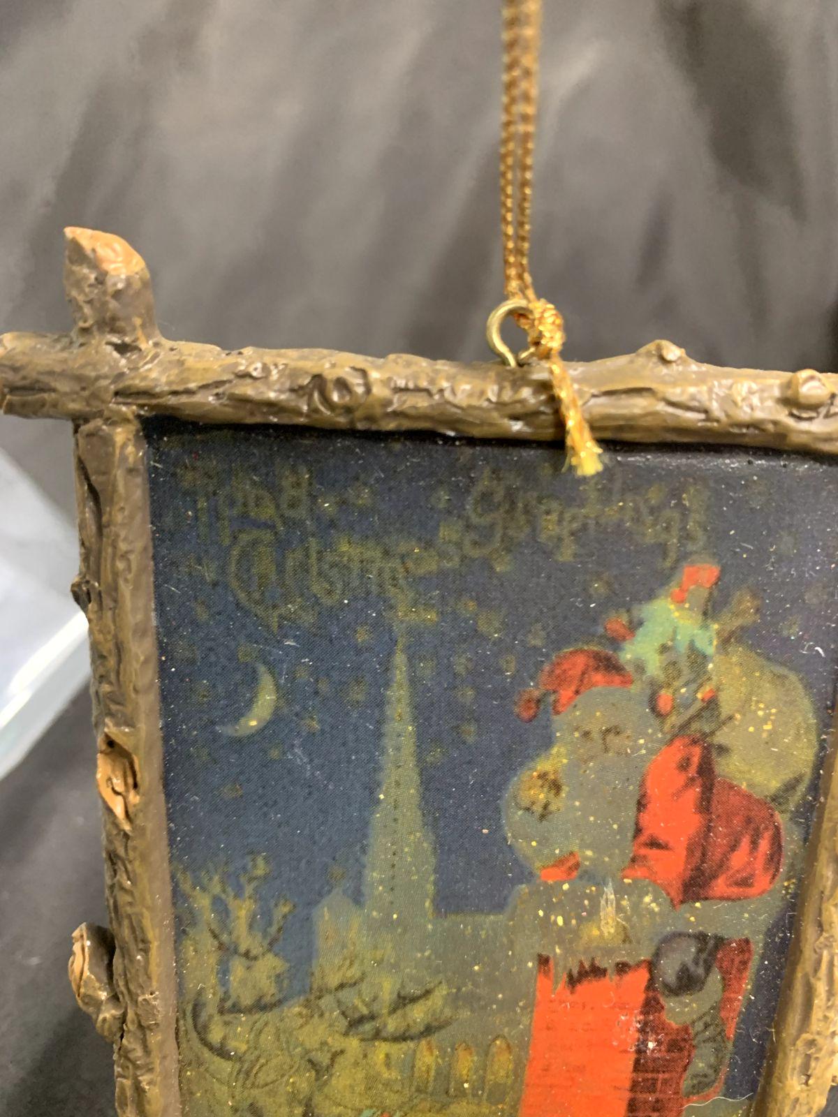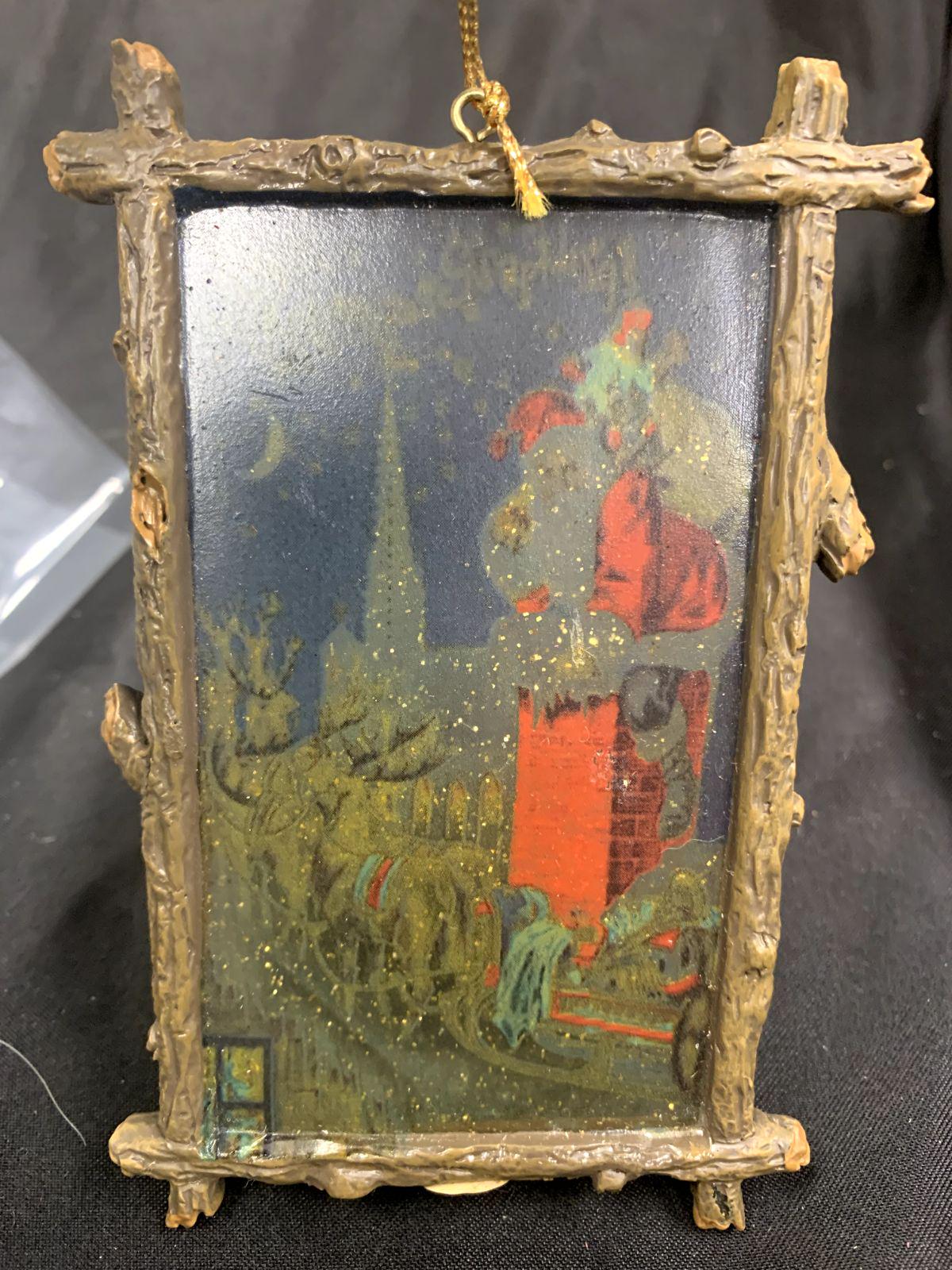 Vintage Resin and Wood Santa Claus Sleigh Chimney Framed Abstract Artwork Christmas Tree Ornament