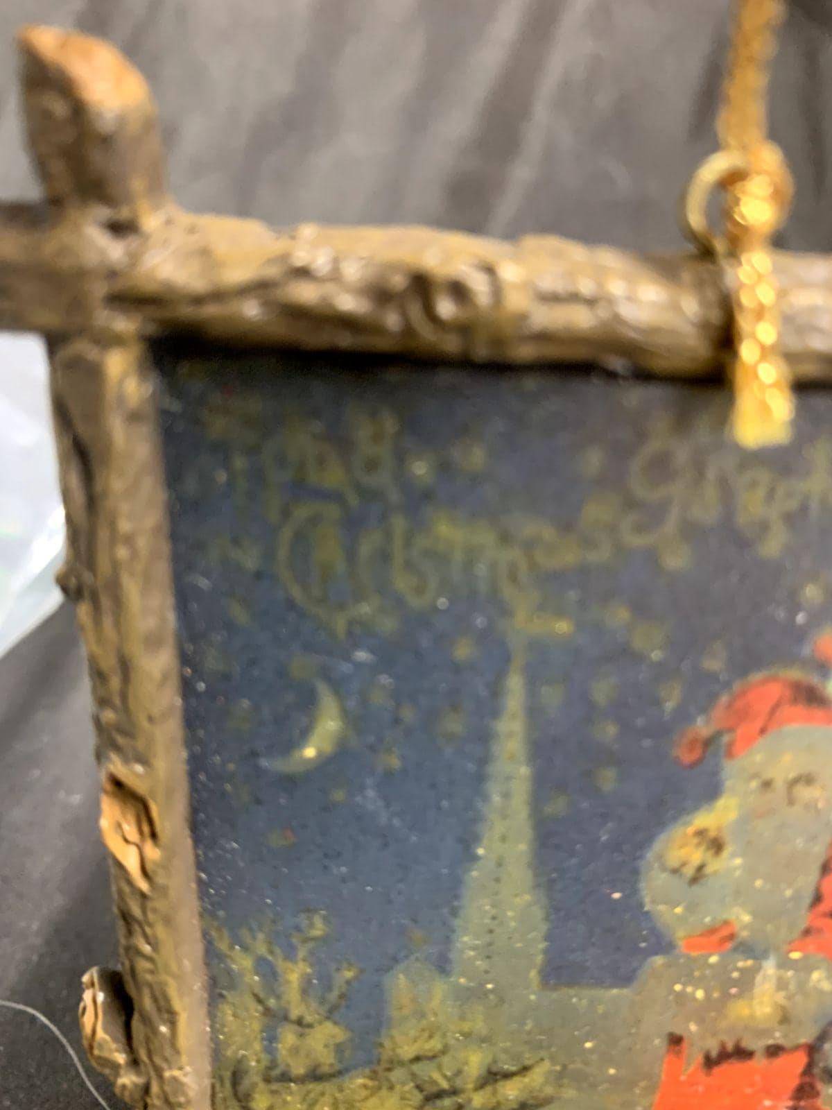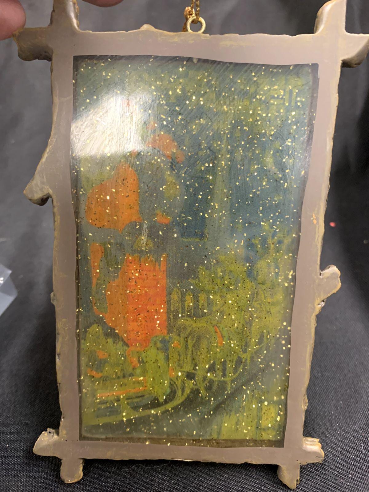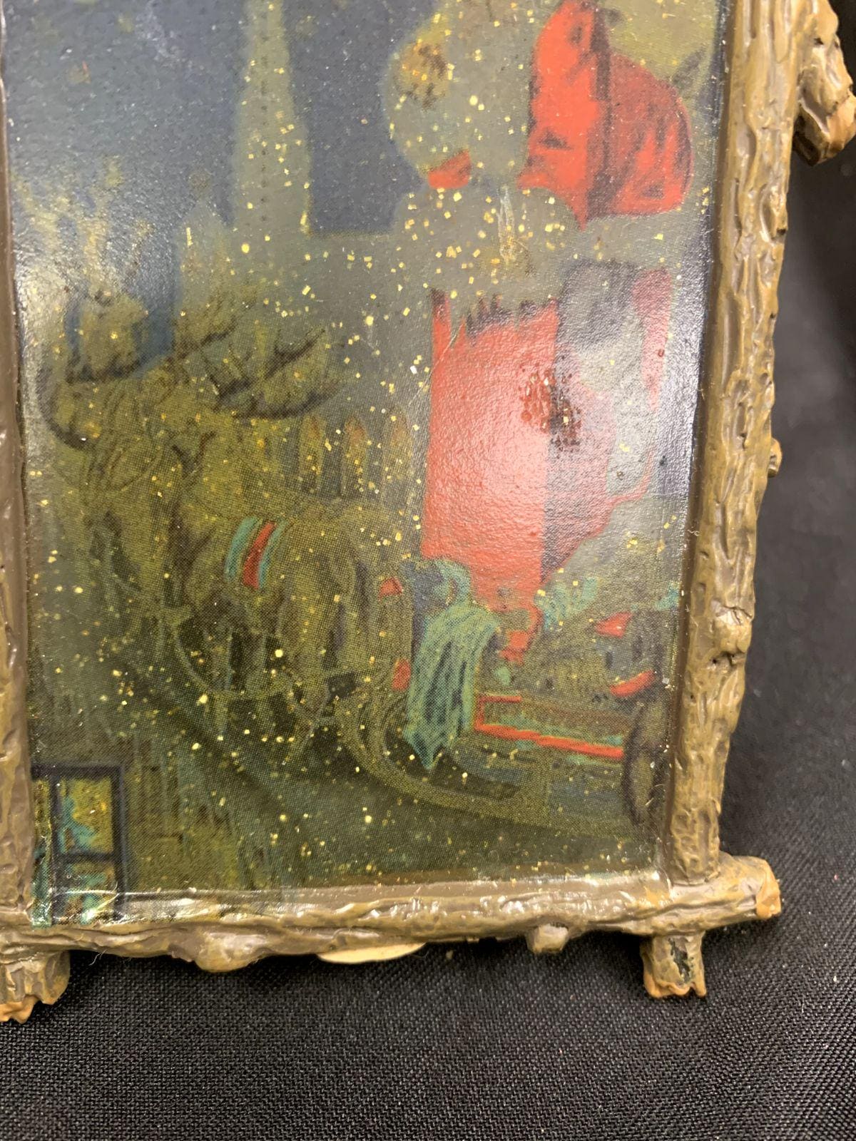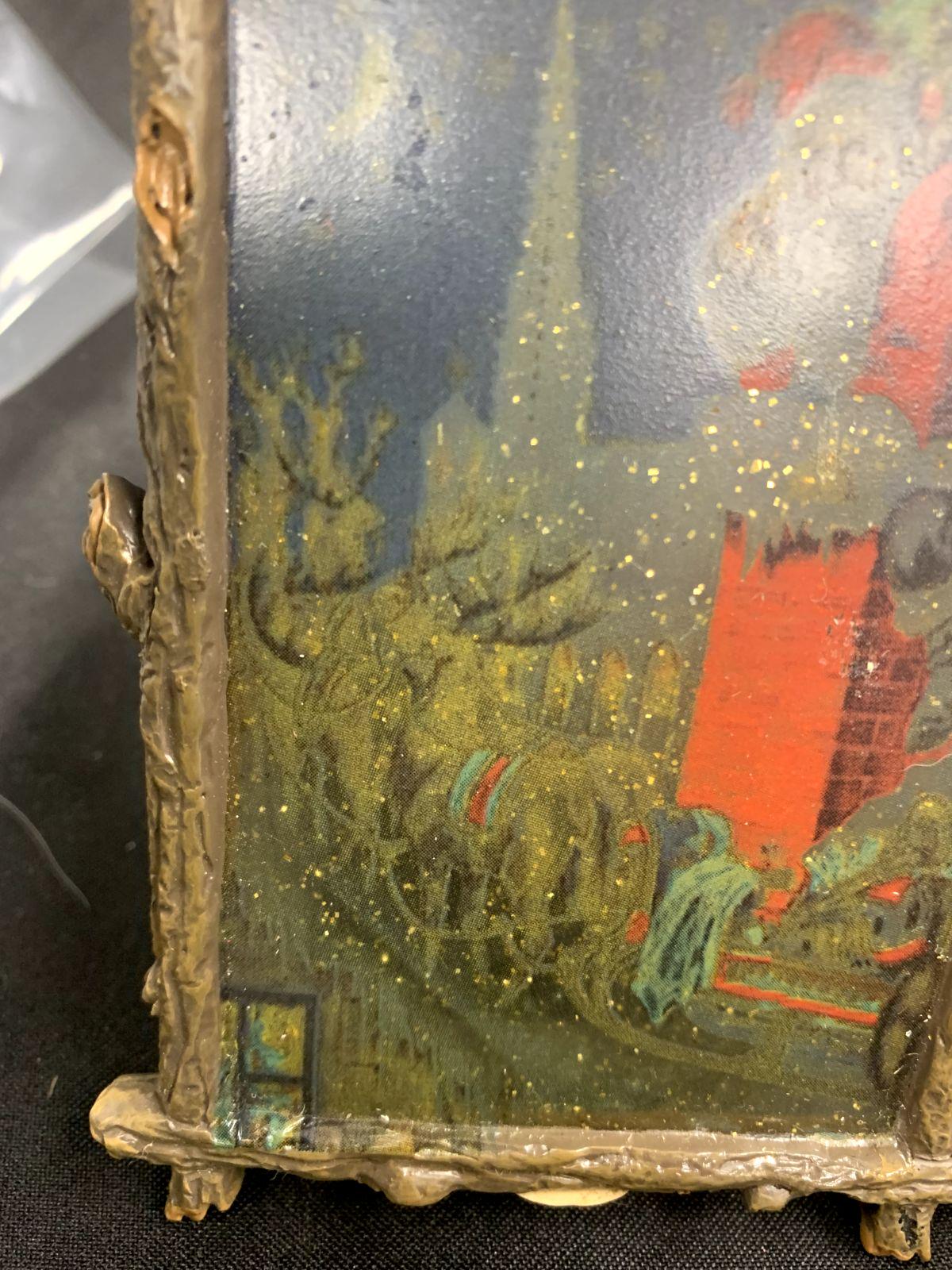 Vintage Resin and Wood Santa Claus Sleigh Chimney Framed Abstract Artwork Christmas Tree Ornament