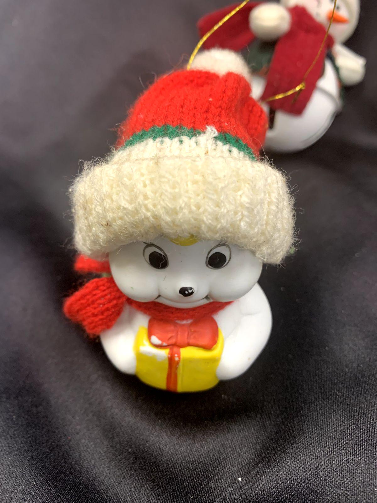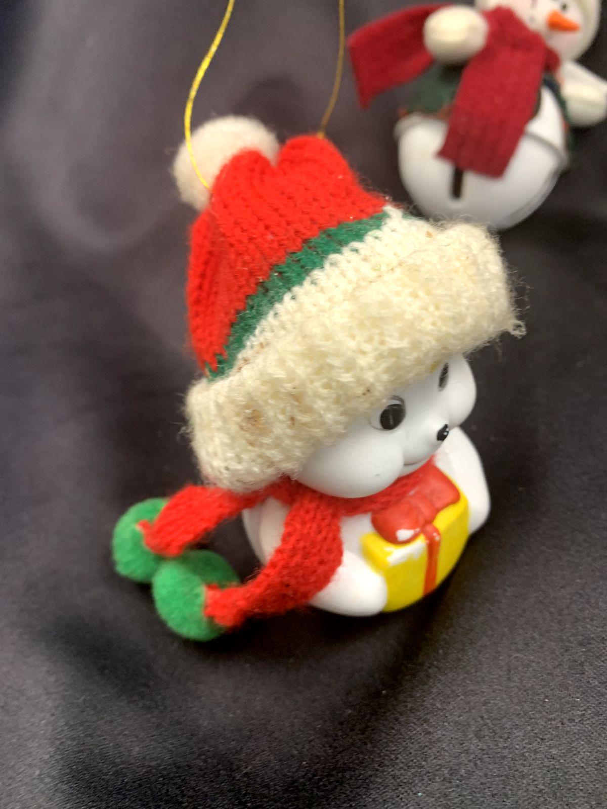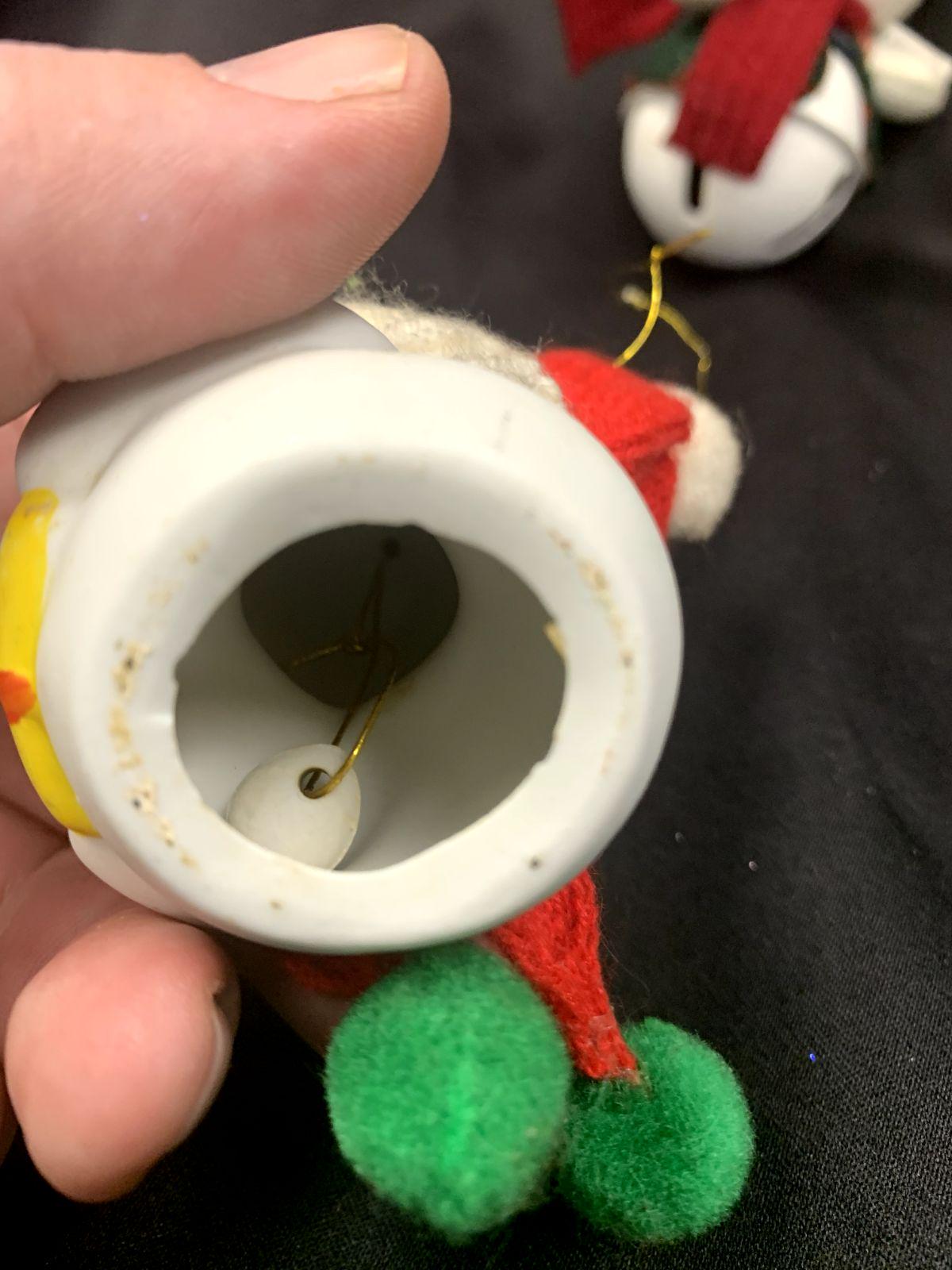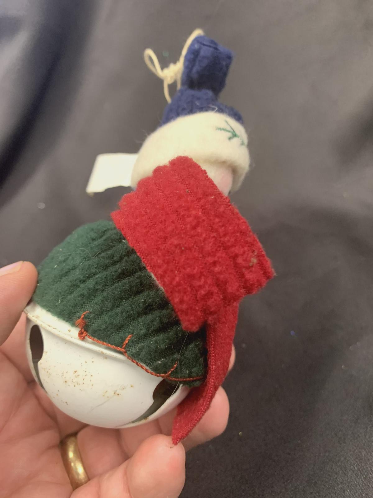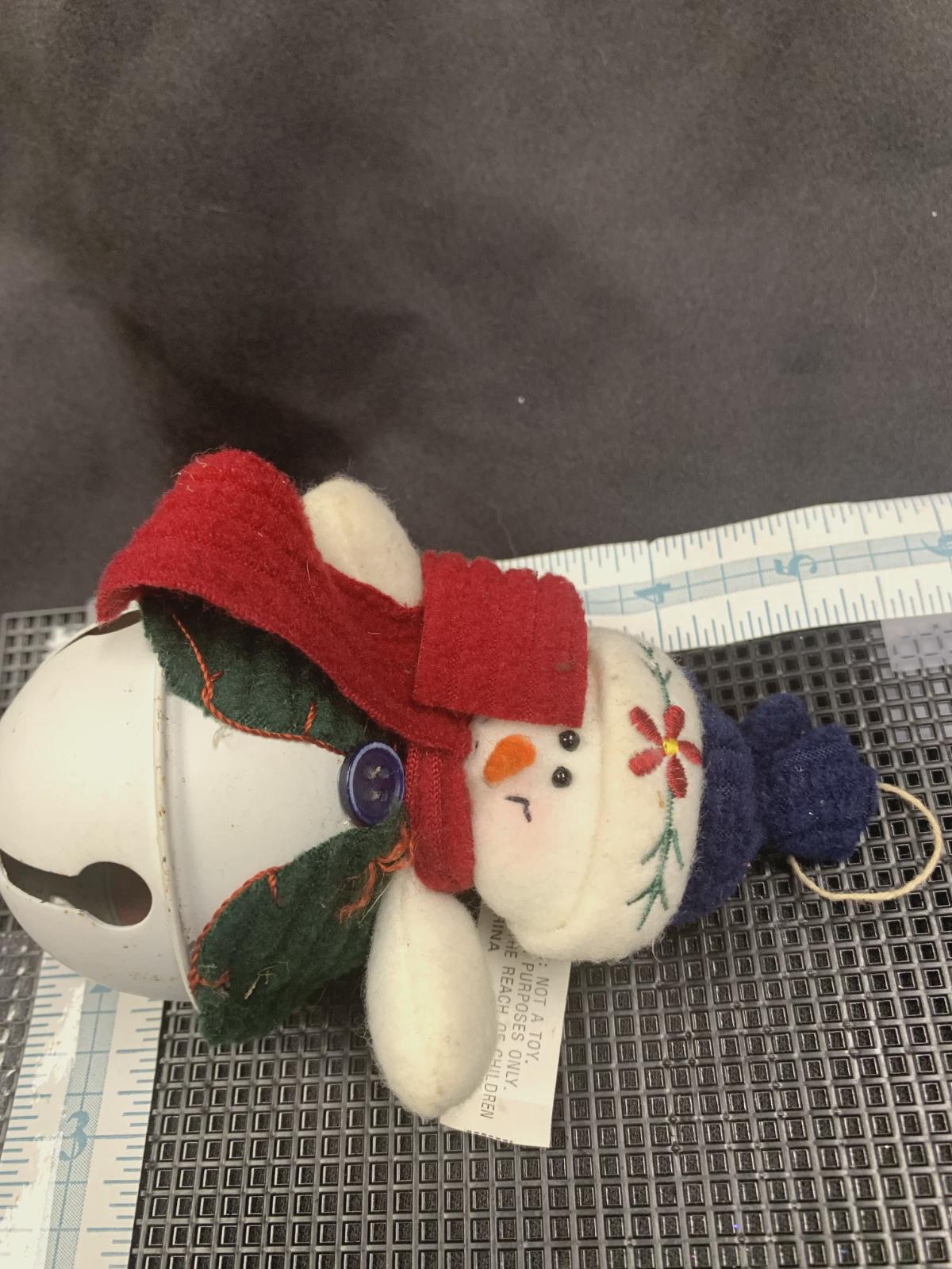 ~Soft plush snowman sitting atop a white metal bell (5" H x 2" W)