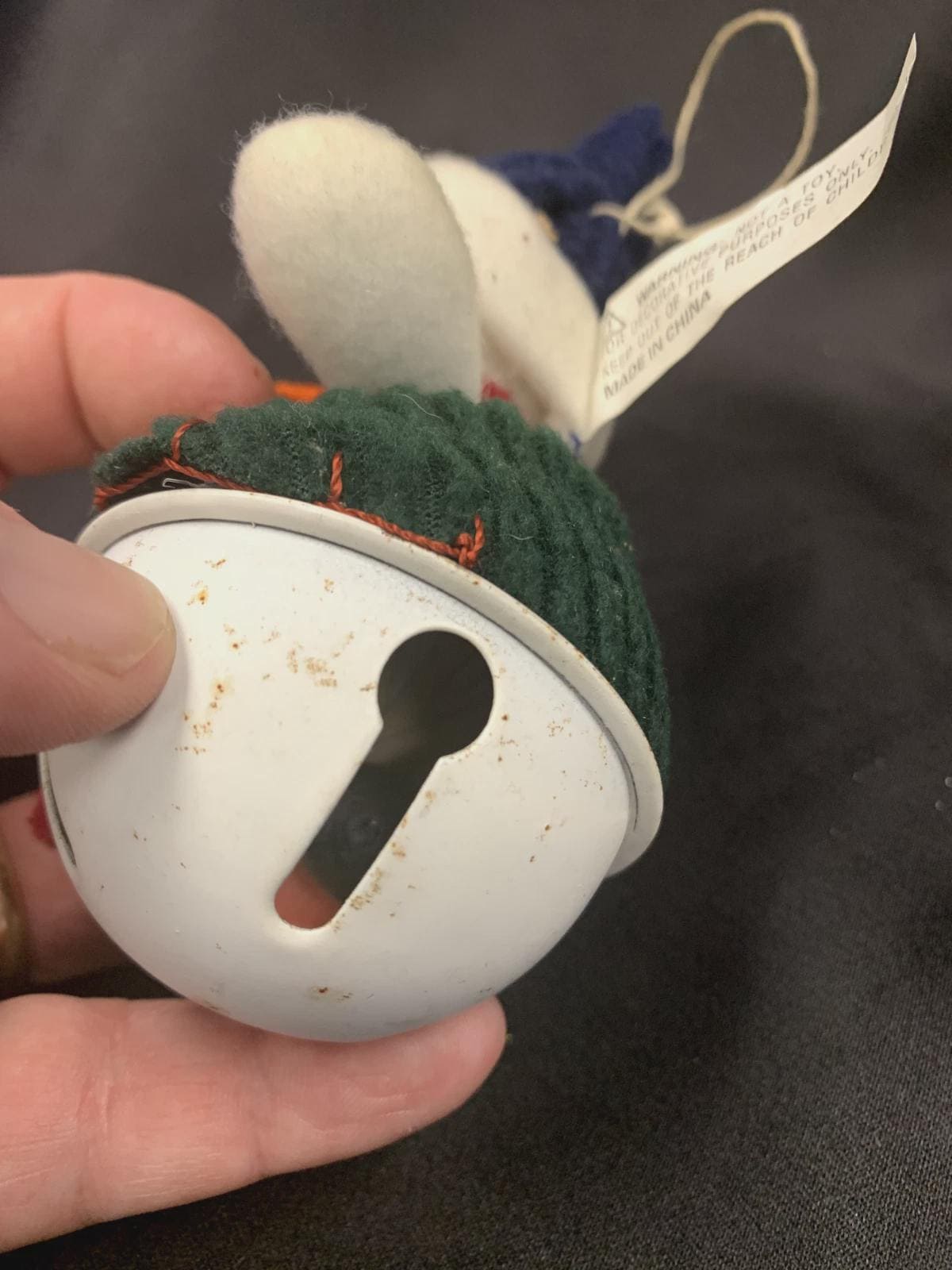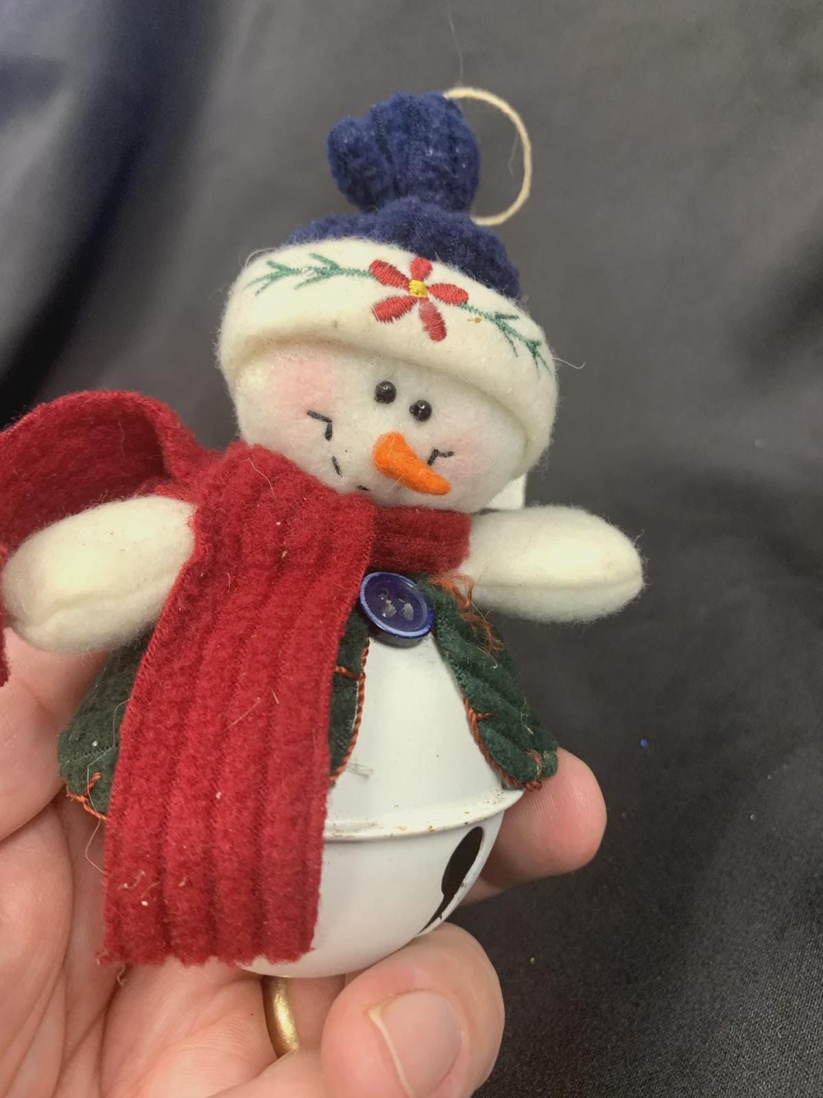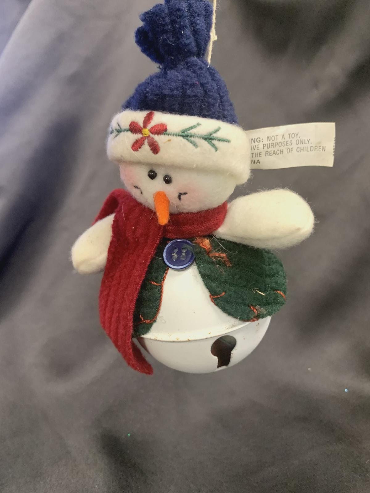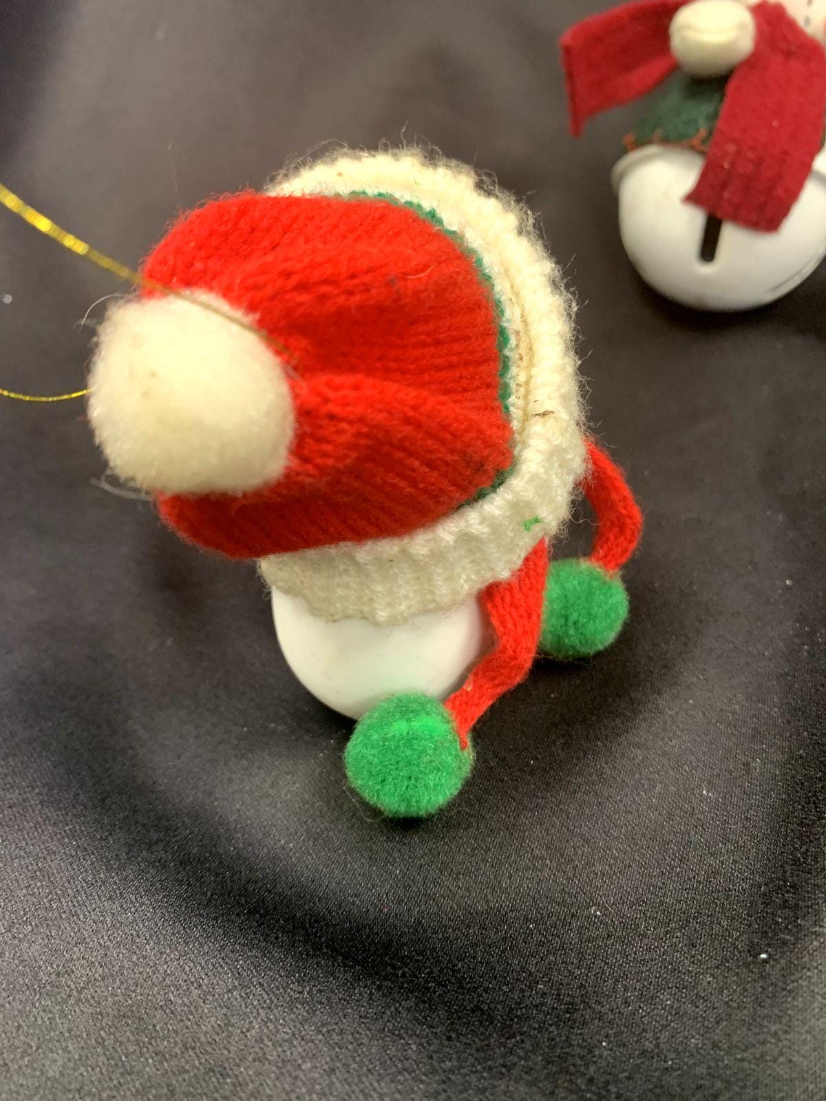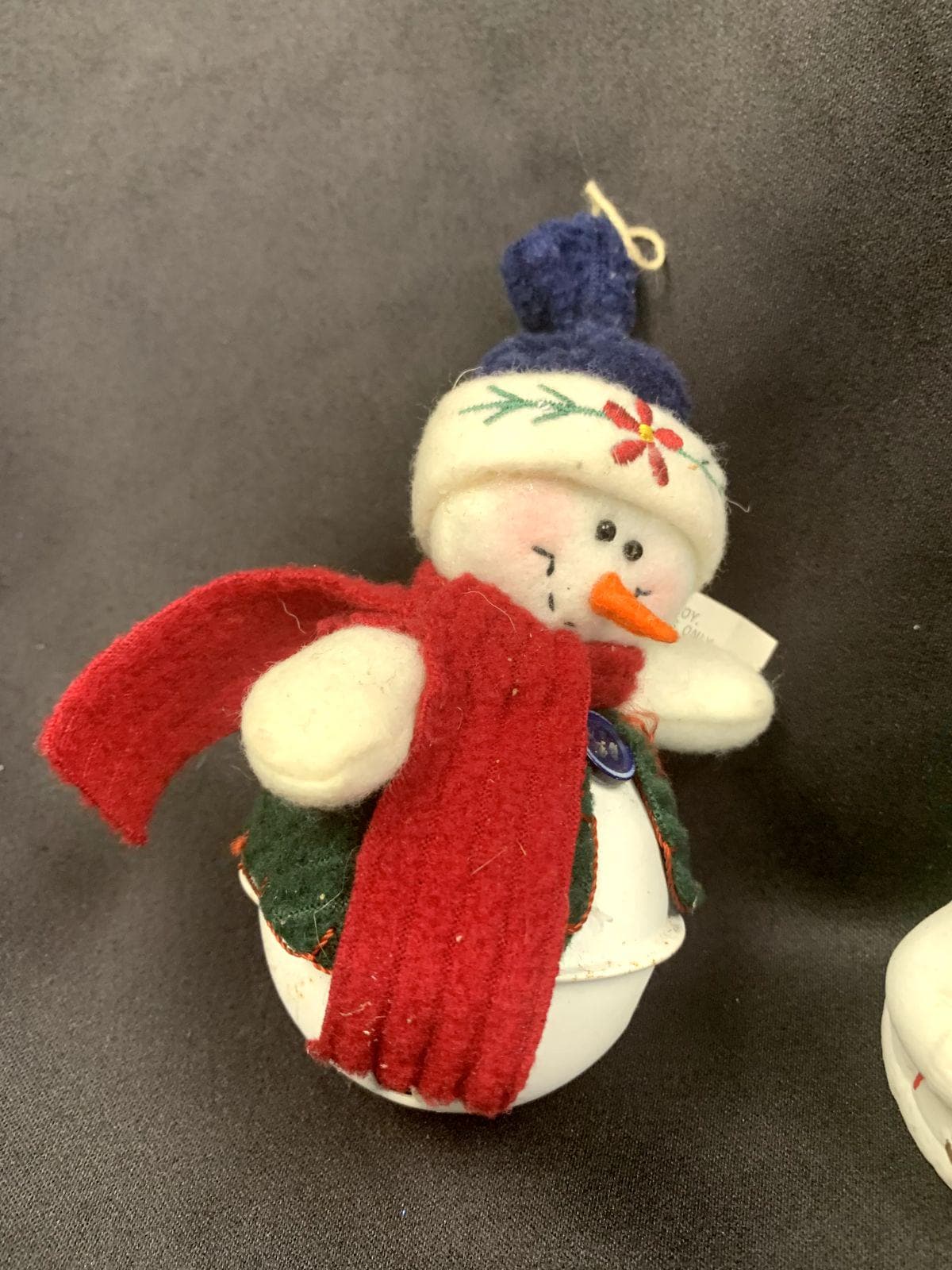 ~Soft plush snowman sitting atop a white metal bell (5" H x 2" W)