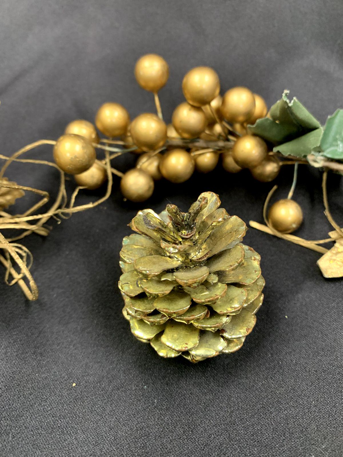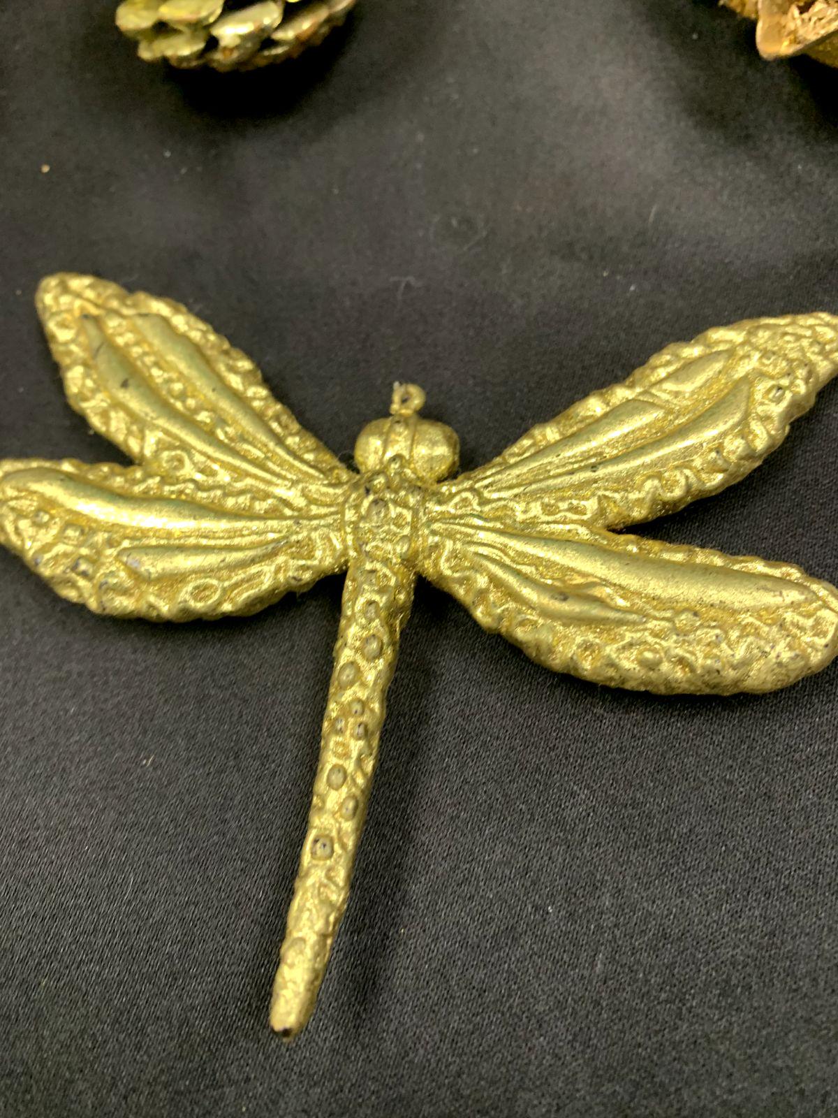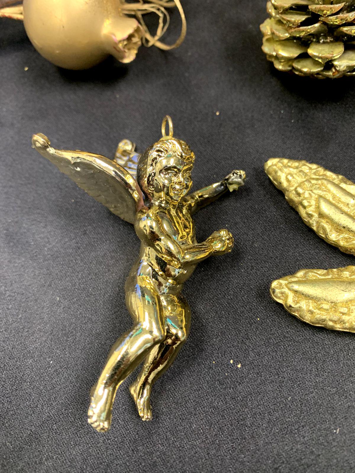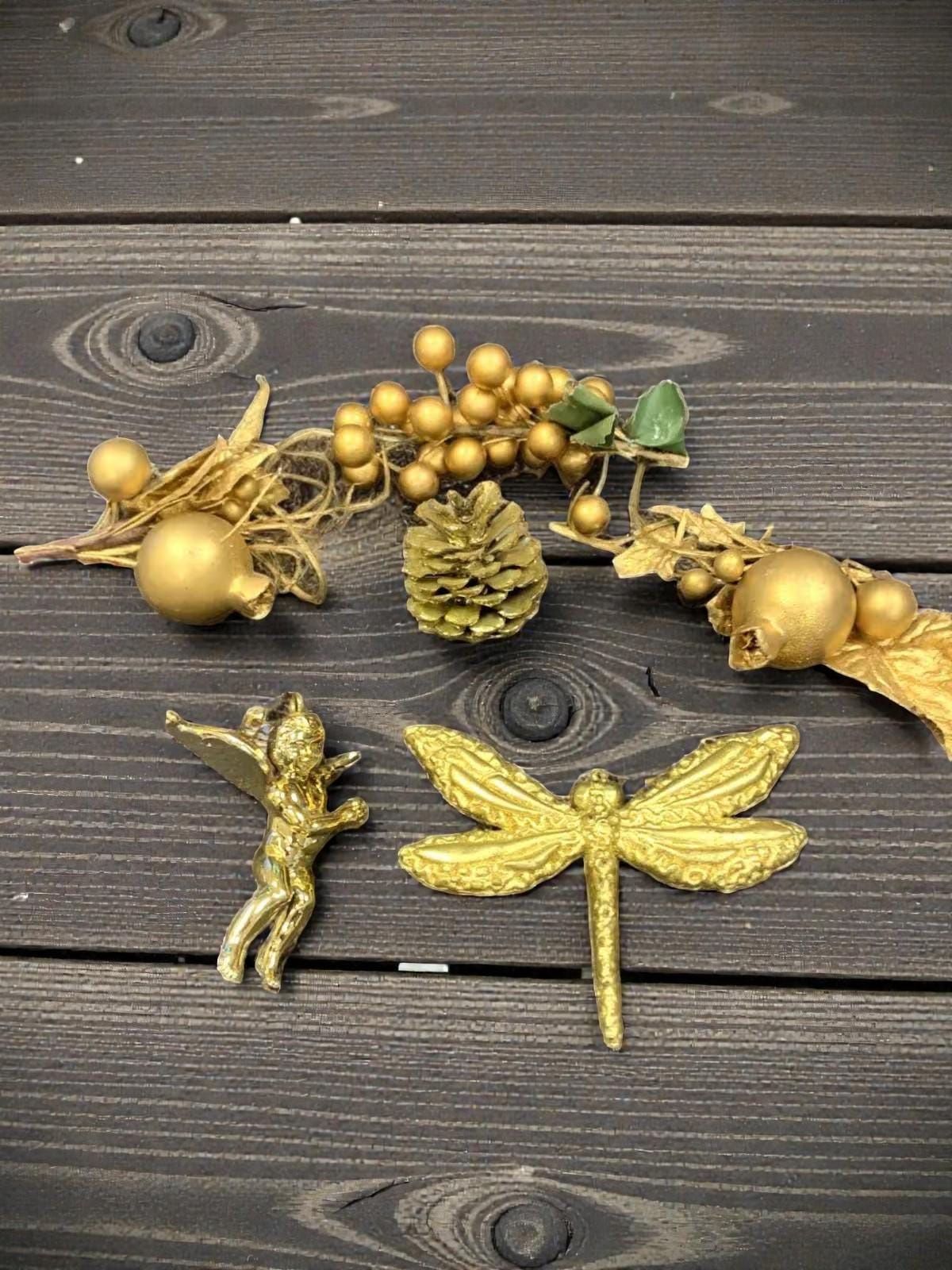 Vintage Shiny Gold Color Lightweight Plastic Christmas Tree Ornaments Dragon Fly Branches Grapes Cherub Angel and Pinecone Set of 6