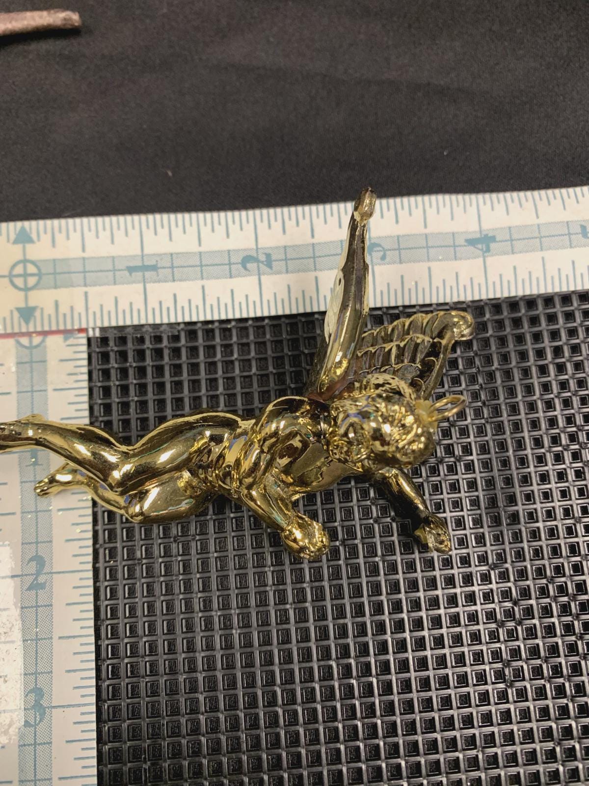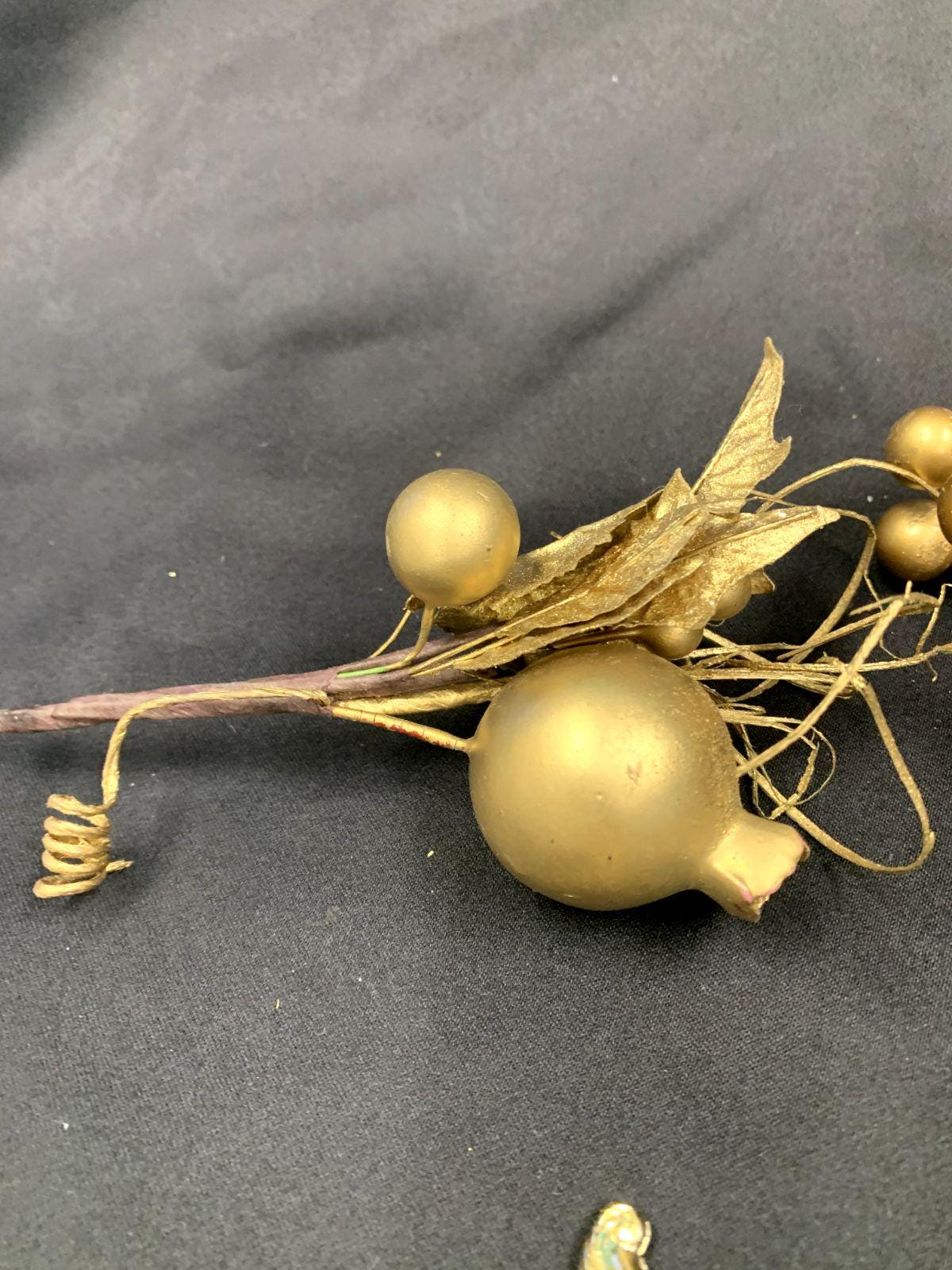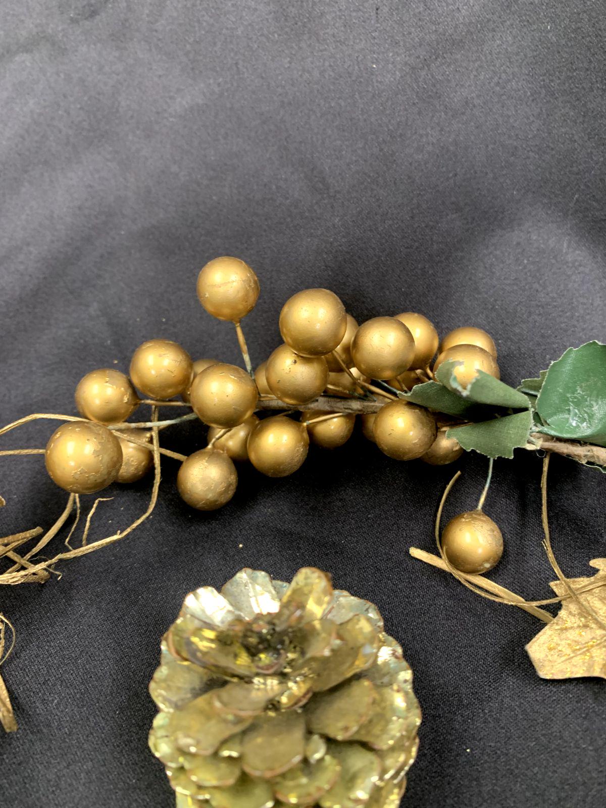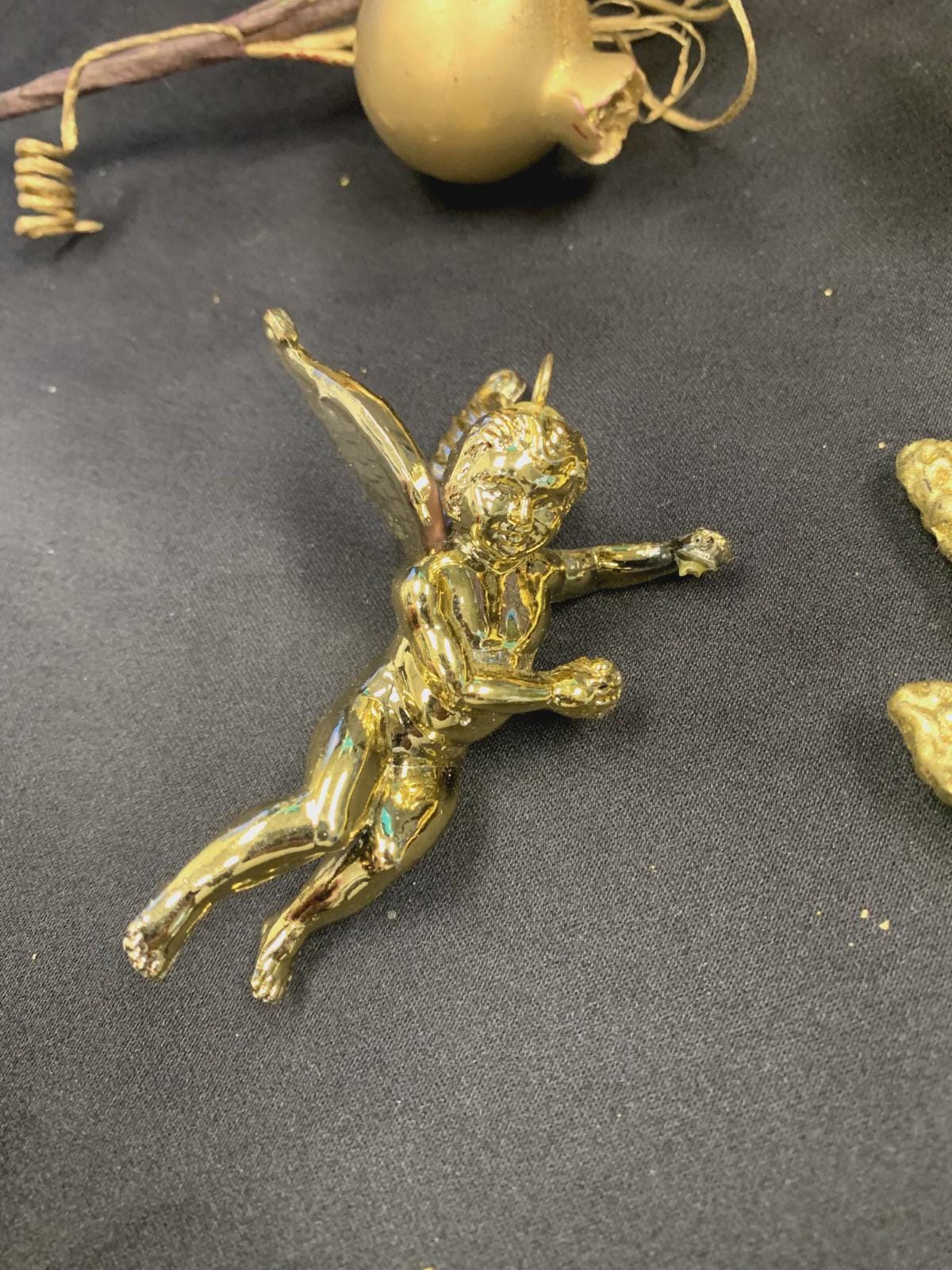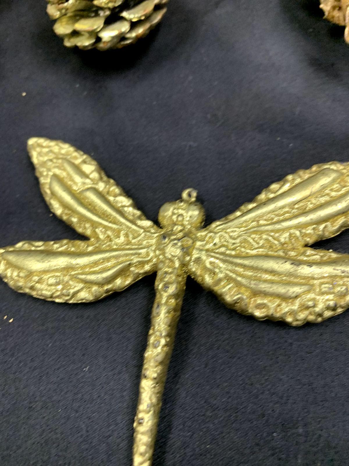 Vintage Shiny Gold Color Lightweight Plastic Christmas Tree Ornaments Dragon Fly Branches Grapes Cherub Angel and Pinecone Set of 6
