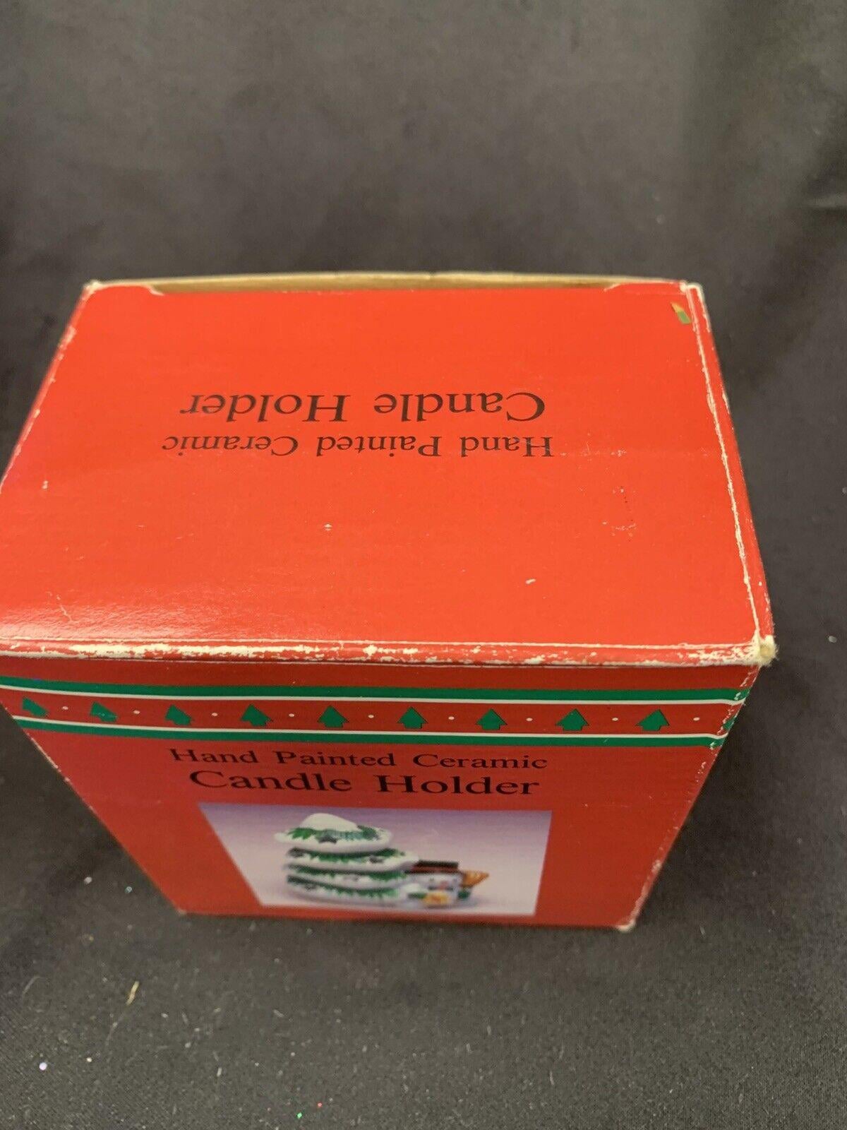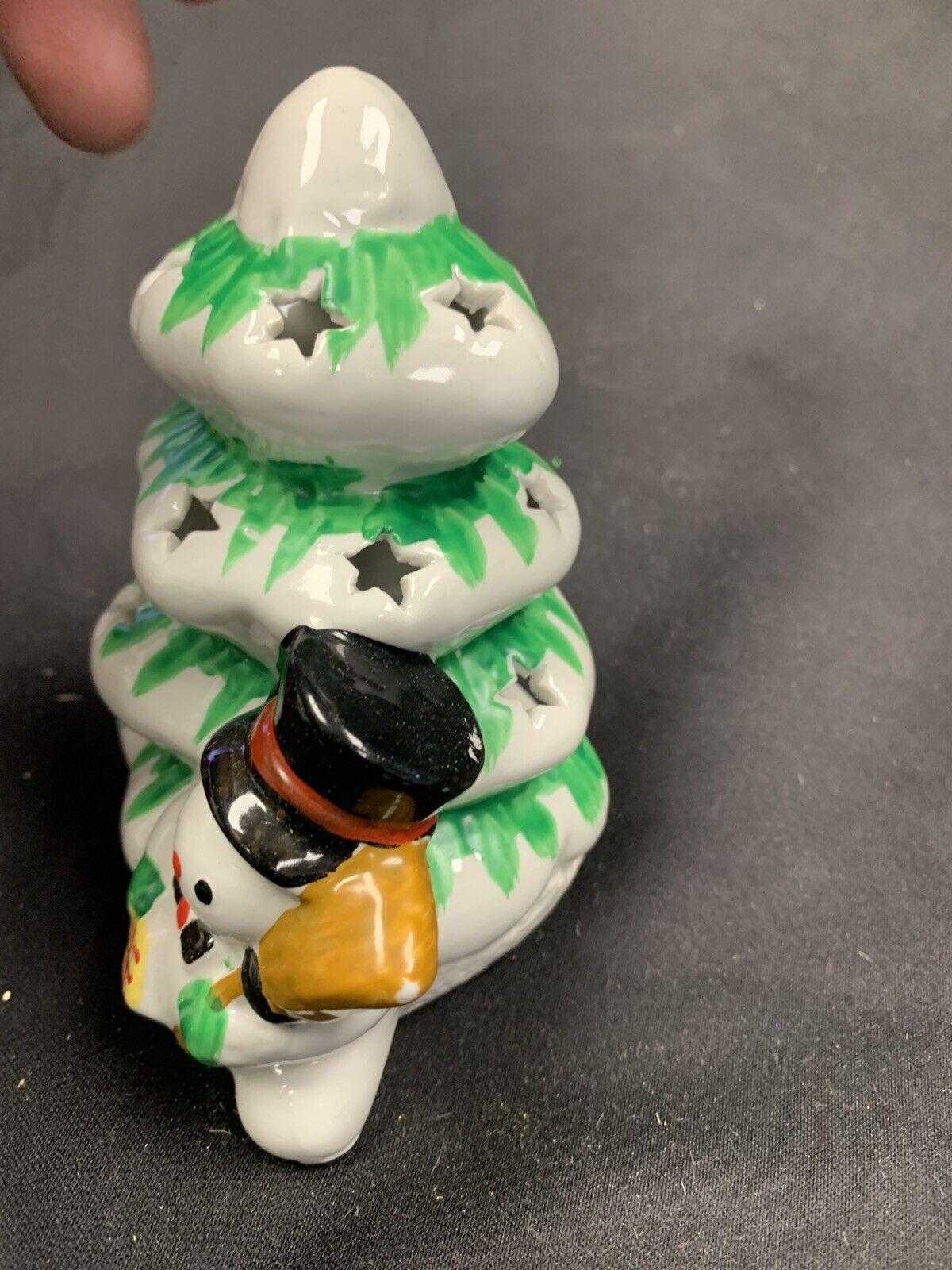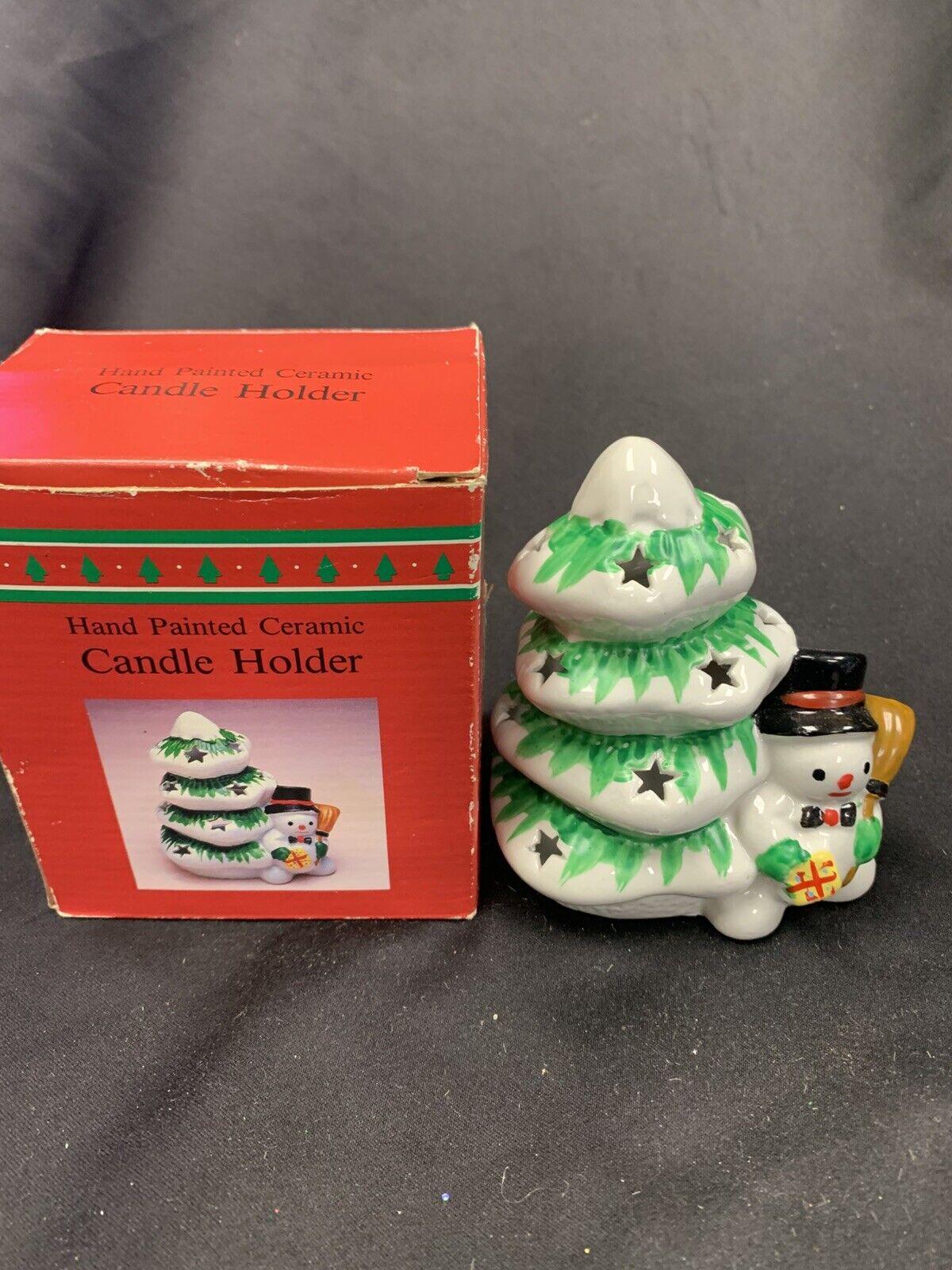 Vintage Hand Painted Ceramic Snowman Christmas Tree Tea Light Candleholder In Original Box