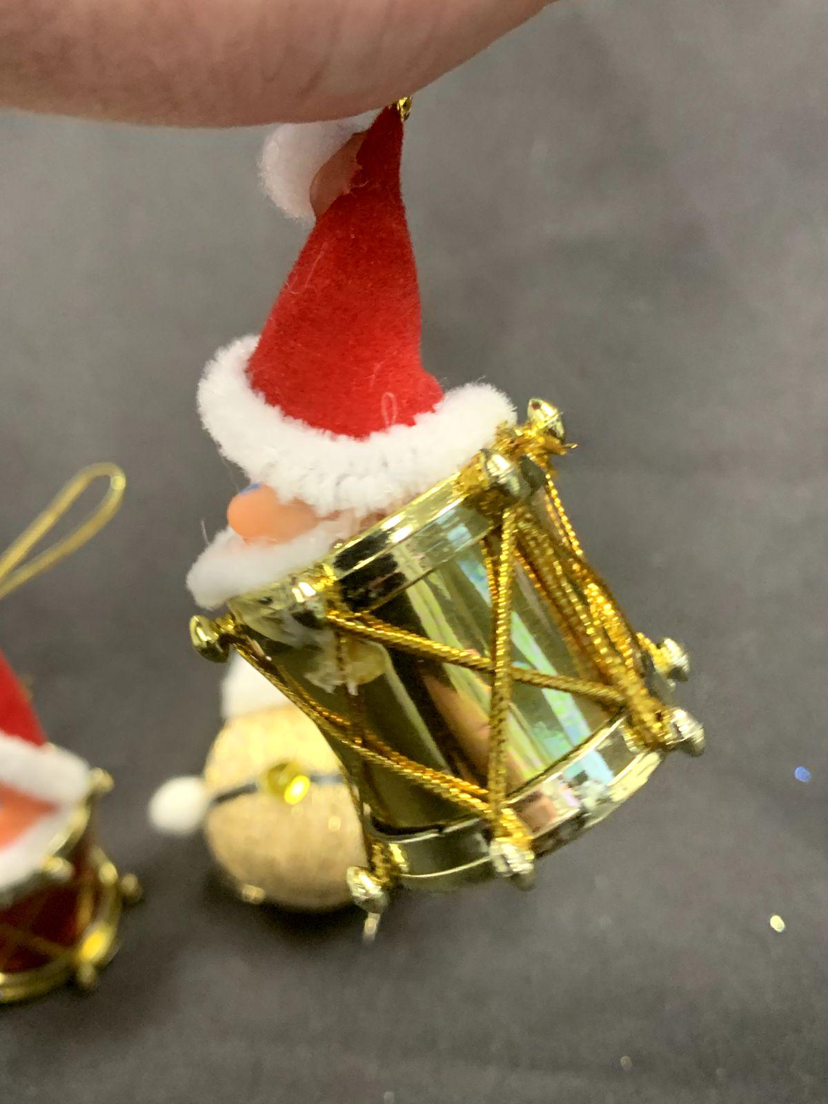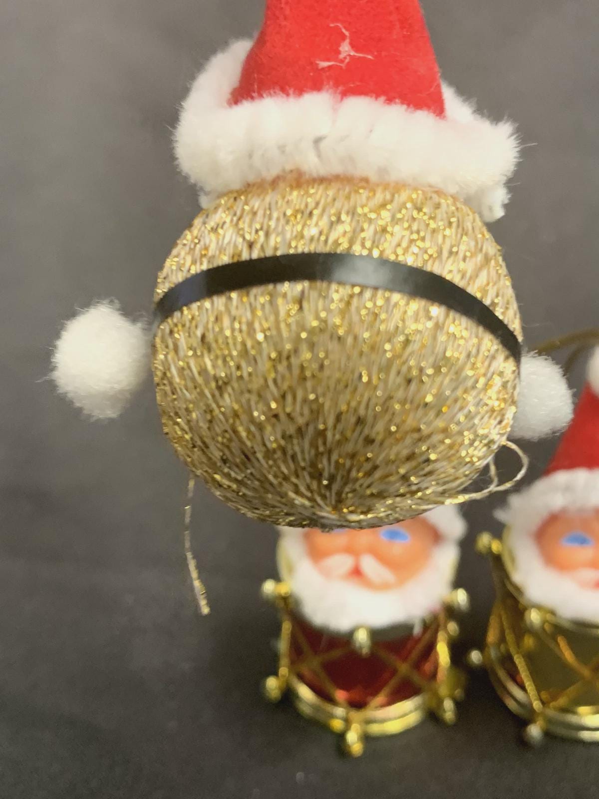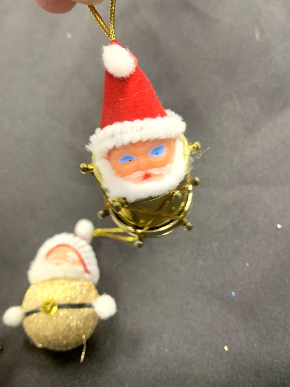 Two Santa heads with drum bodies and one Santa head with a round glitter body.