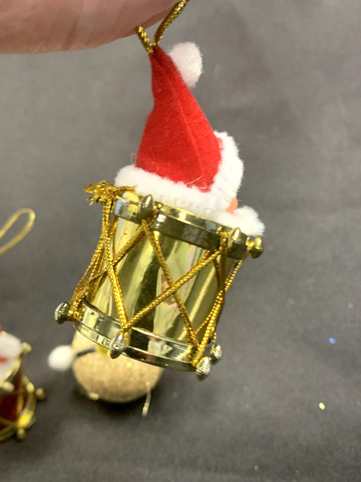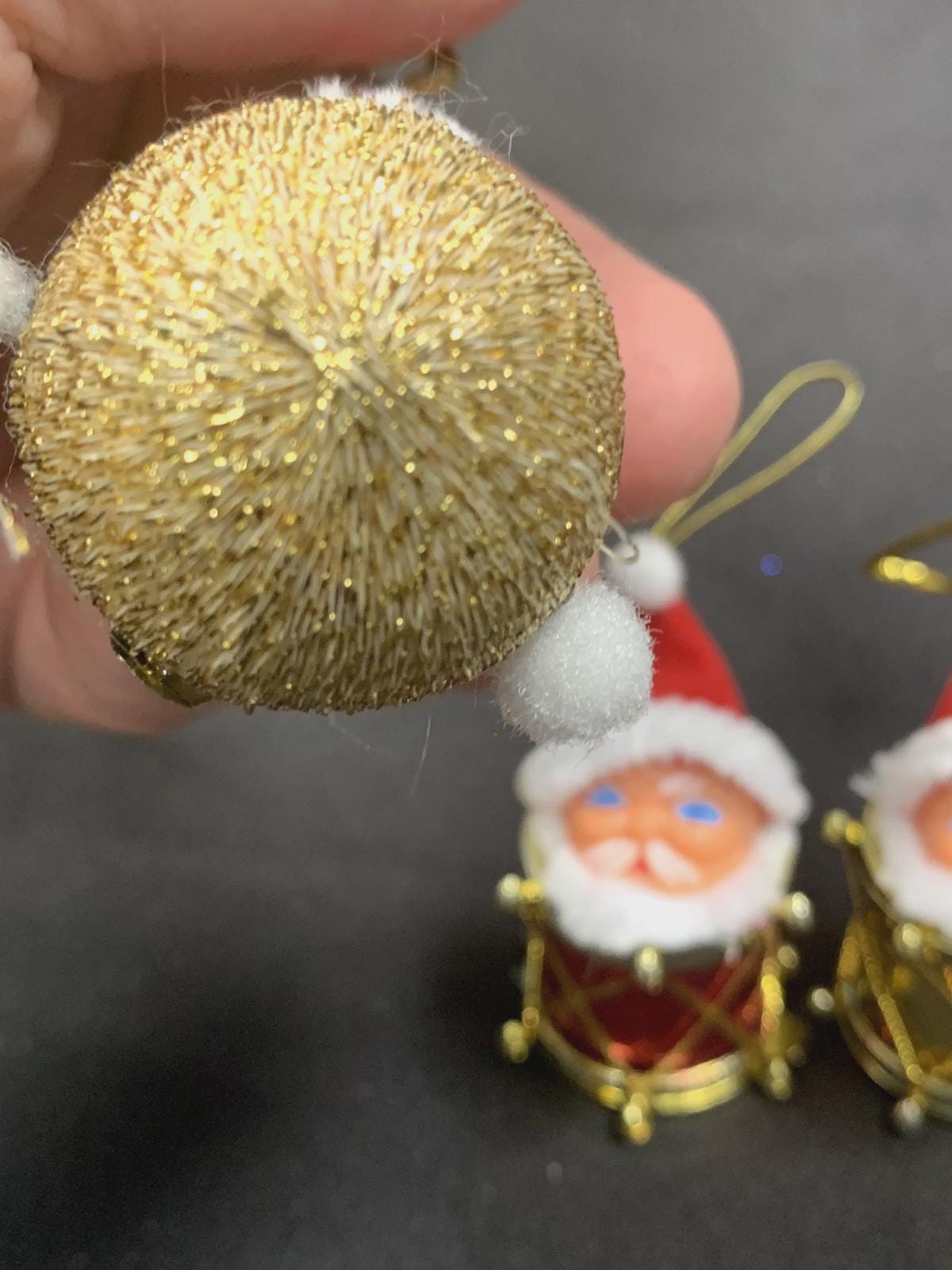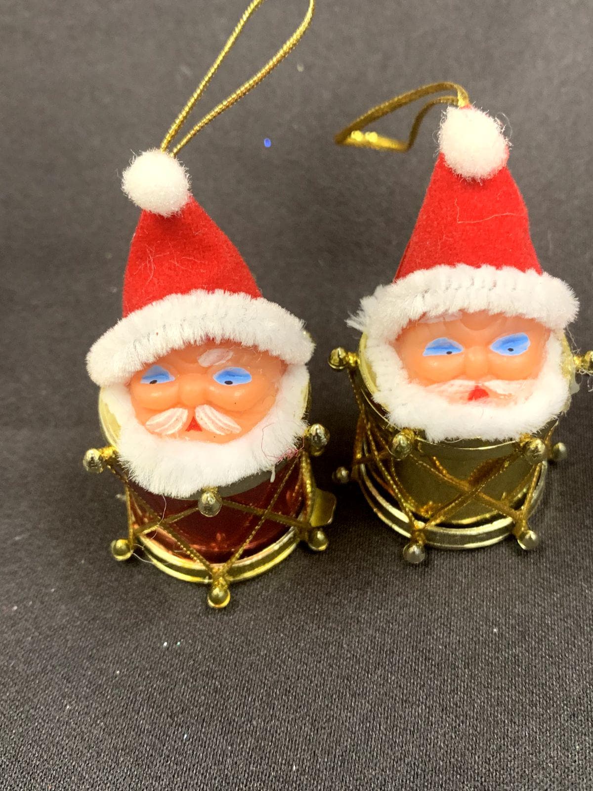 Two Santa heads with drum bodies and one Santa head with a round glitter body.