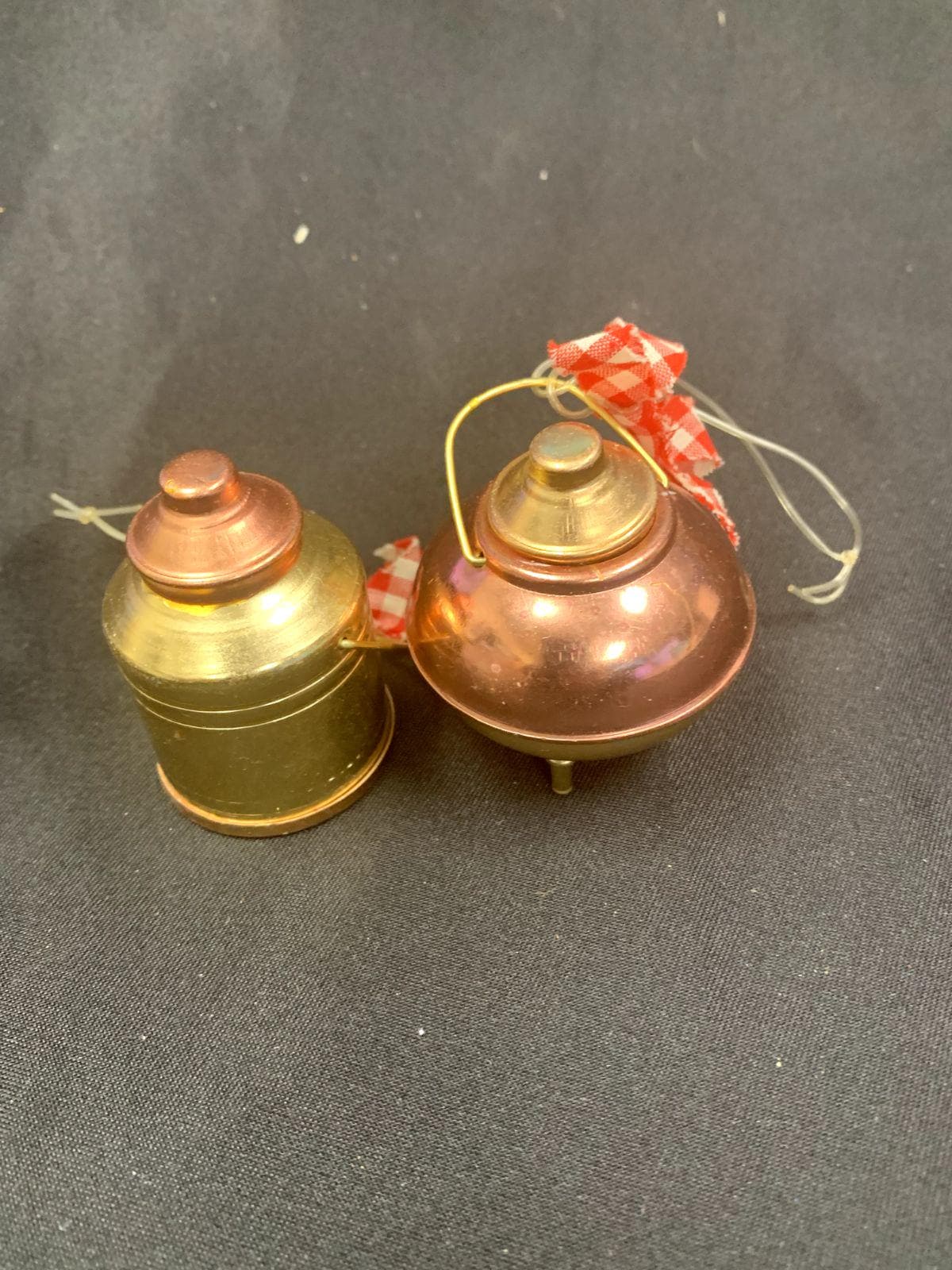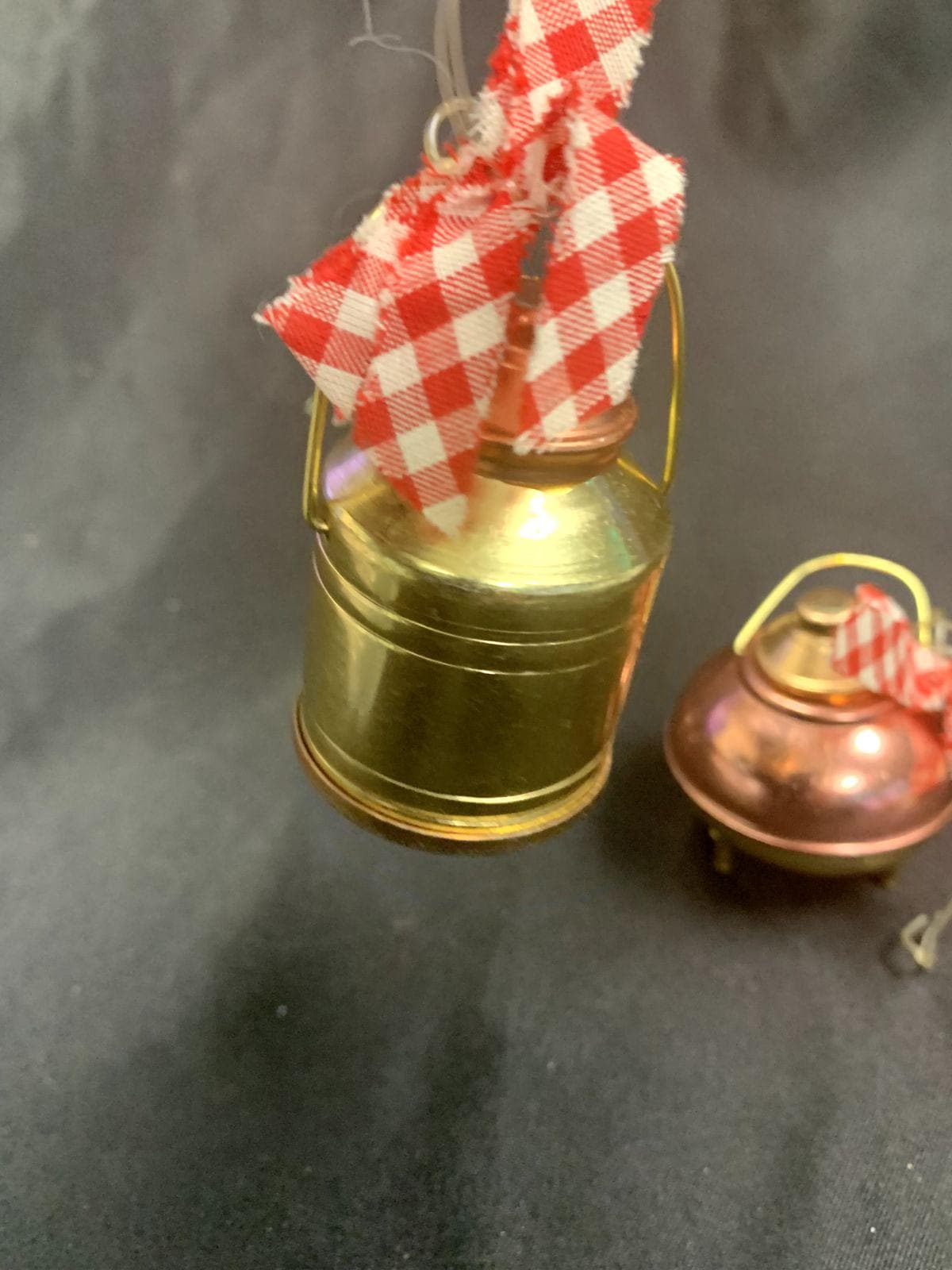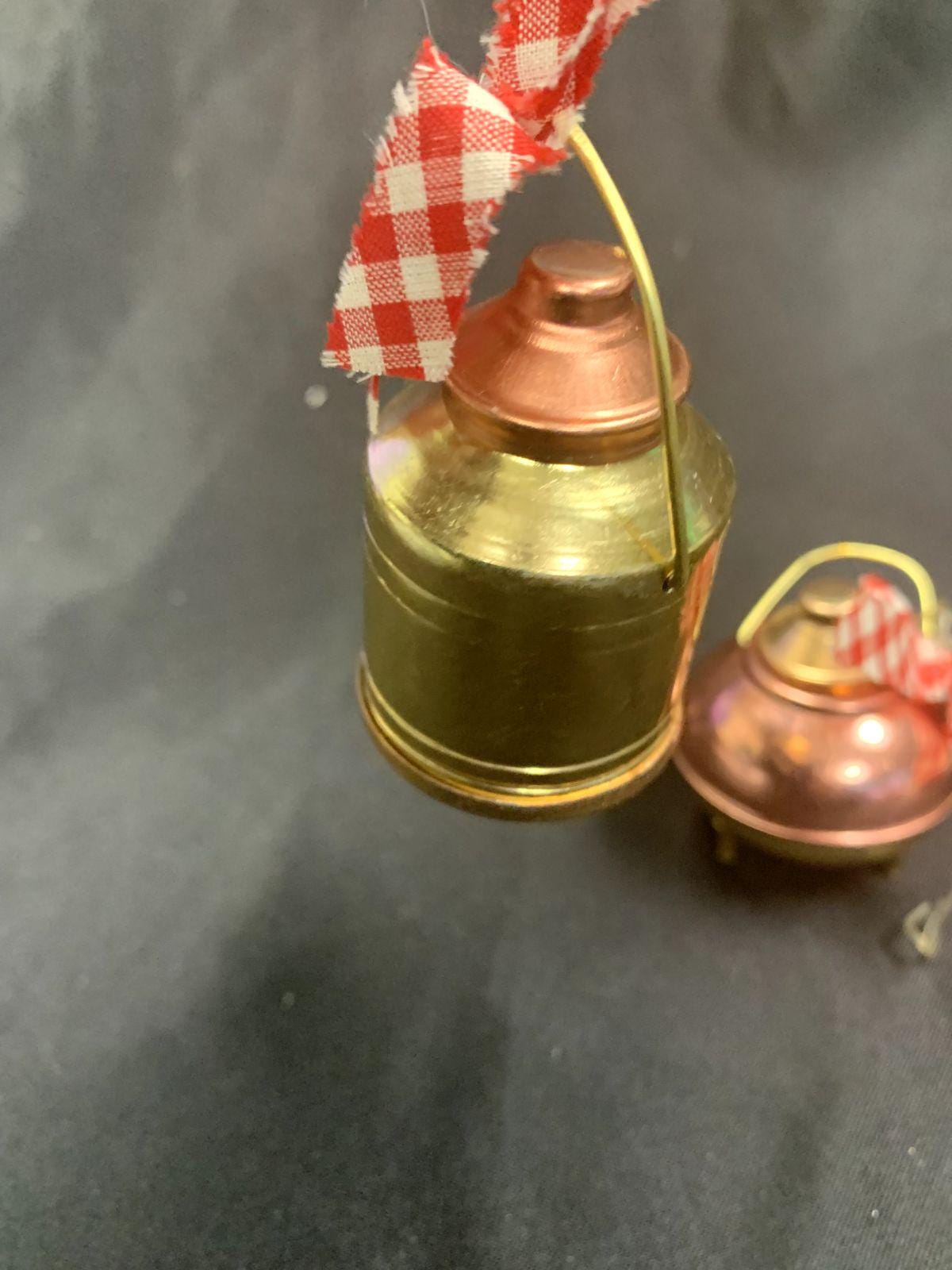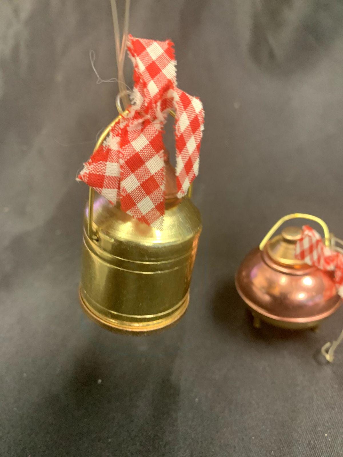 Vintage Rustic Farmhouse Gold/Copper Metal Milk Cans With Red Gingham Bows Christmas Tree Ornaments Set of 2
