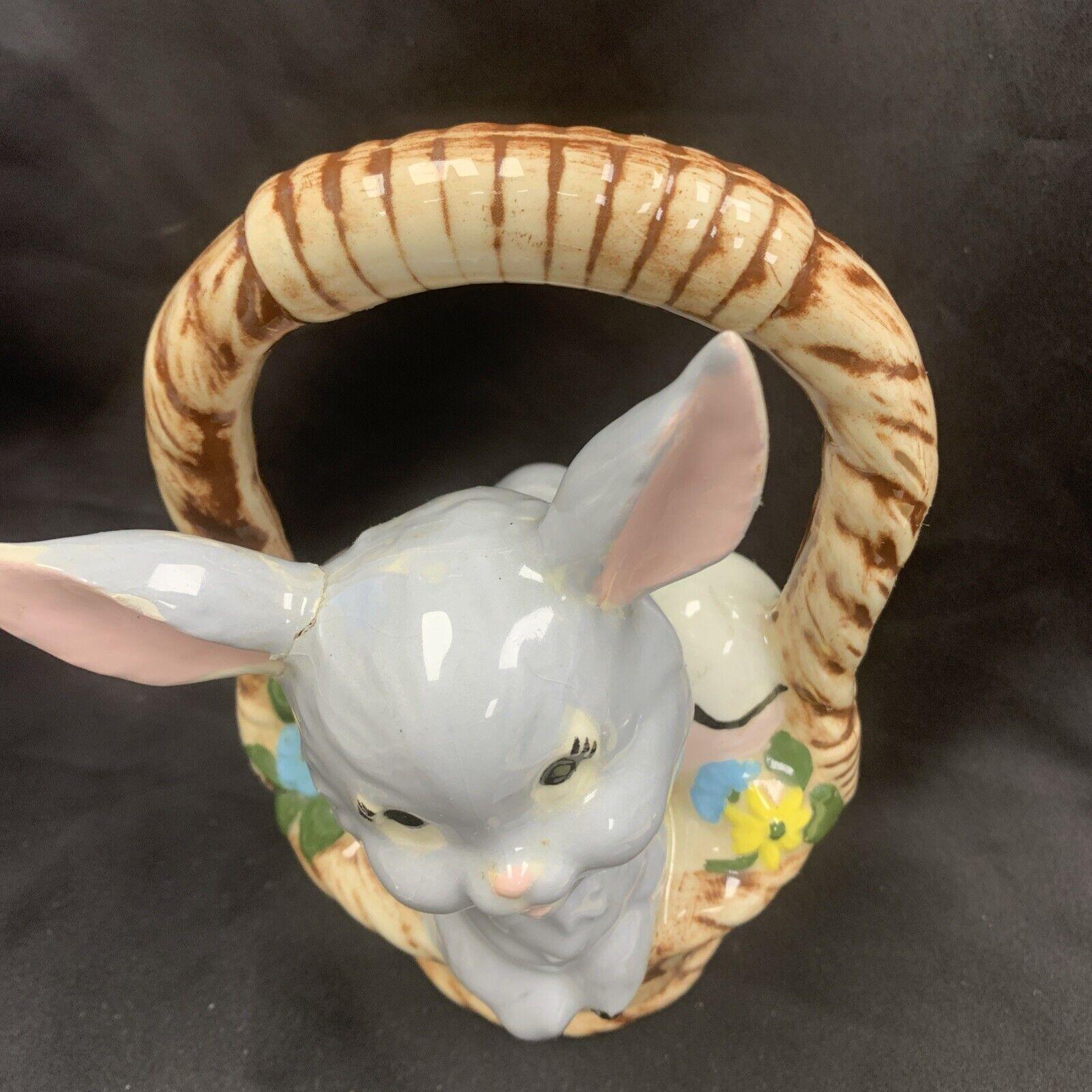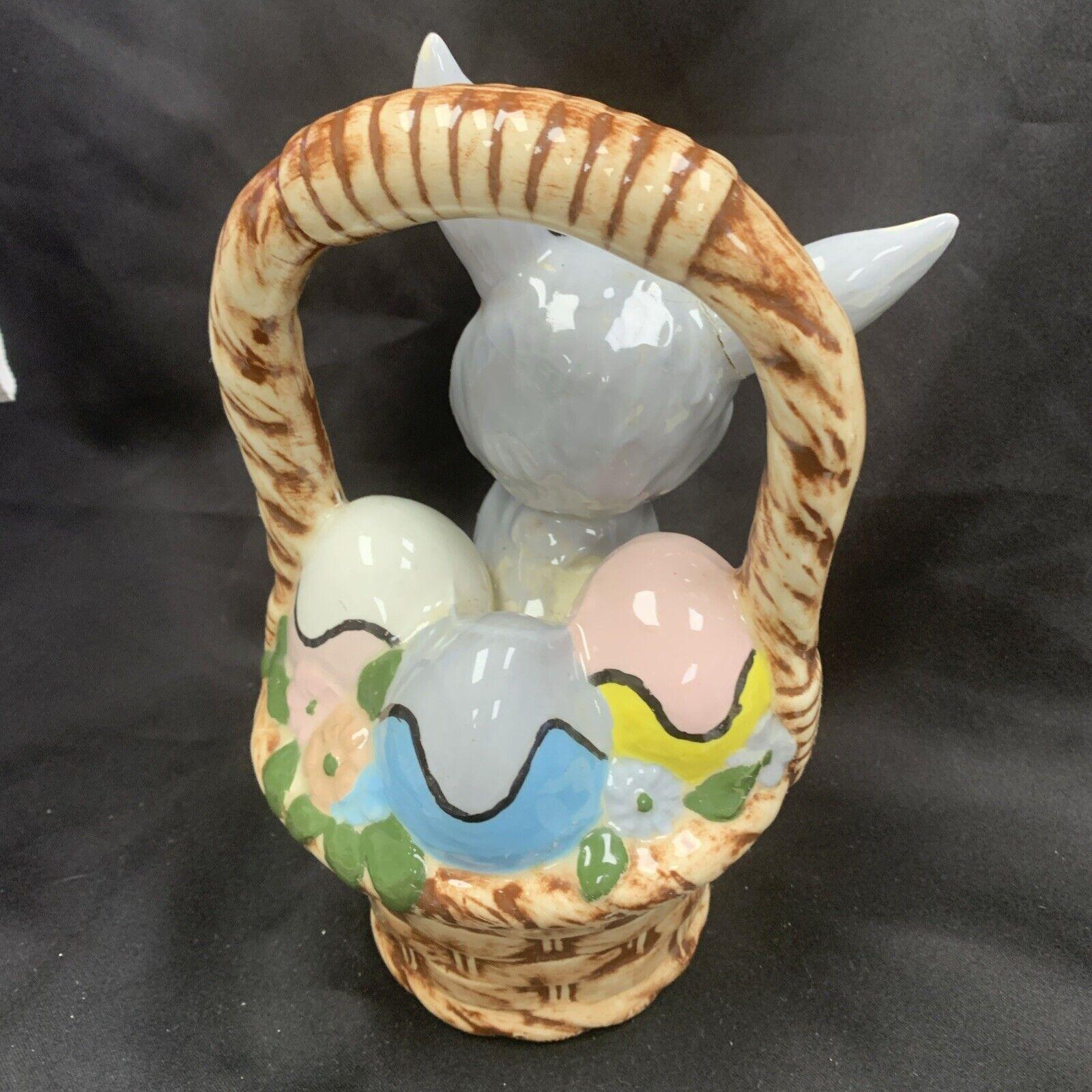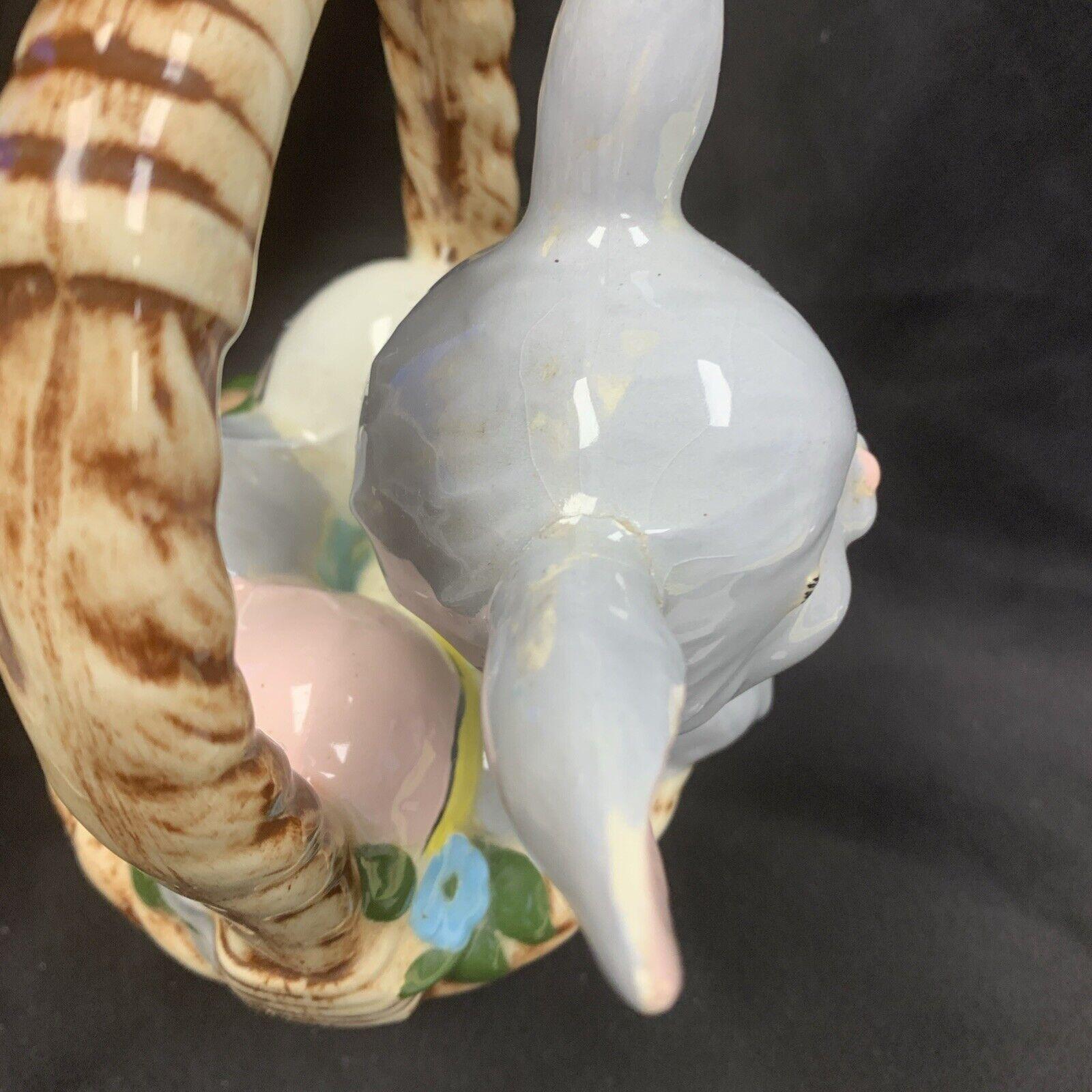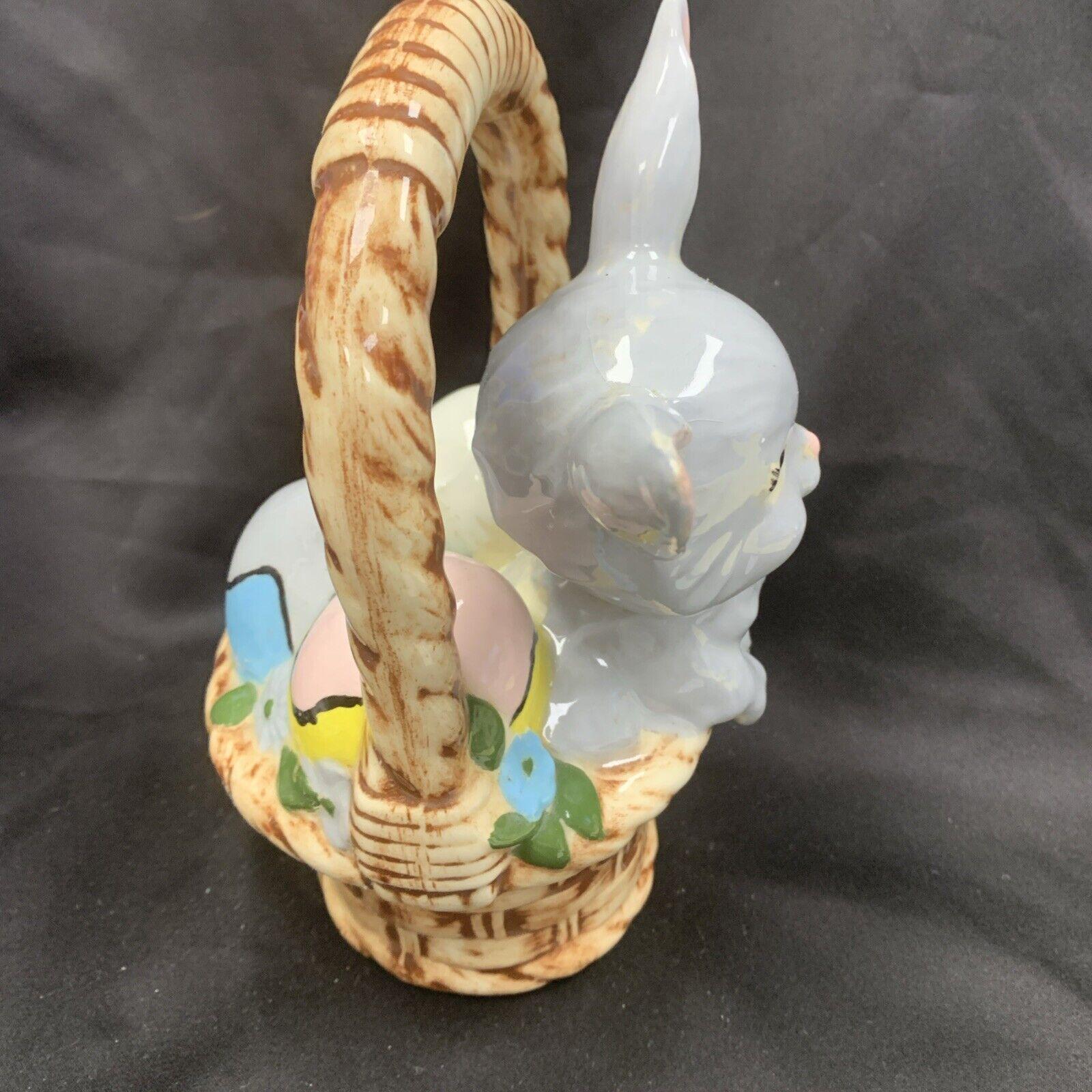 Vintage Hand-Painted White Easter Bunny Rabbit Basket Candy/Treat Basket Trinket Box Figurine for Spring