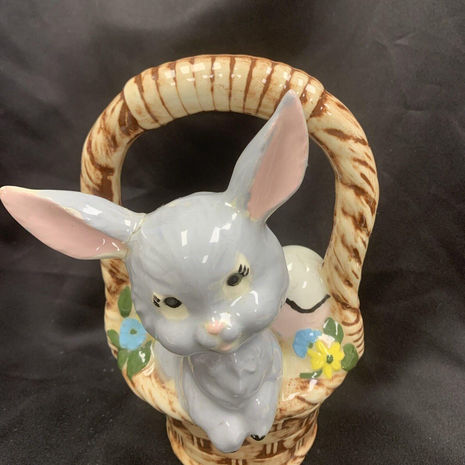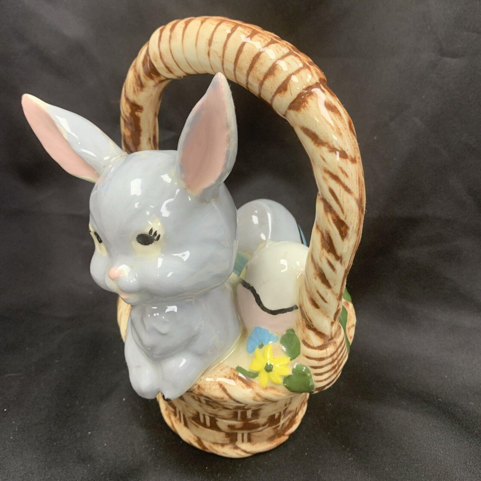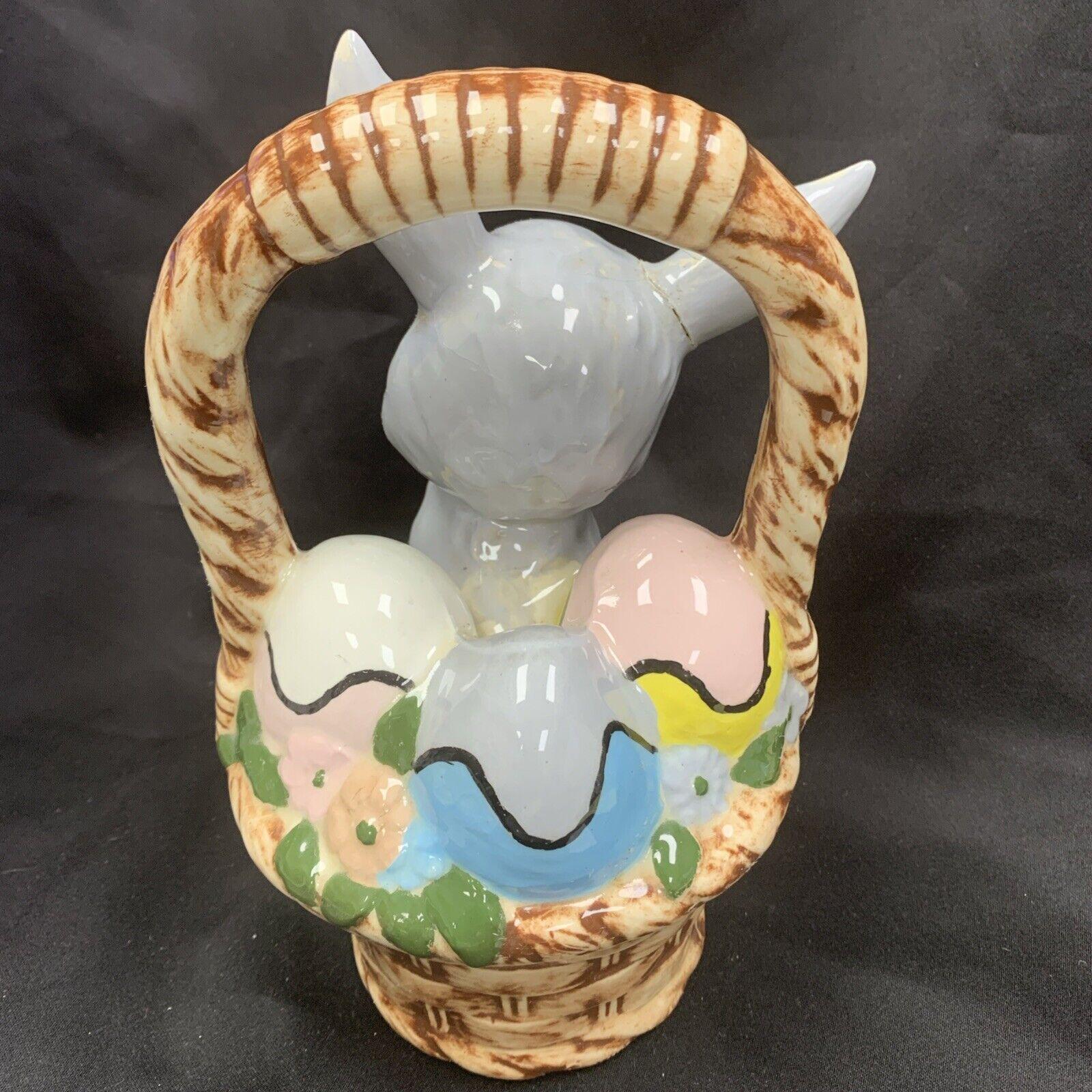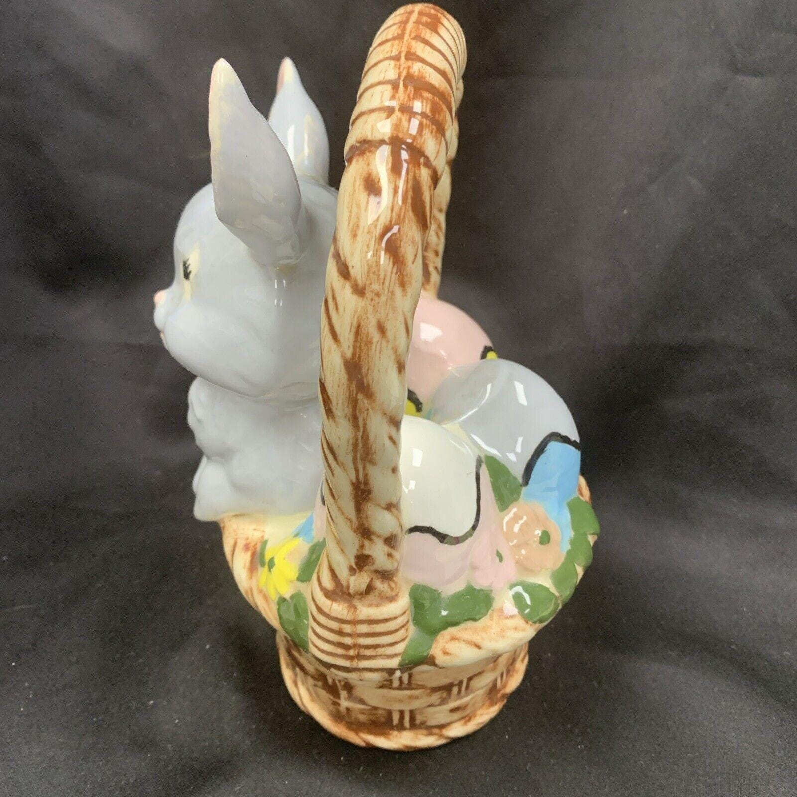 Vintage Hand-Painted White Easter Bunny Rabbit Basket Candy/Treat Basket Trinket Box Figurine for Spring