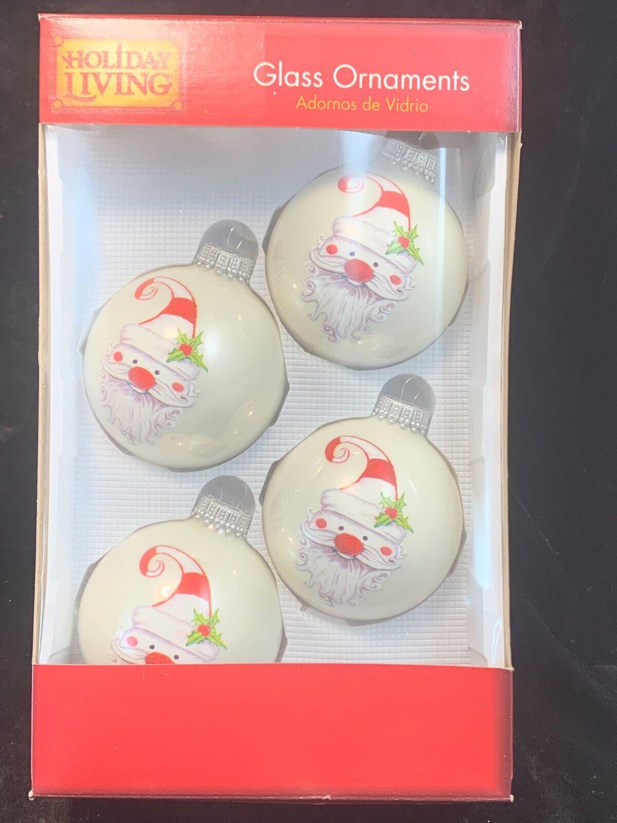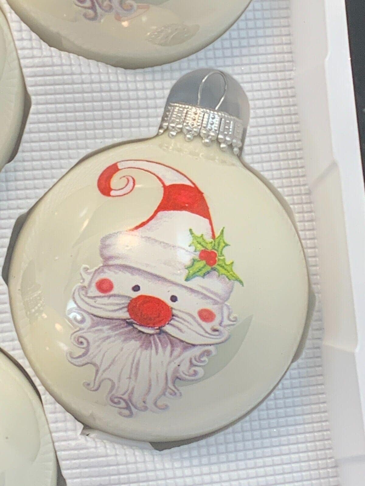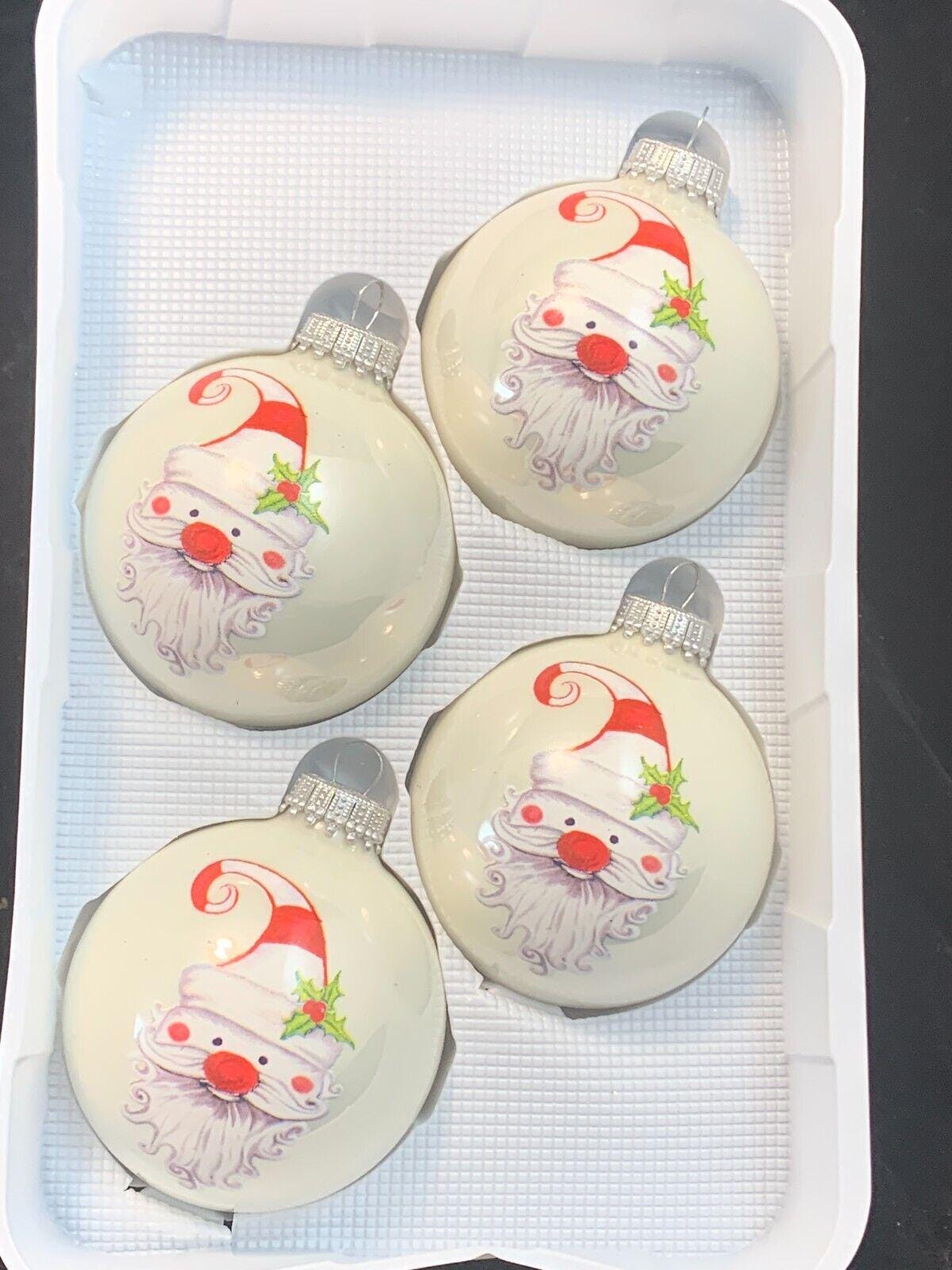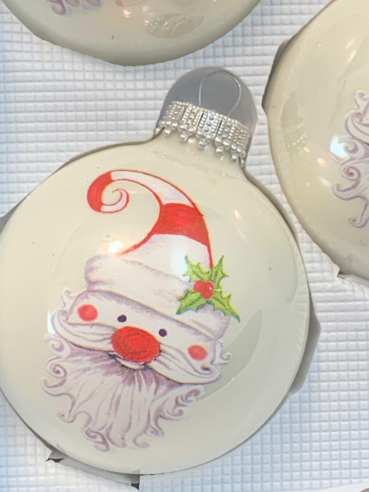 Vintage Holiday Living By Krebs Round White Whimsical St. Nick Santa Claus Glass Bulb or Ball Christmas Tree Ornament Set of 4