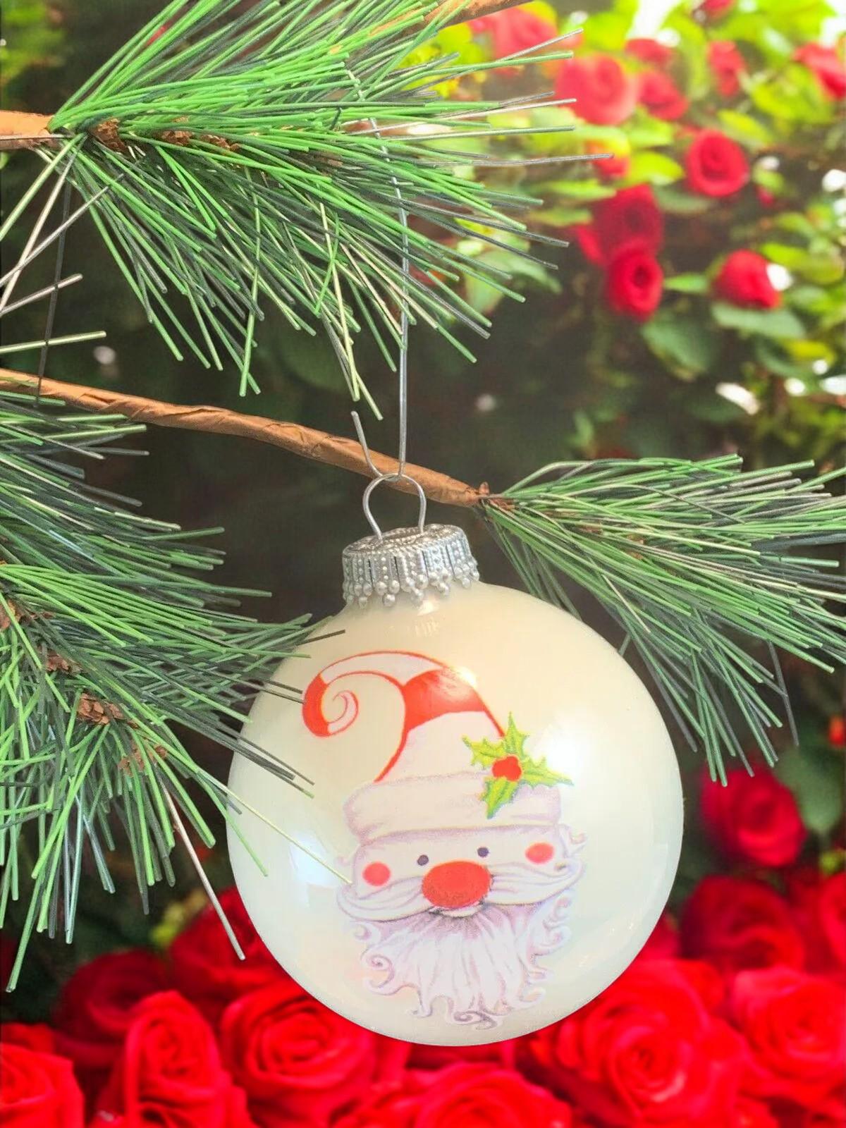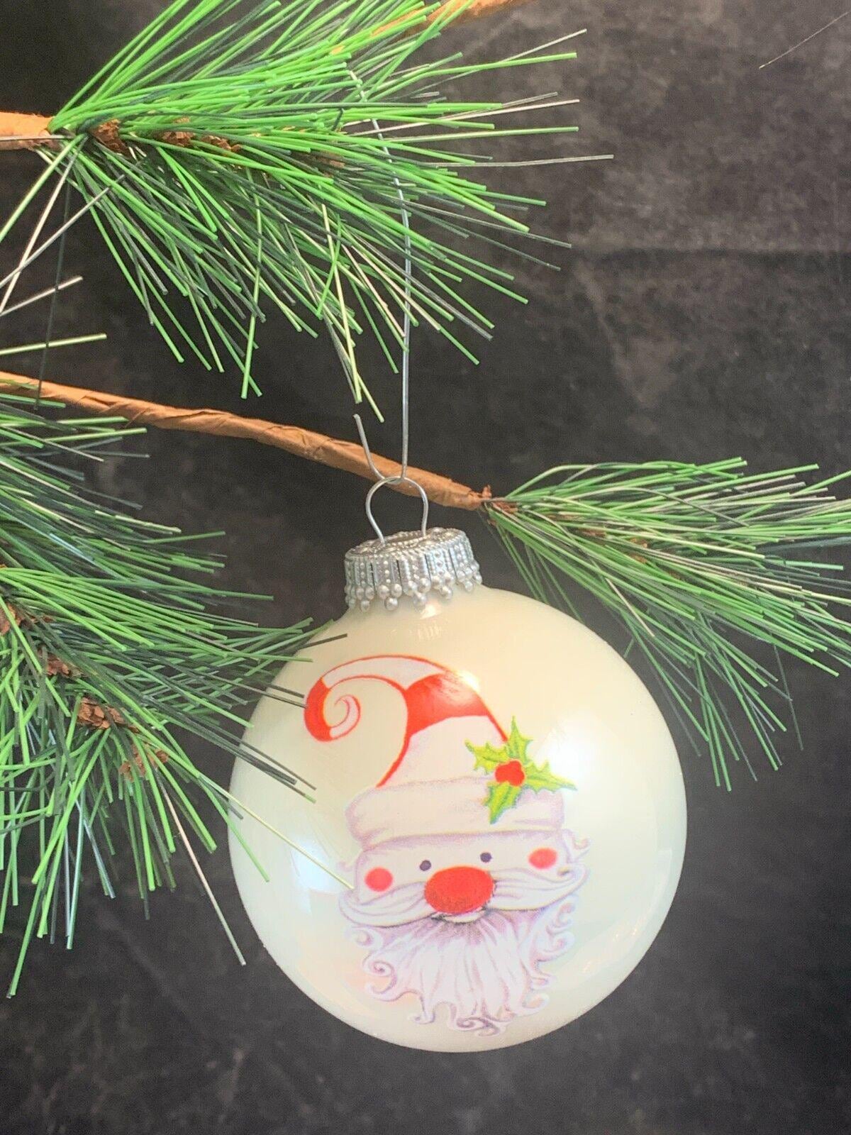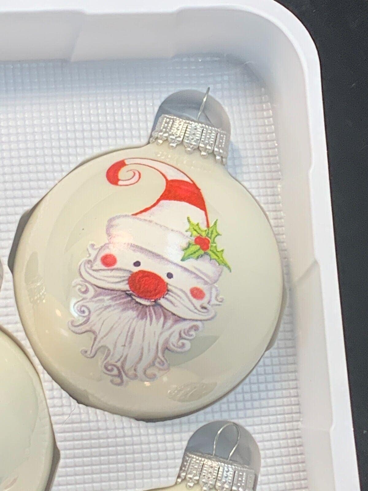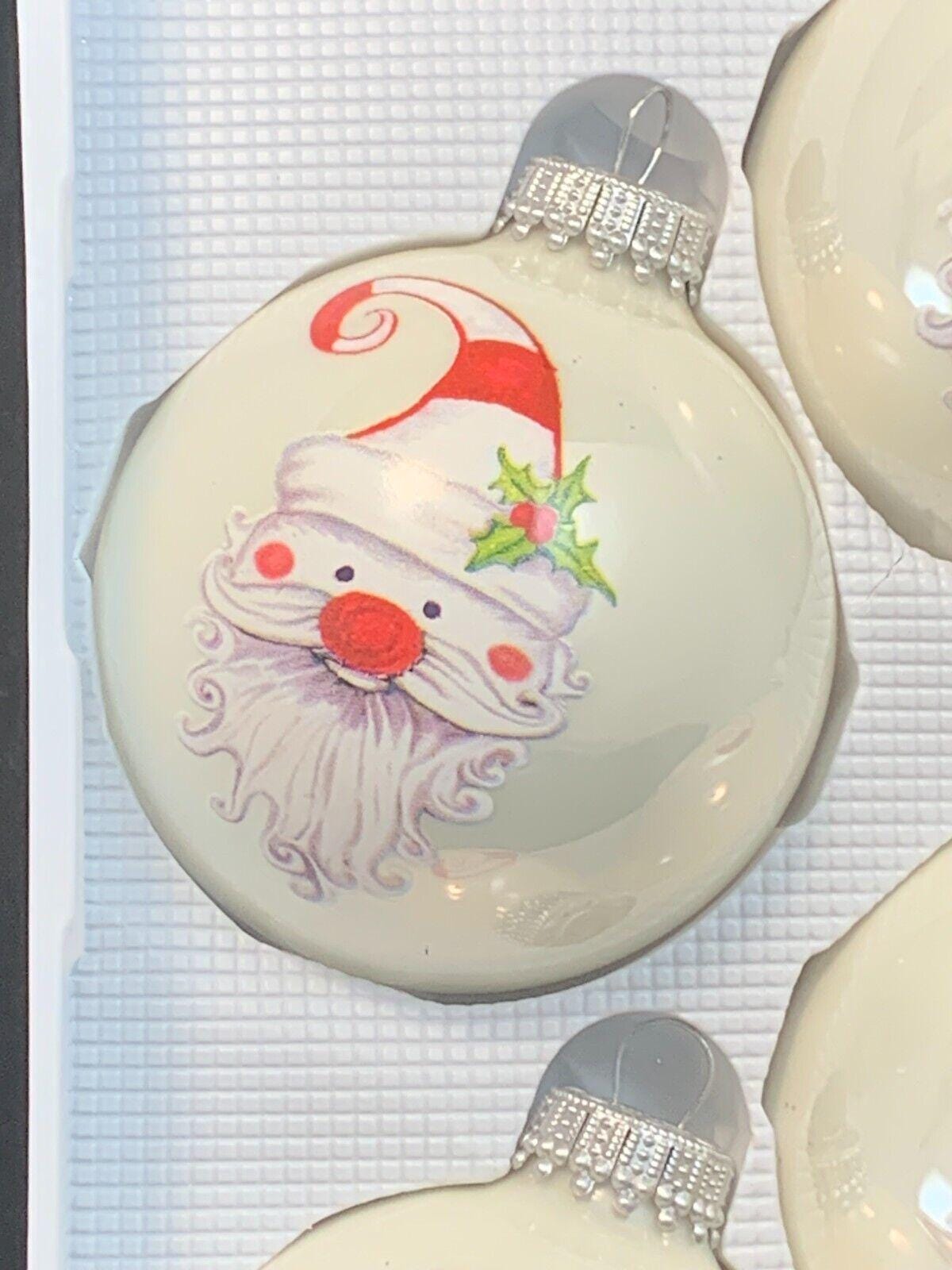 Vintage Holiday Living By Krebs Round White Whimsical St. Nick Santa Claus Glass Bulb or Ball Christmas Tree Ornament Set of 4