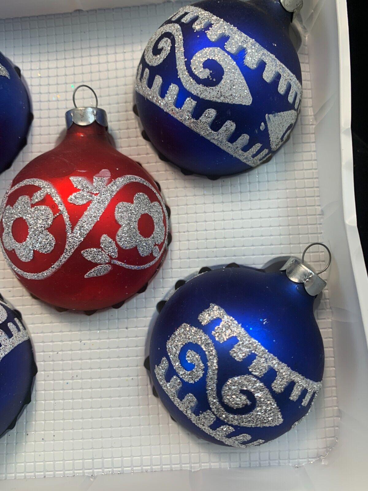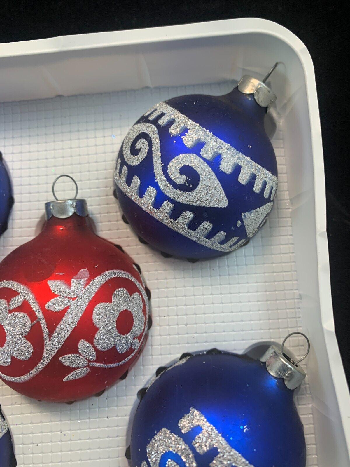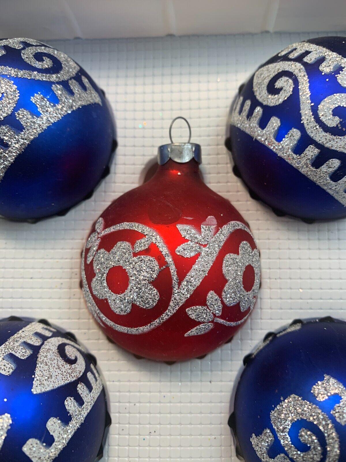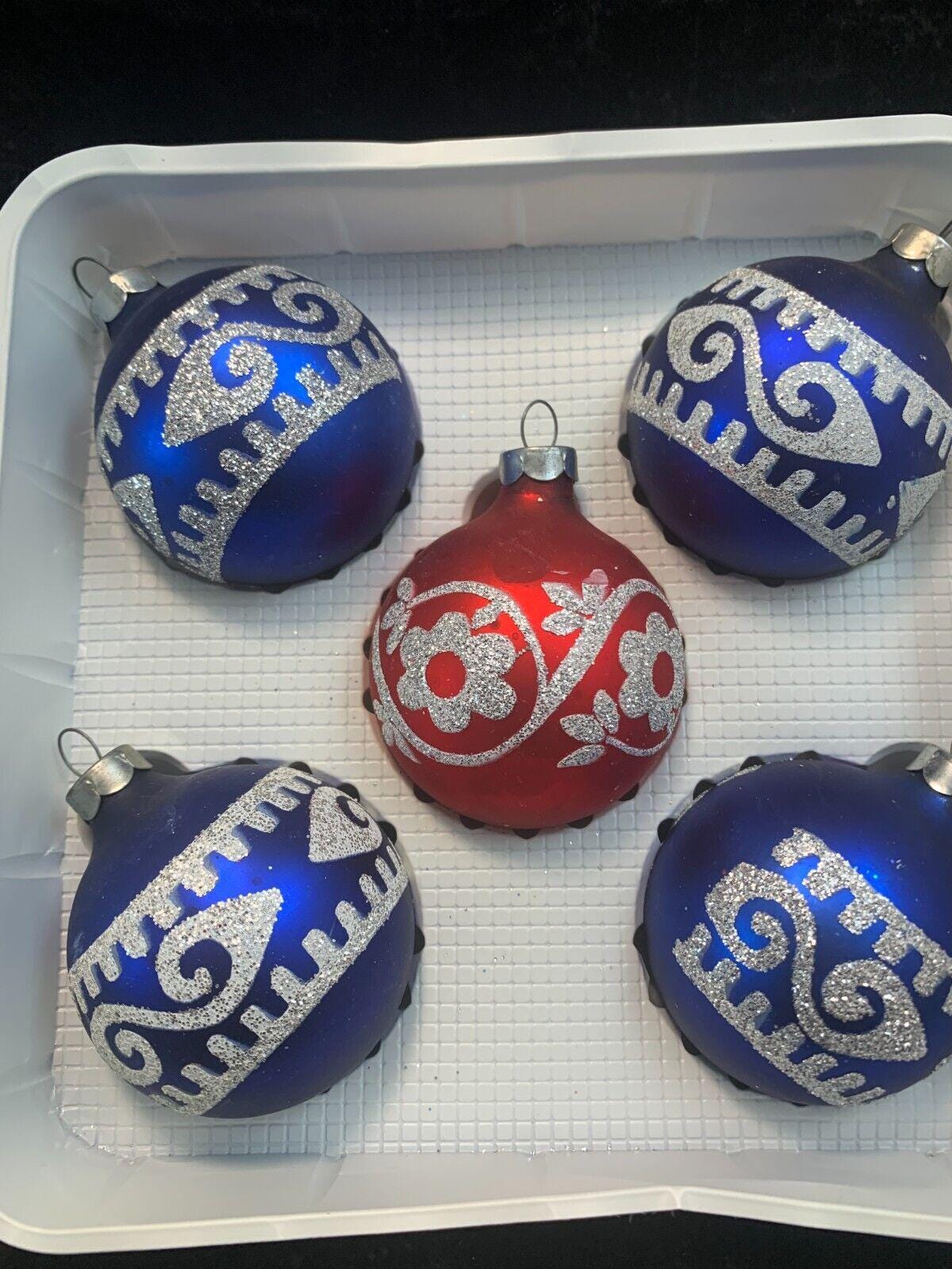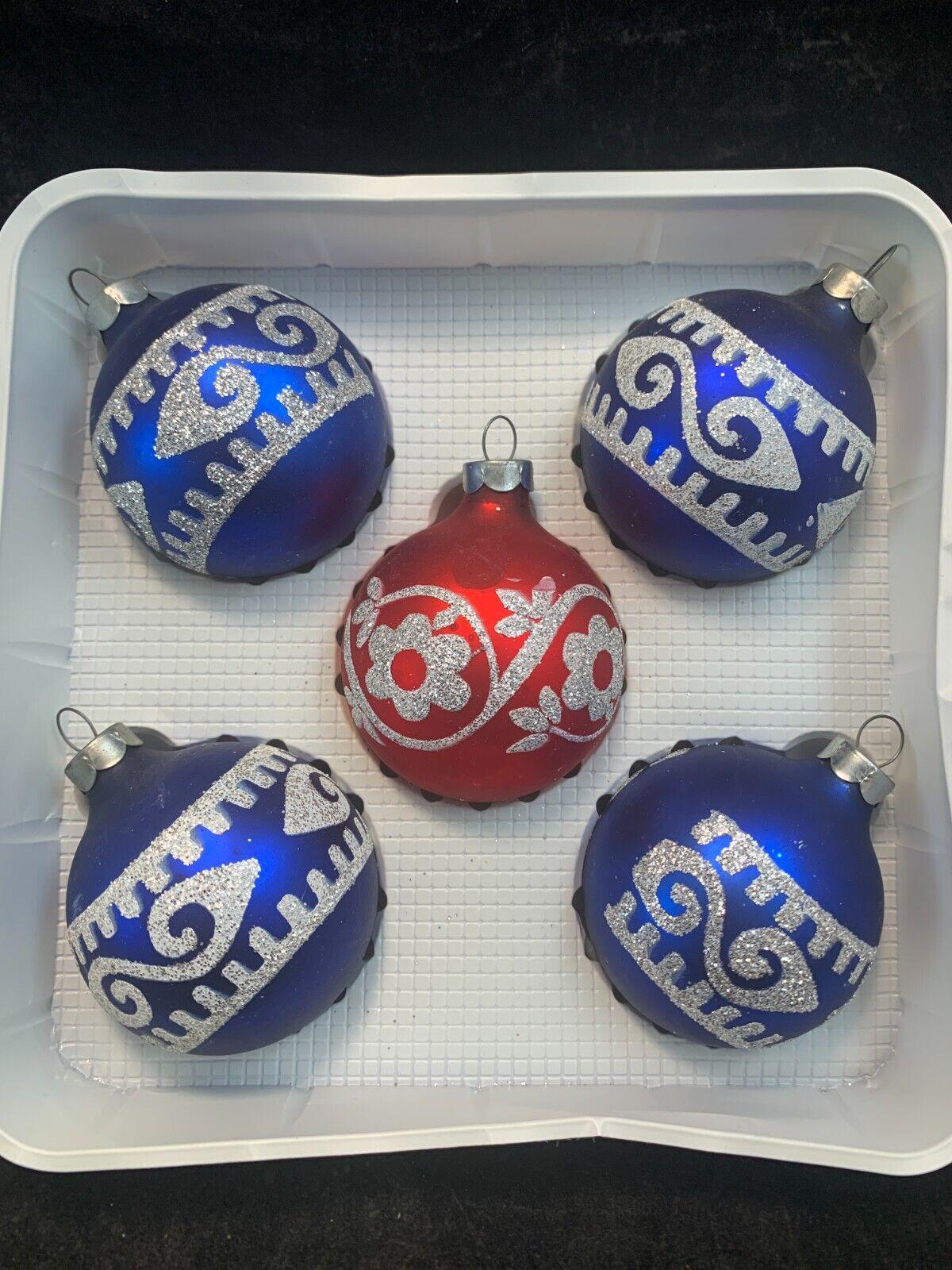 Vintage Glass Christmas Bulb or Ball Ornaments Four Blue and One Red with Silver Glitter Design Set of 5