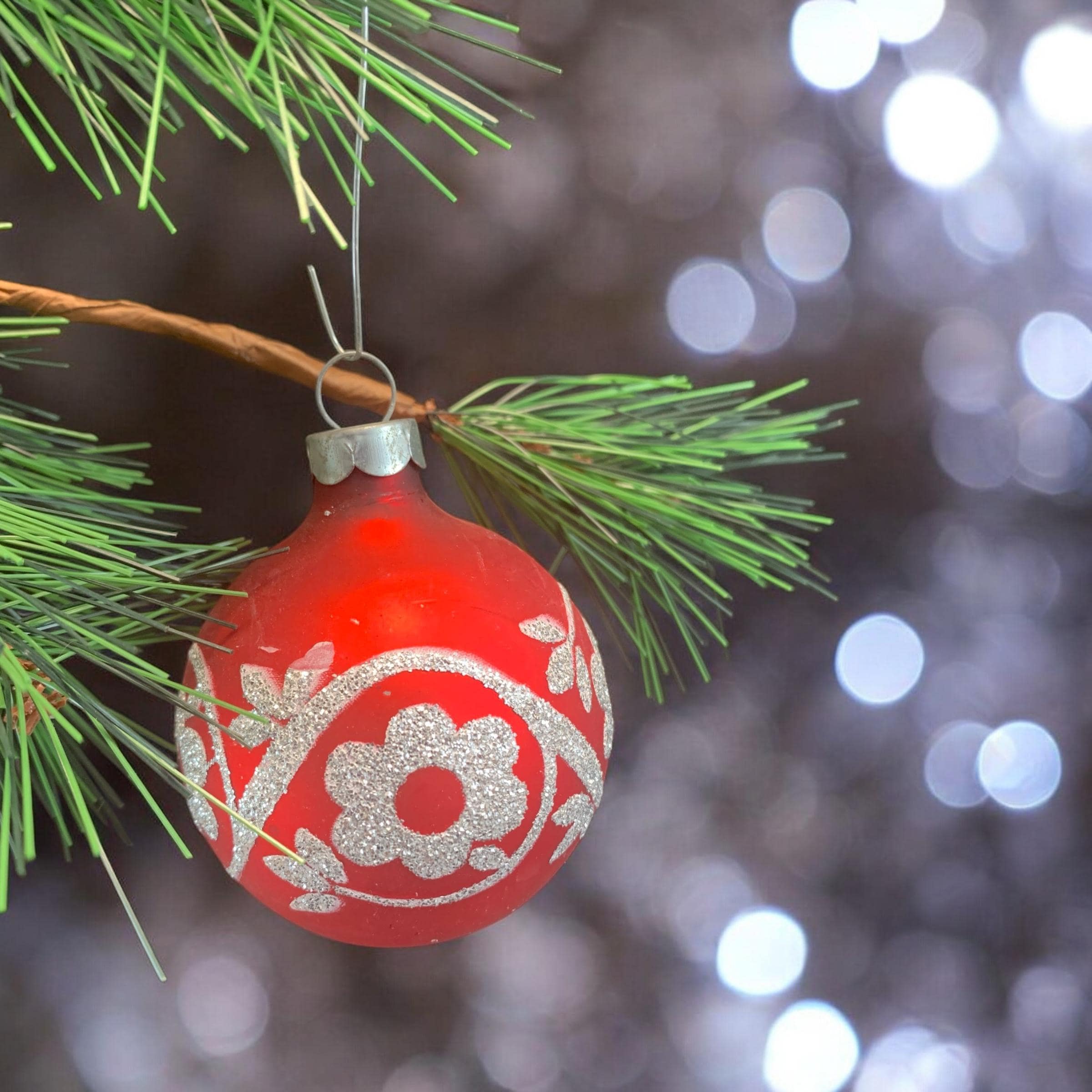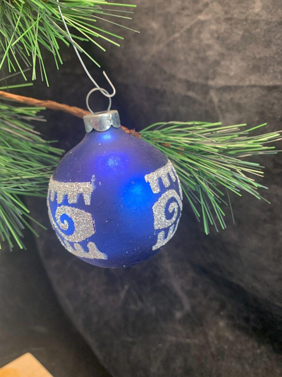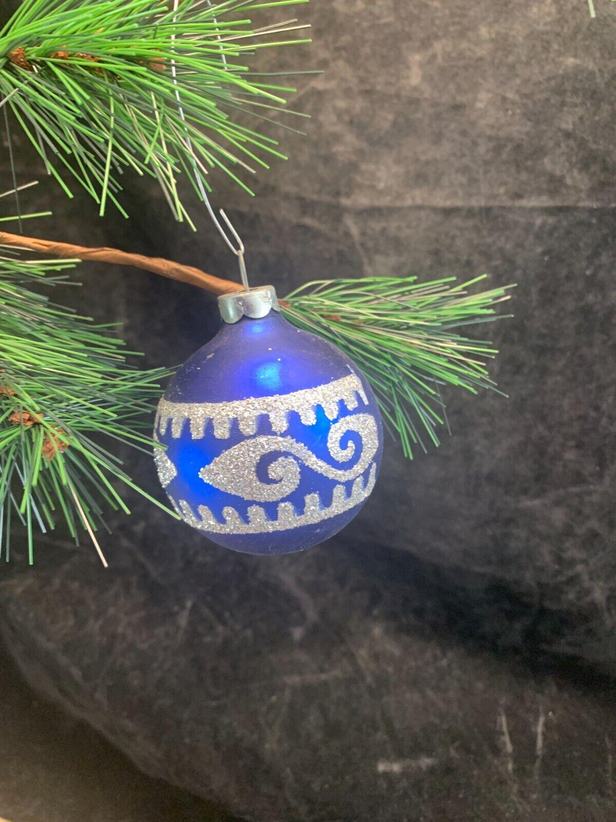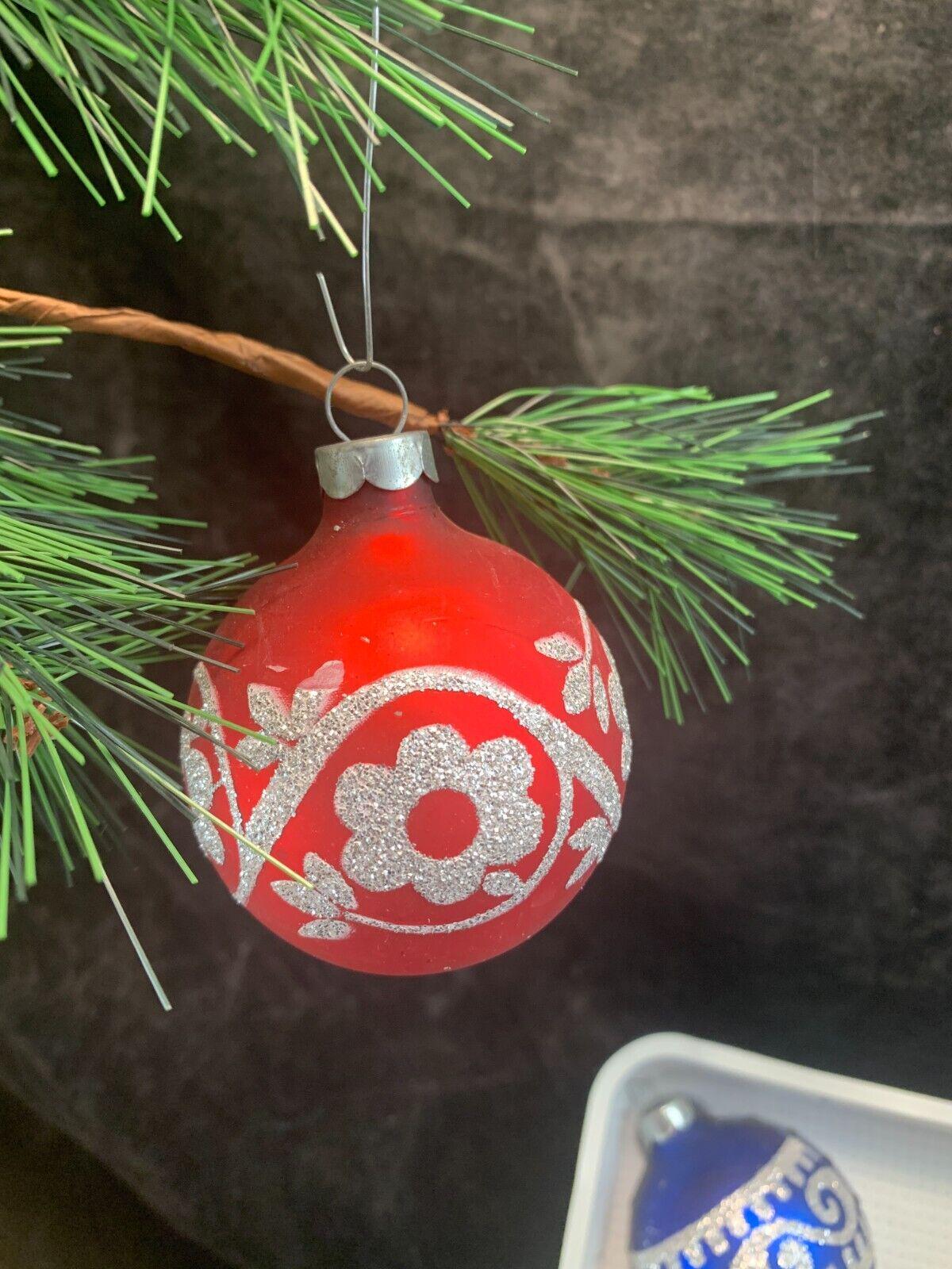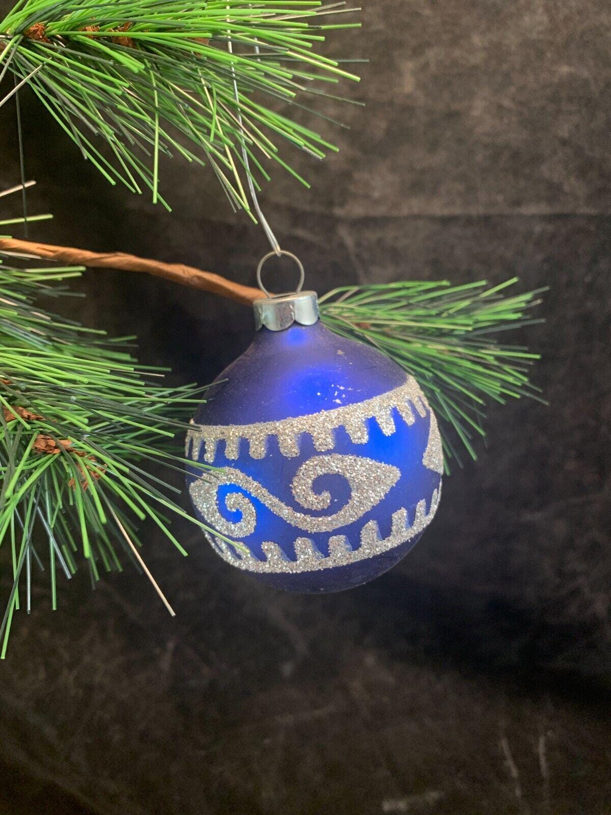 Vintage Glass Christmas Bulb or Ball Ornaments Four Blue and One Red with Silver Glitter Design Set of 5