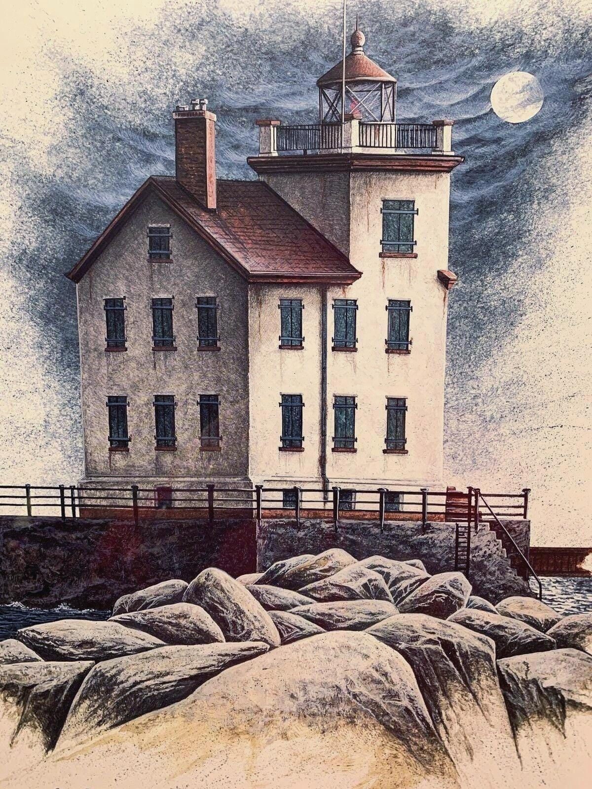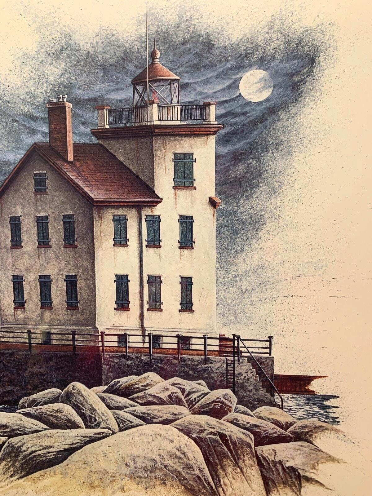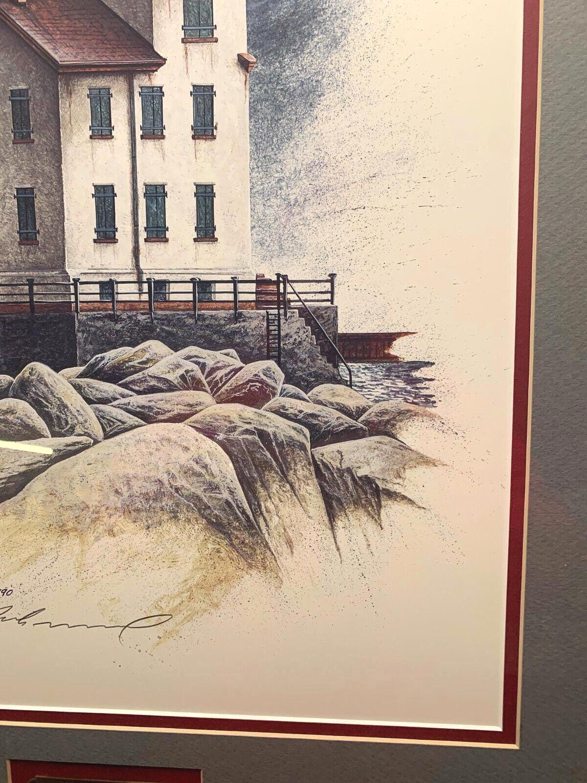 Professionally Framed Ben Richmond Harbor Lights Lake Erie Lithograph Art LE to 600 Hand Signed Under Glass 24.75 X 21.75 Inch From 1990