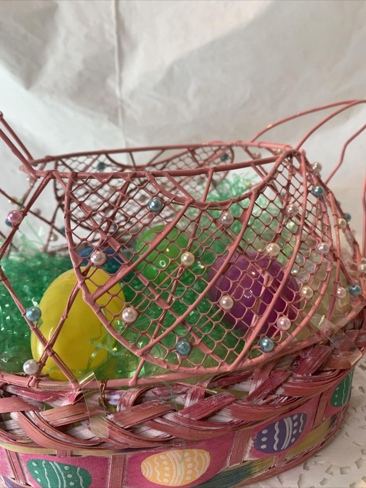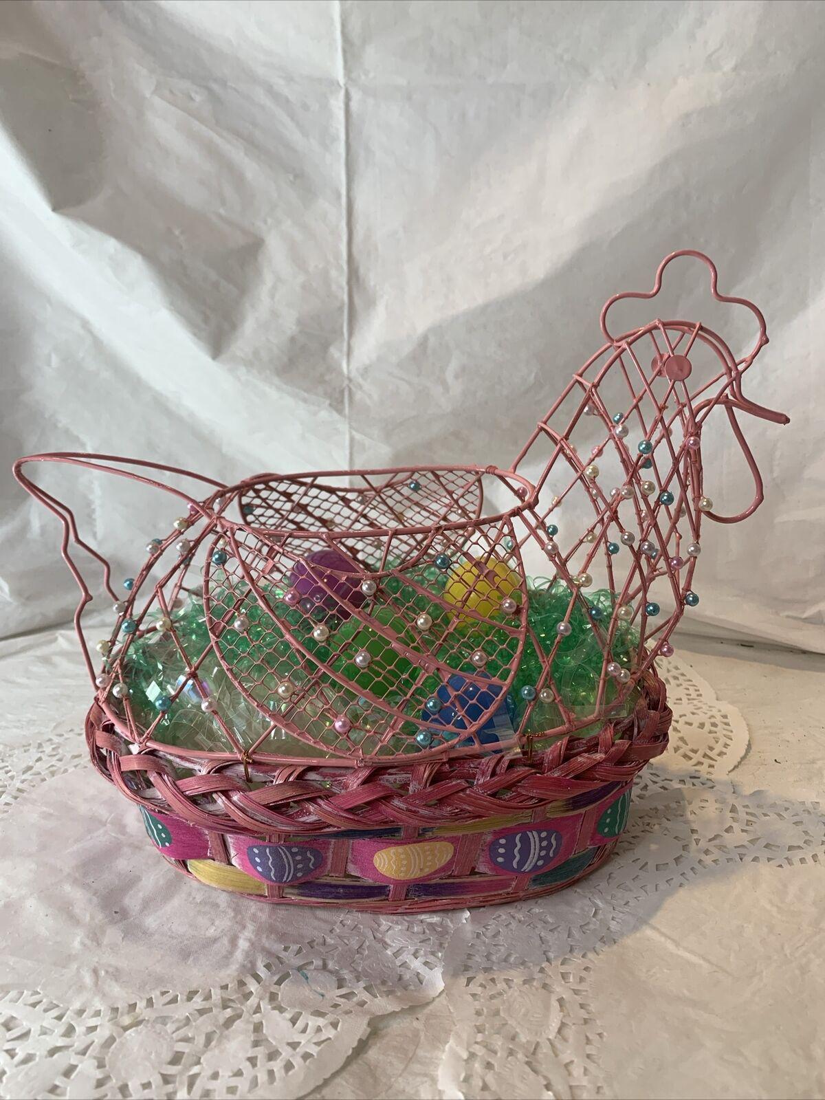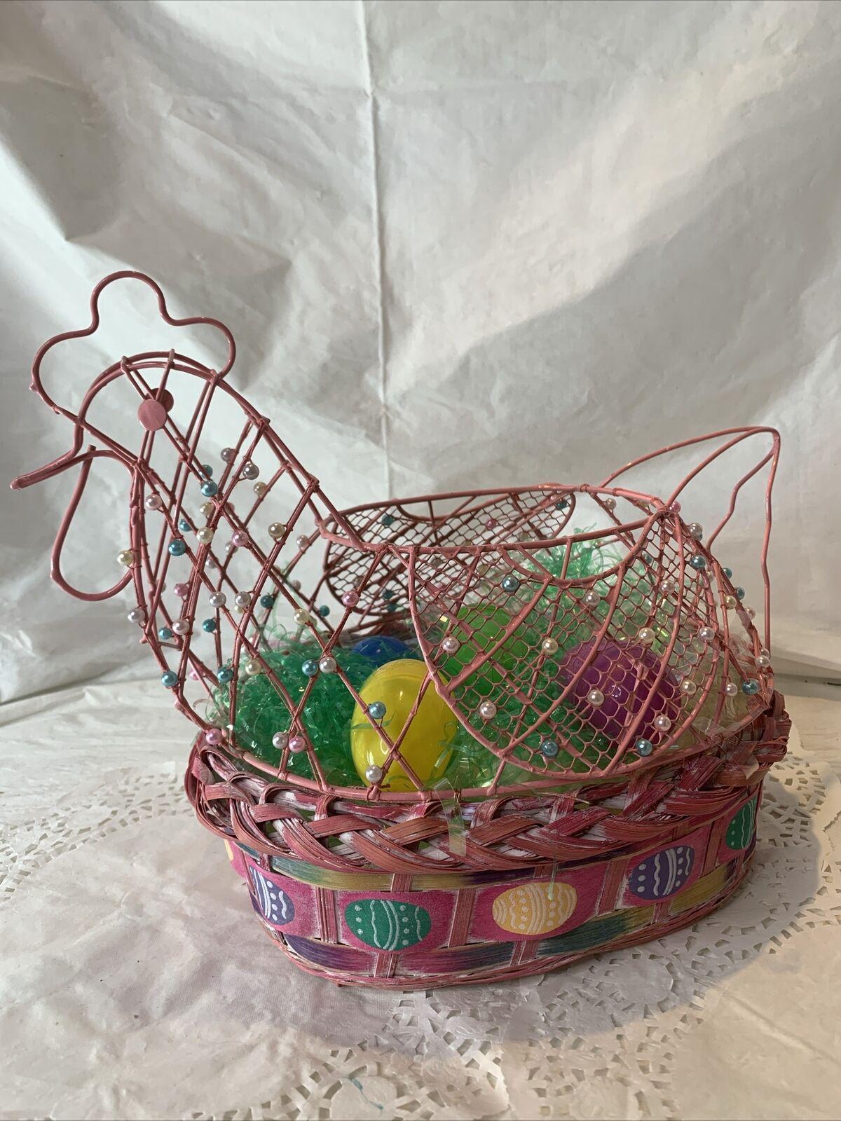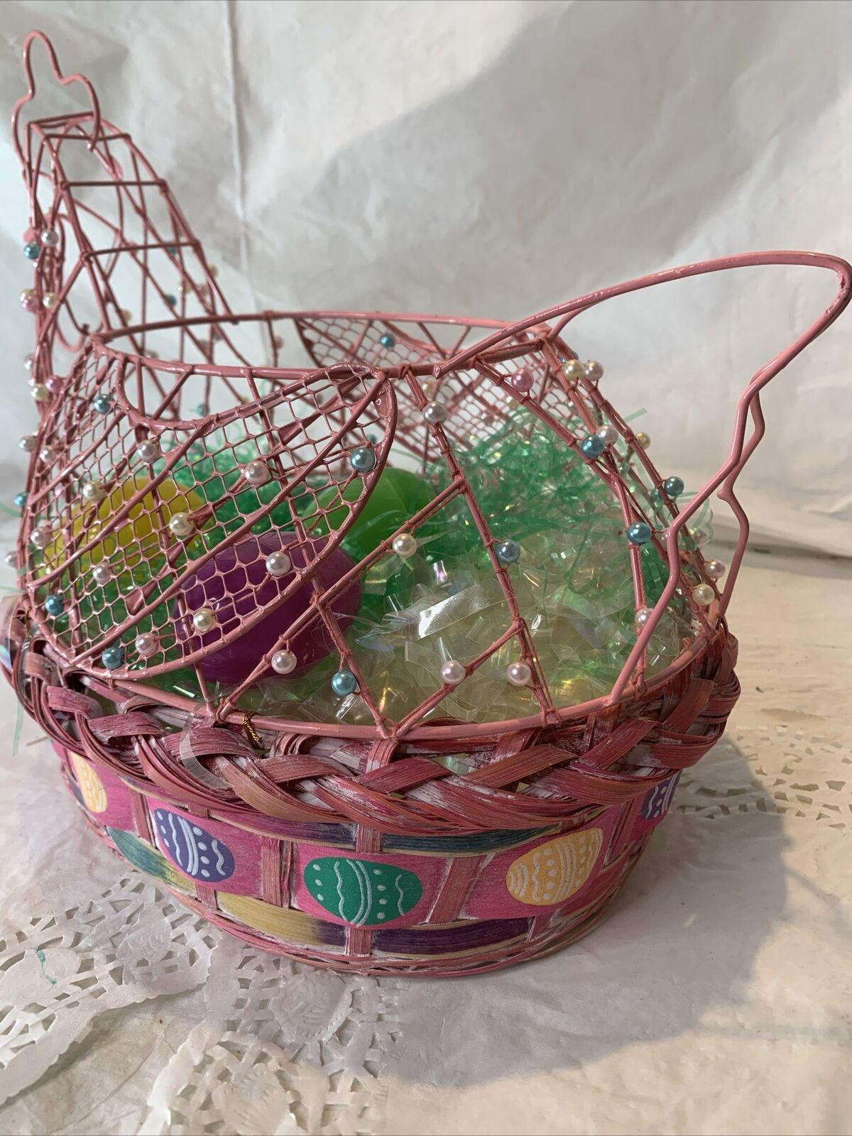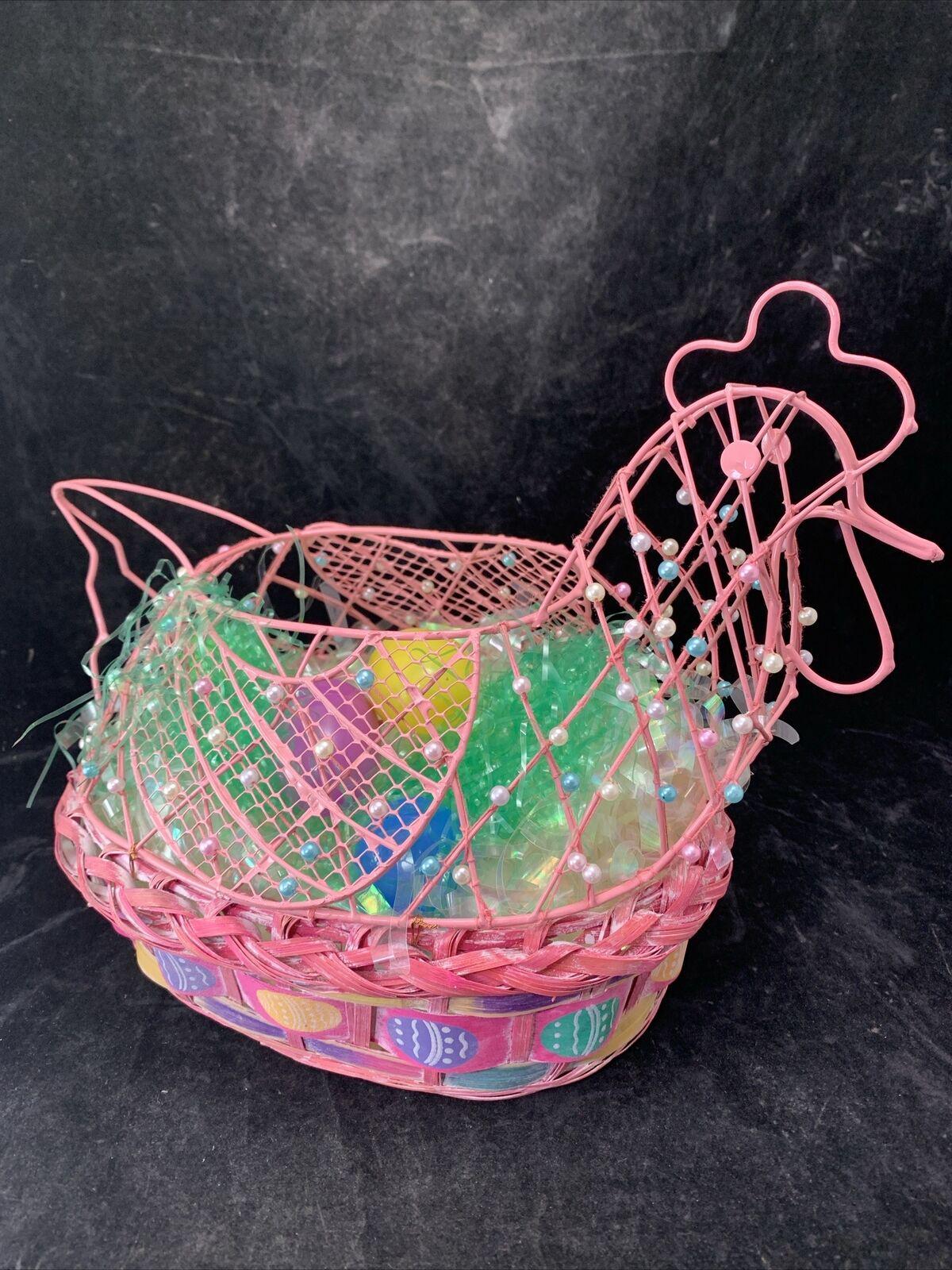 Vintage Pink Wood and Woven Wire Frame Chicken Shaped Spring Easter Basket Decoration W/Beaded Embellishments Includes Easter Eggs and Grass