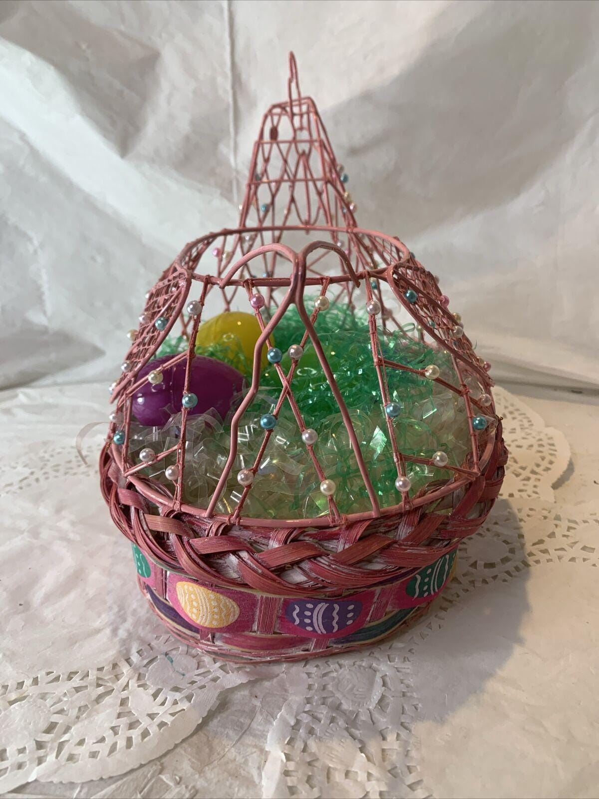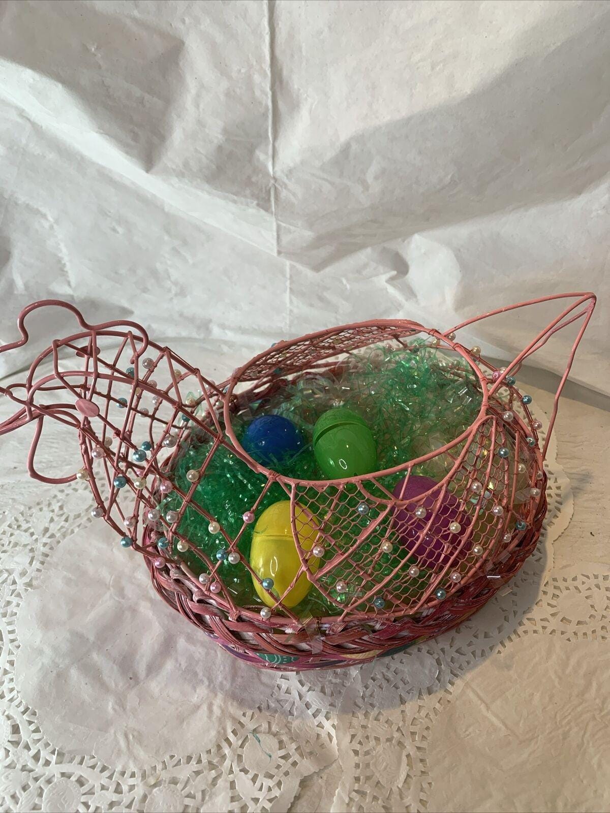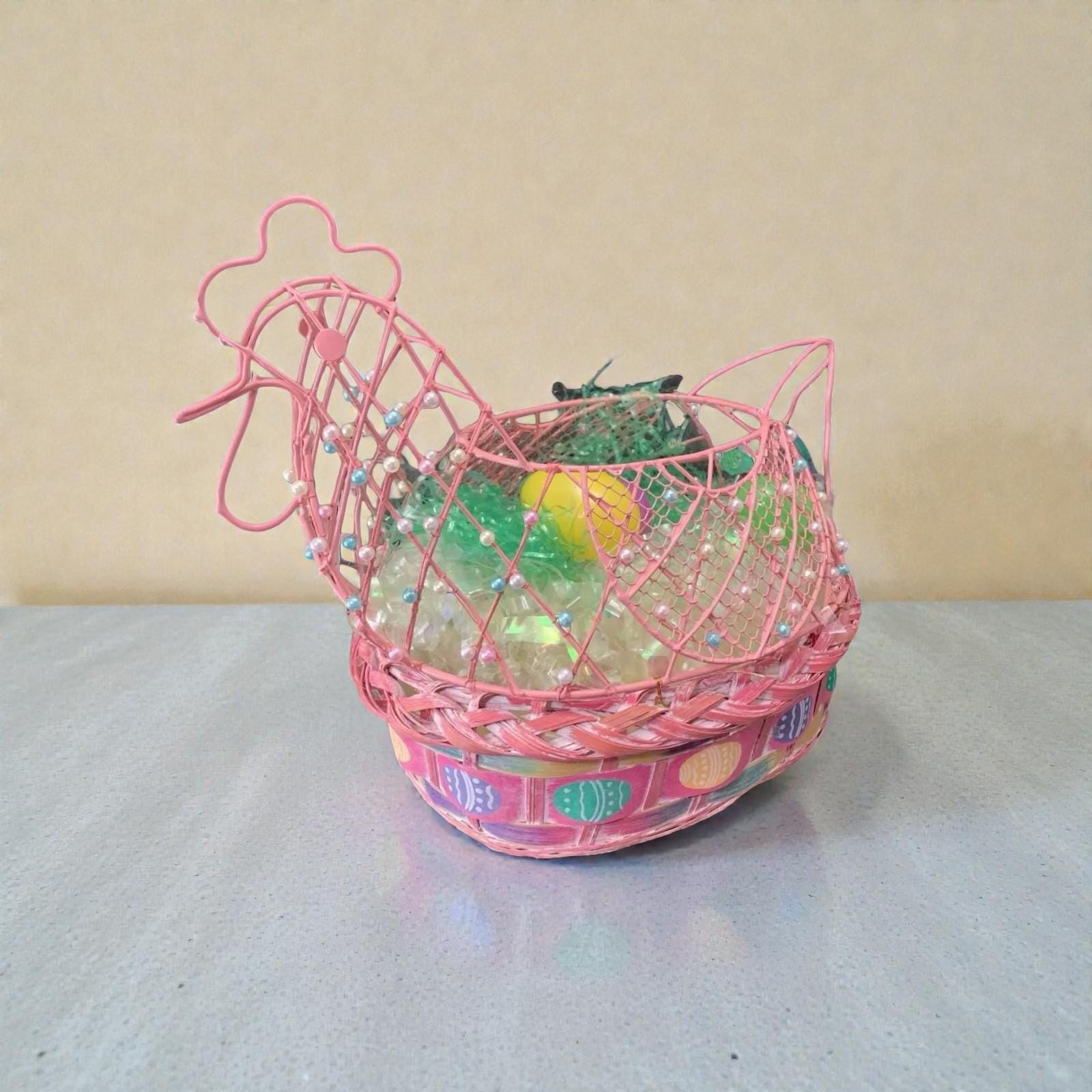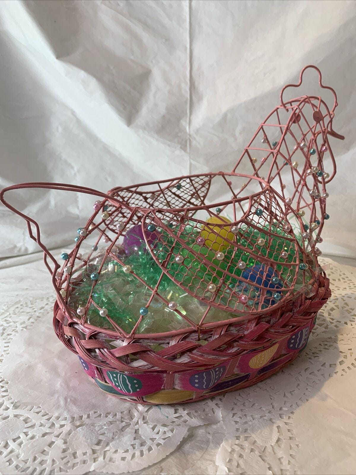 This beautiful vintage basket is a must-have for anyone who loves holiday collectibles, especially chickens. It is made of woven materials and features a pink chicken wire frame embellished with pearls.