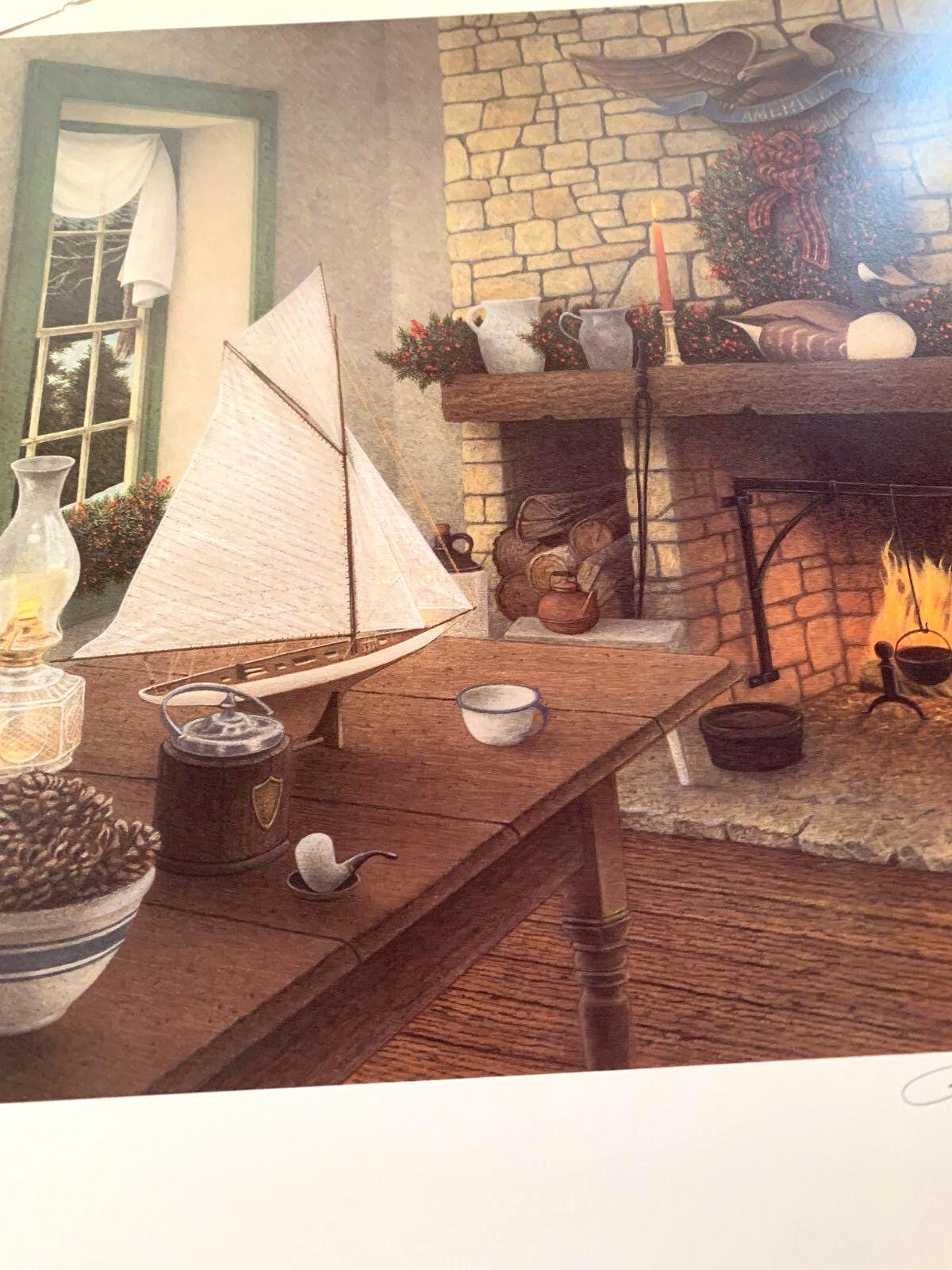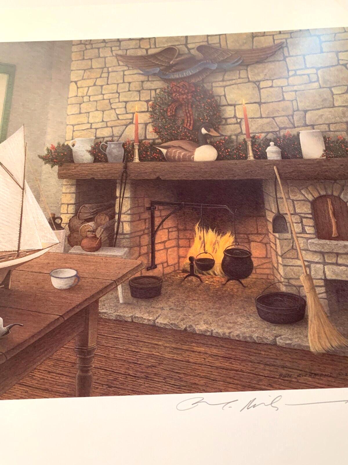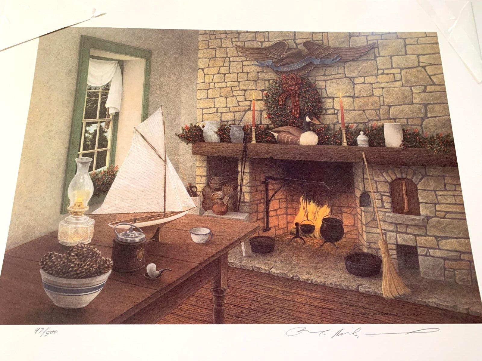 Discover the warm glow of a fireplace ready for the holidays at the lake with "Holiday Hearth" by Ben Richmond. This hand-signed lithograph captures the essence of life during the holidays in the coastal region!