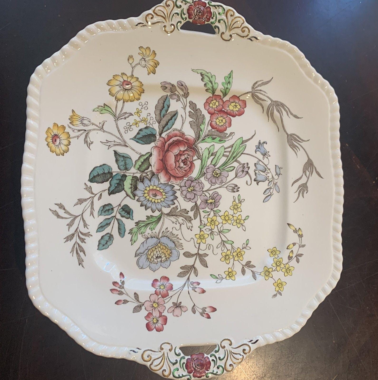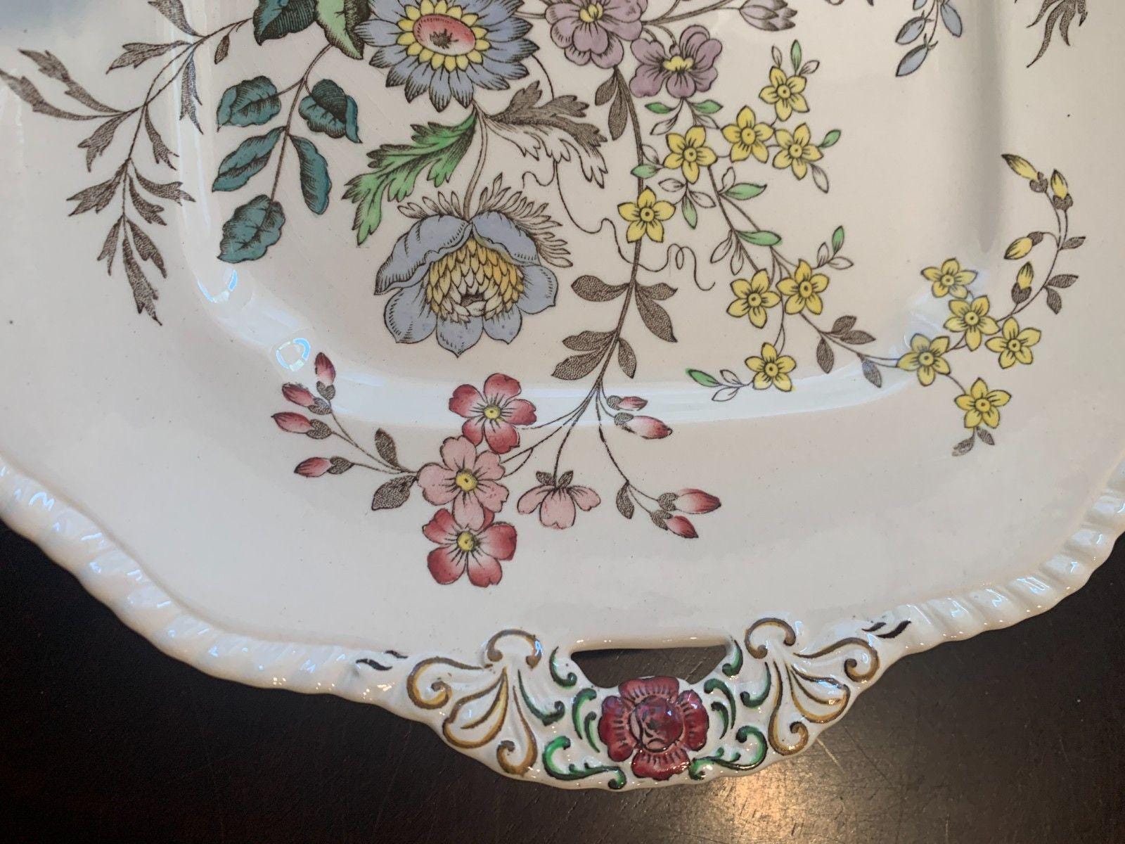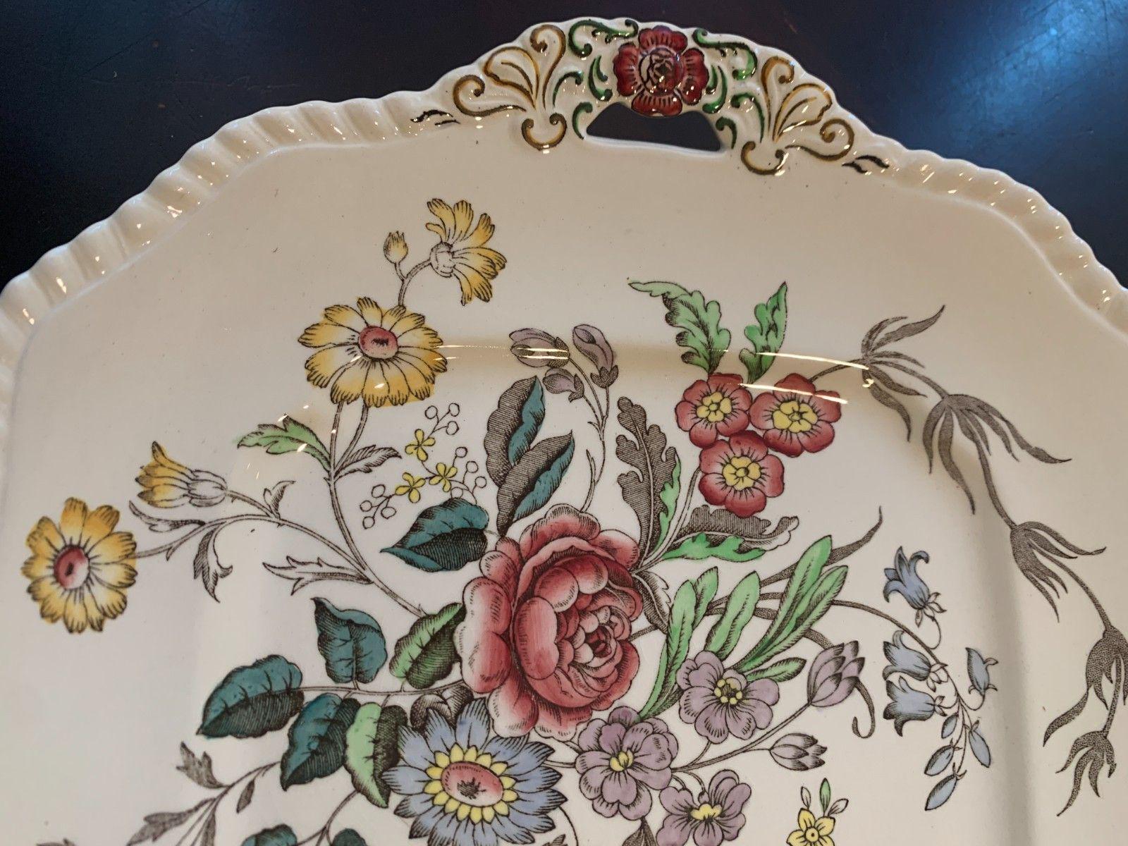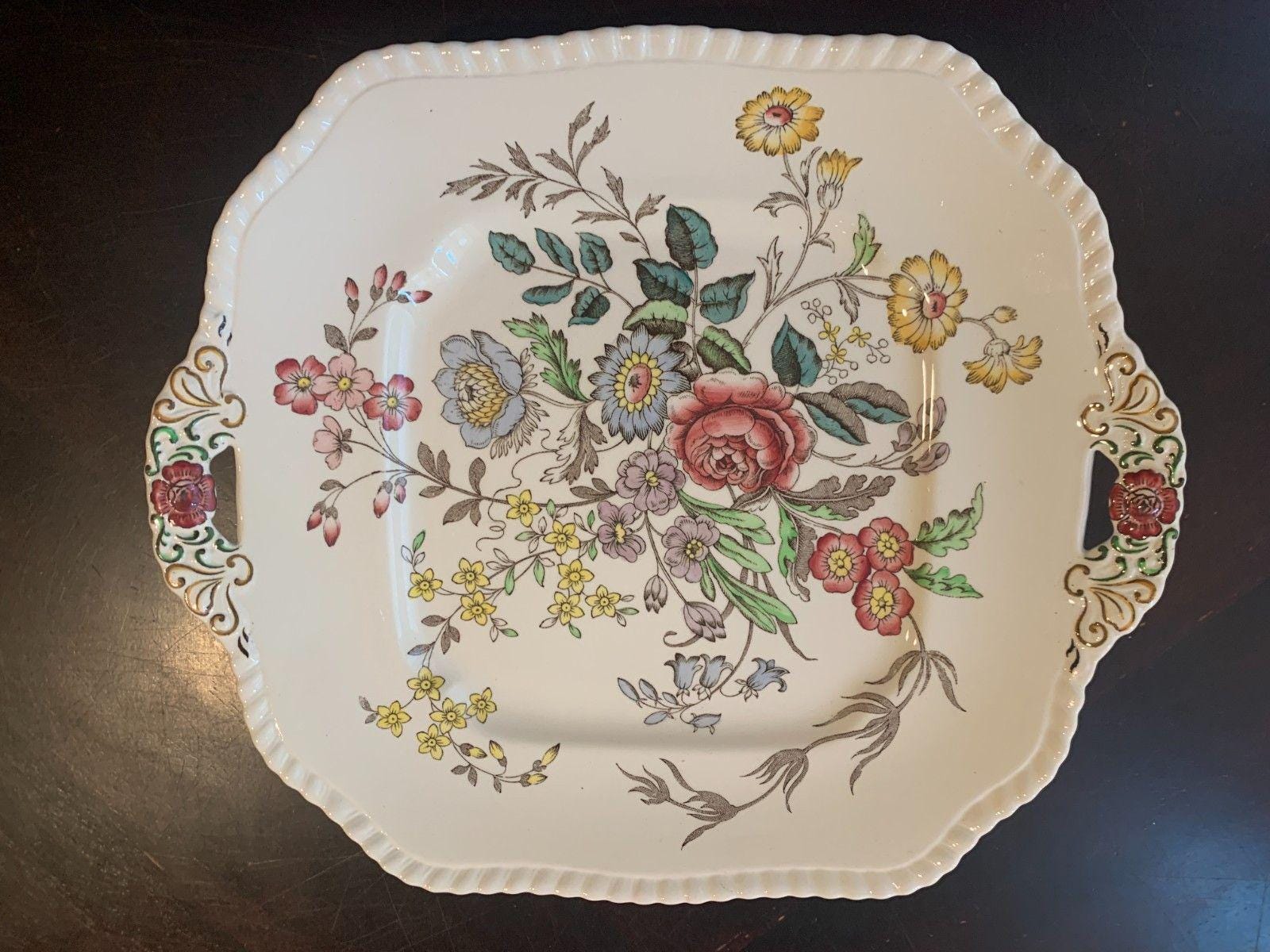 This lovely oval cake plate with handles is a traditional and collectible piece, made of glossy porcelain in a multicolor floral pattern!