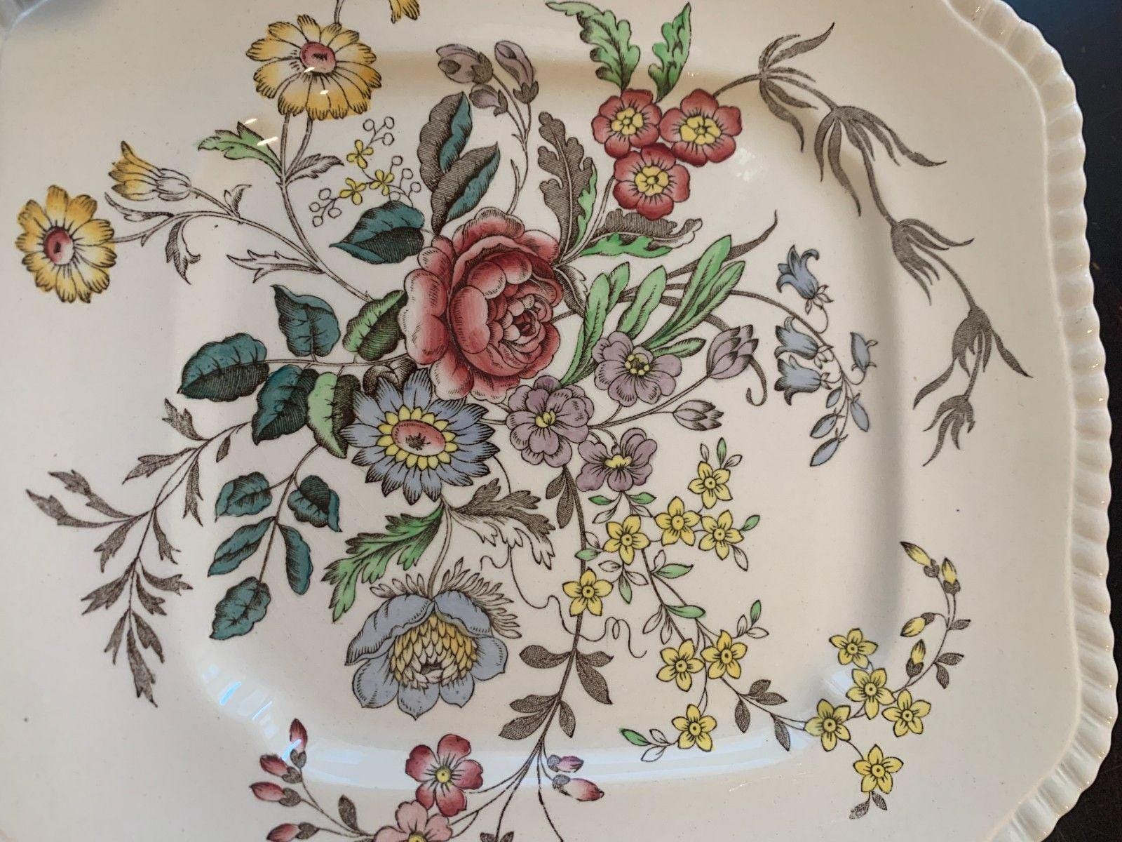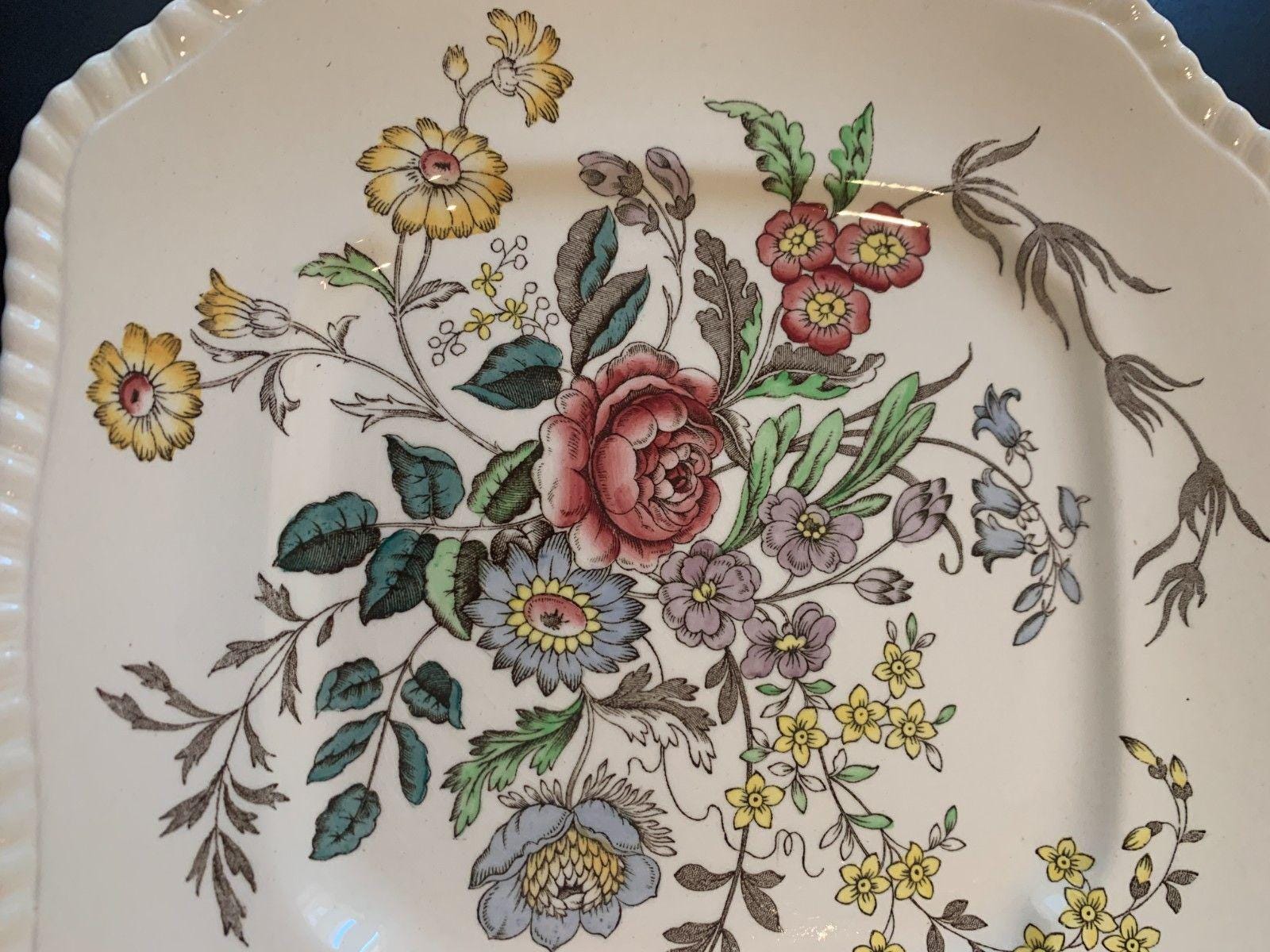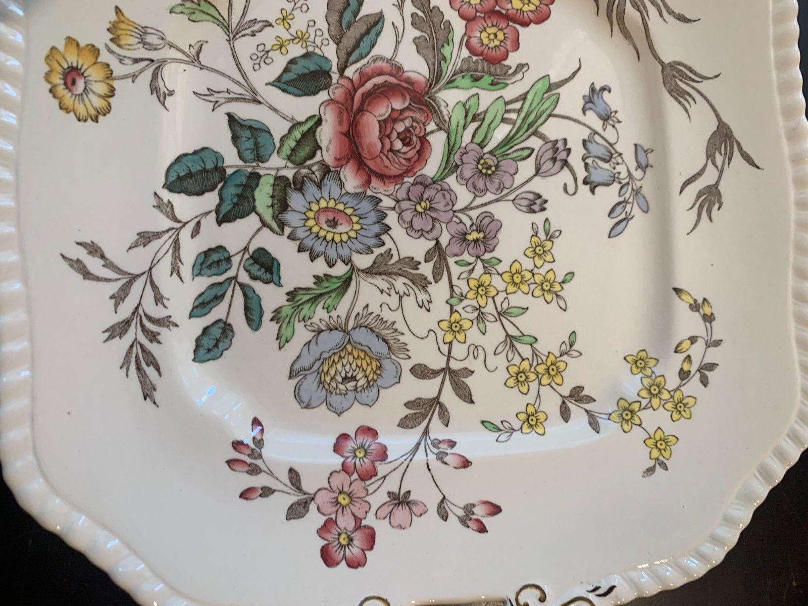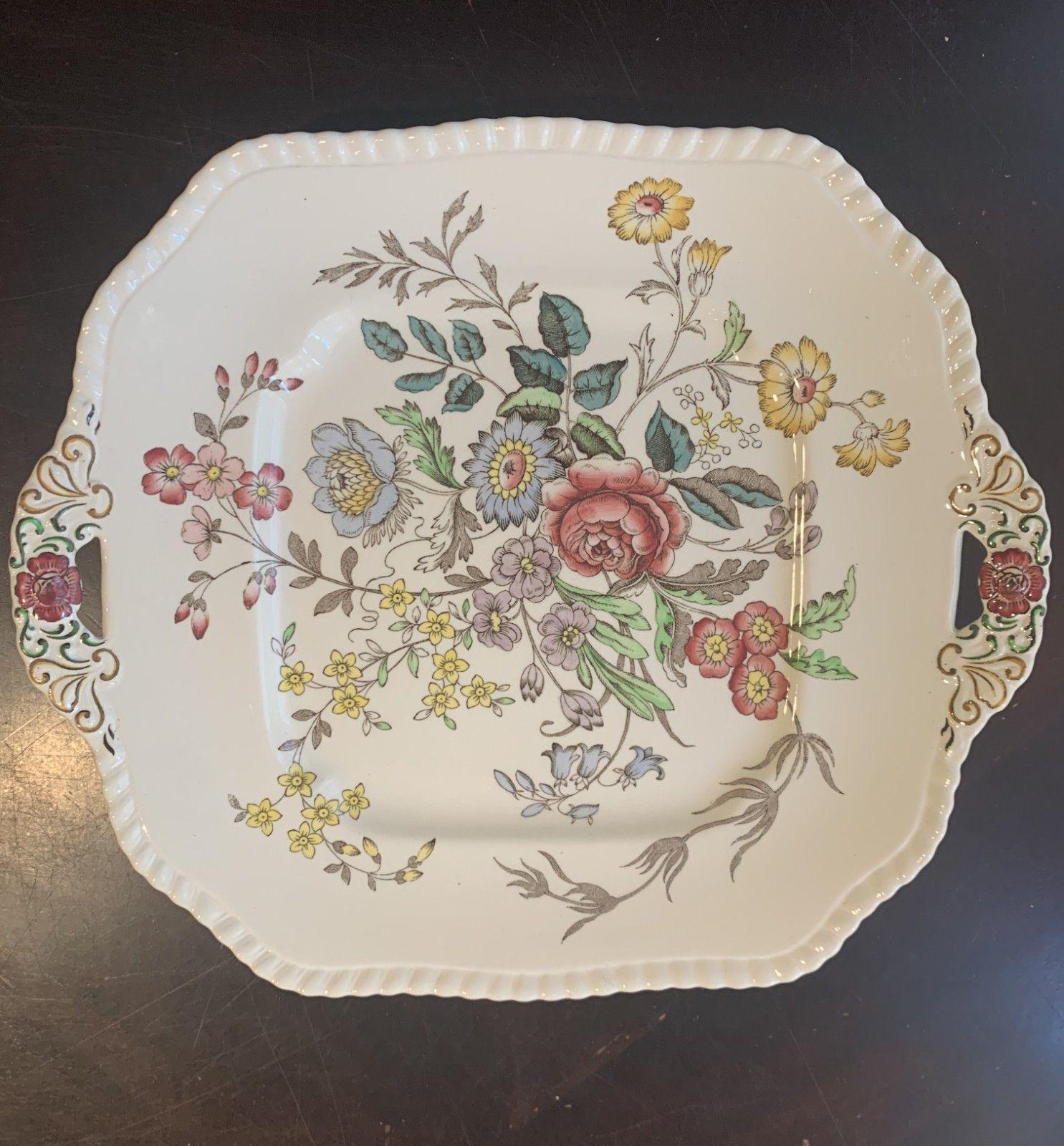 This lovely oval cake plate with handles is a traditional and collectible piece, made of glossy porcelain in a multicolor floral pattern!