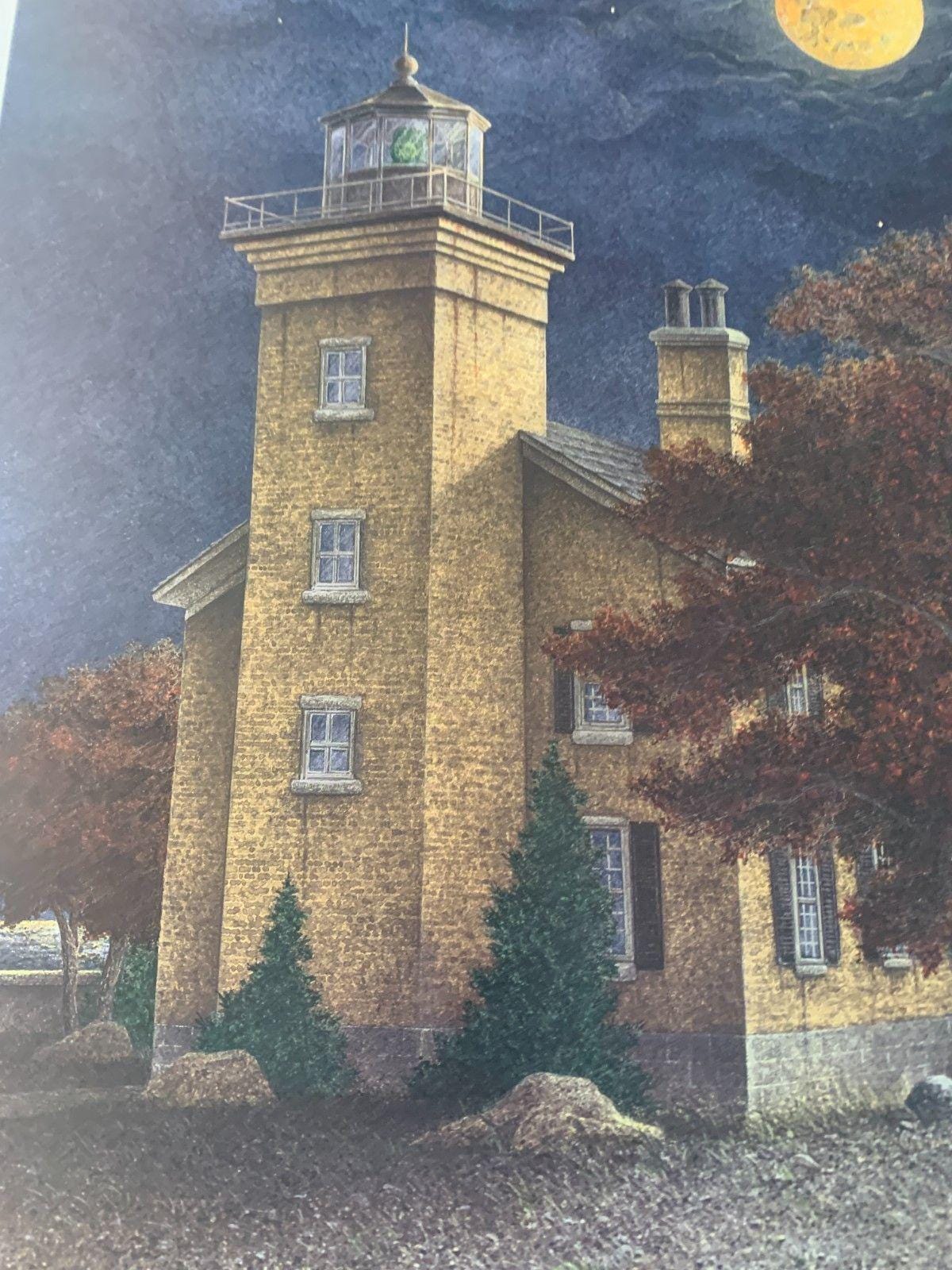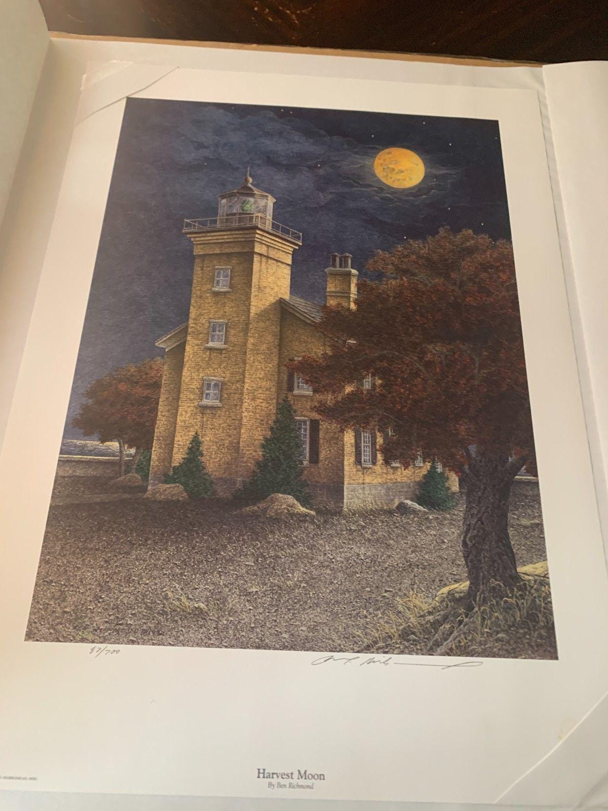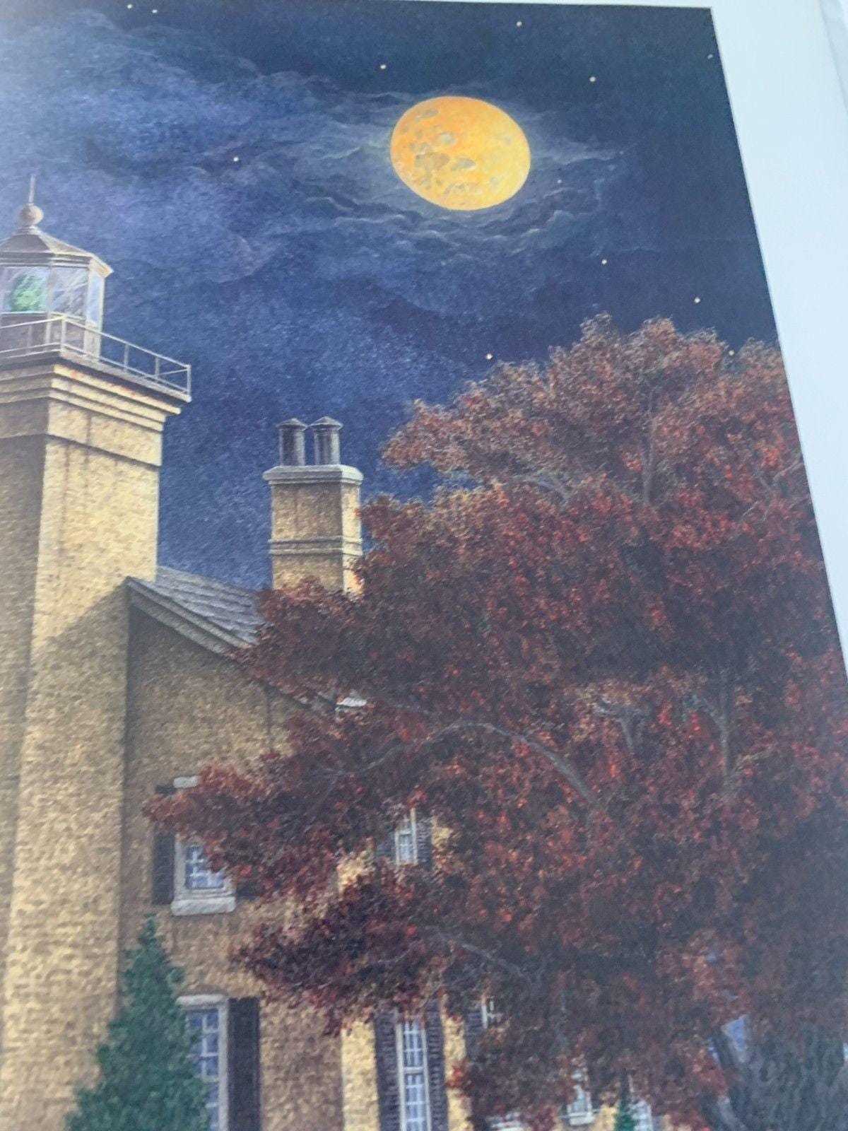 Discover the beauty of the Lighthouse in the full moon night sky with "Harvest Moon" by Ben Richmond. This hand-signed lithograph captures the Lighthouse in the full moon of harvest in the coastal region!
