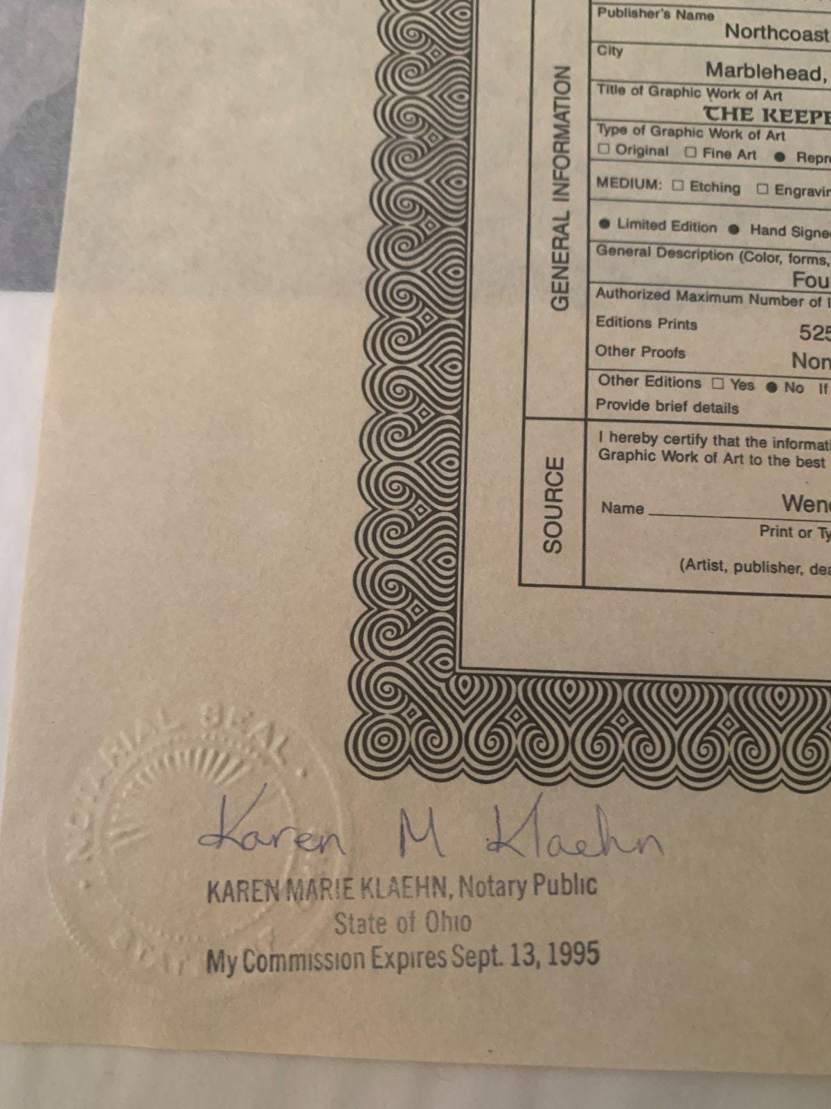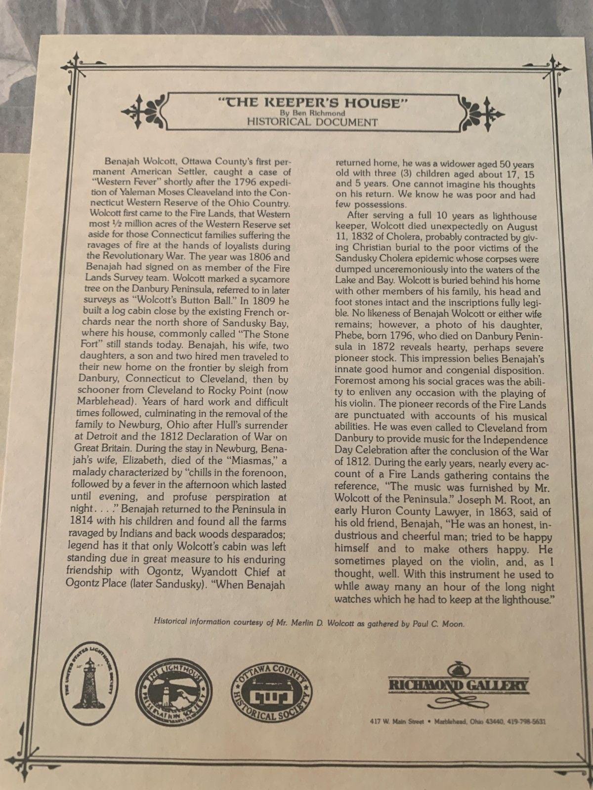 A tribute to the first lighthouse keeper on Marblehead, Benajah Wolcott, with "The Keeper's House" by Ben Richmond. This hand-signed lithograph captures the essence of the life of the protector of the Lake in the coastal region!