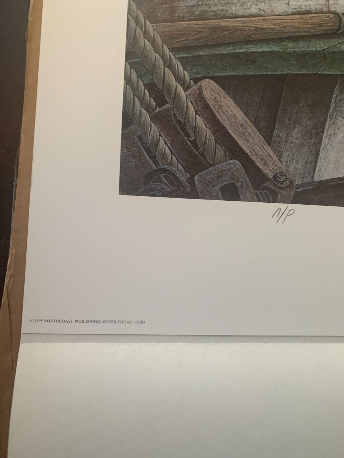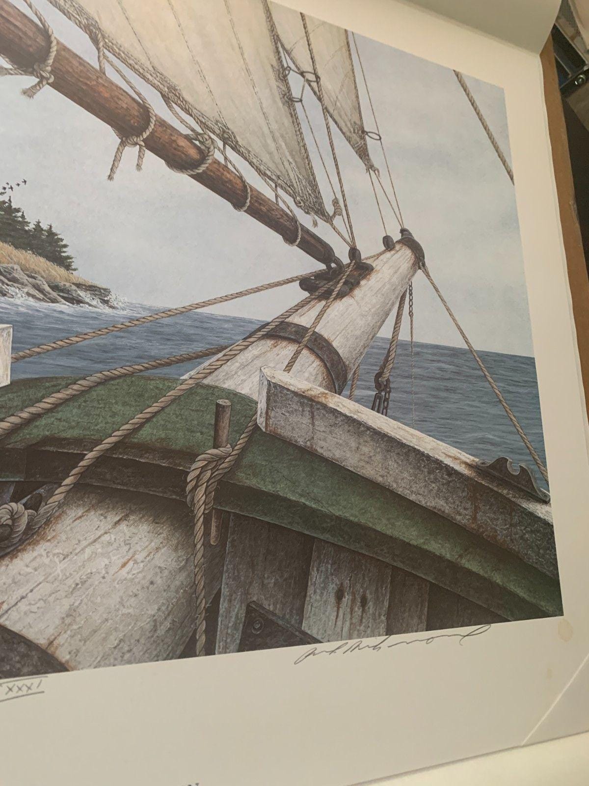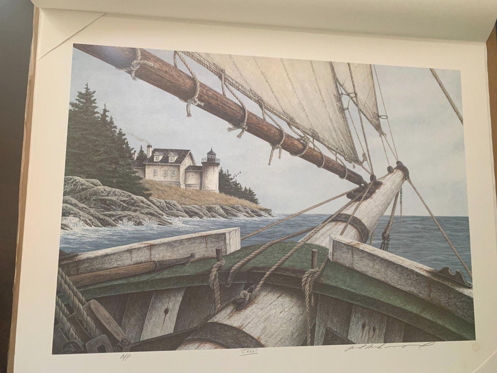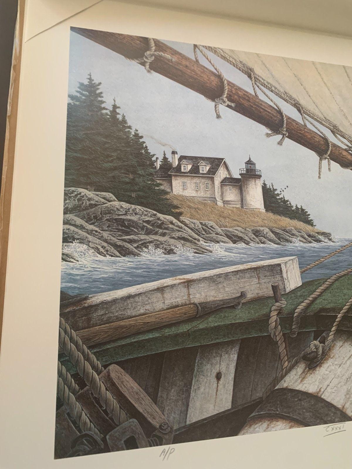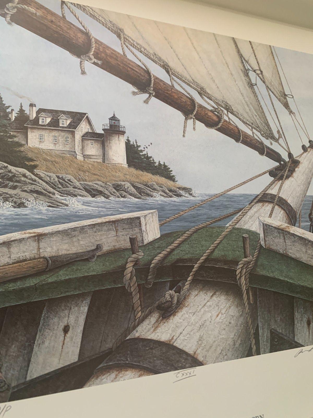 "Rounding the Horn" by Ben Richmond captures a view of the foredeck on the schooner Grace Bailey, built in 1882 by Oliver Perry Smith, passing the lighthouse on Southern Island near Tenant Harbor, Maine. Maine Nautical lithograph capturing the life of a sailor.