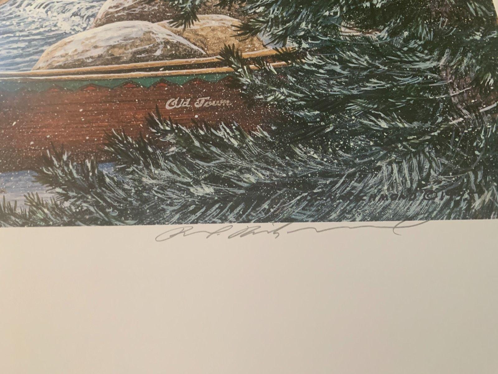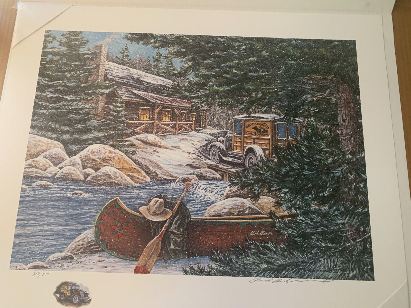 A rustic winter setting at the lodge with light snow and the Moosehead lodge truck bringing guests captured in "The Guide" by Ben Richmond. This hand-signed lithograph captures the essence of life during the winter at the lodge in years past!