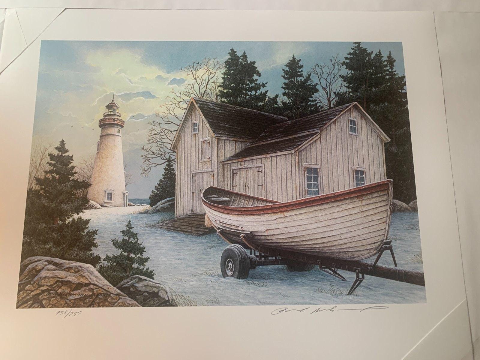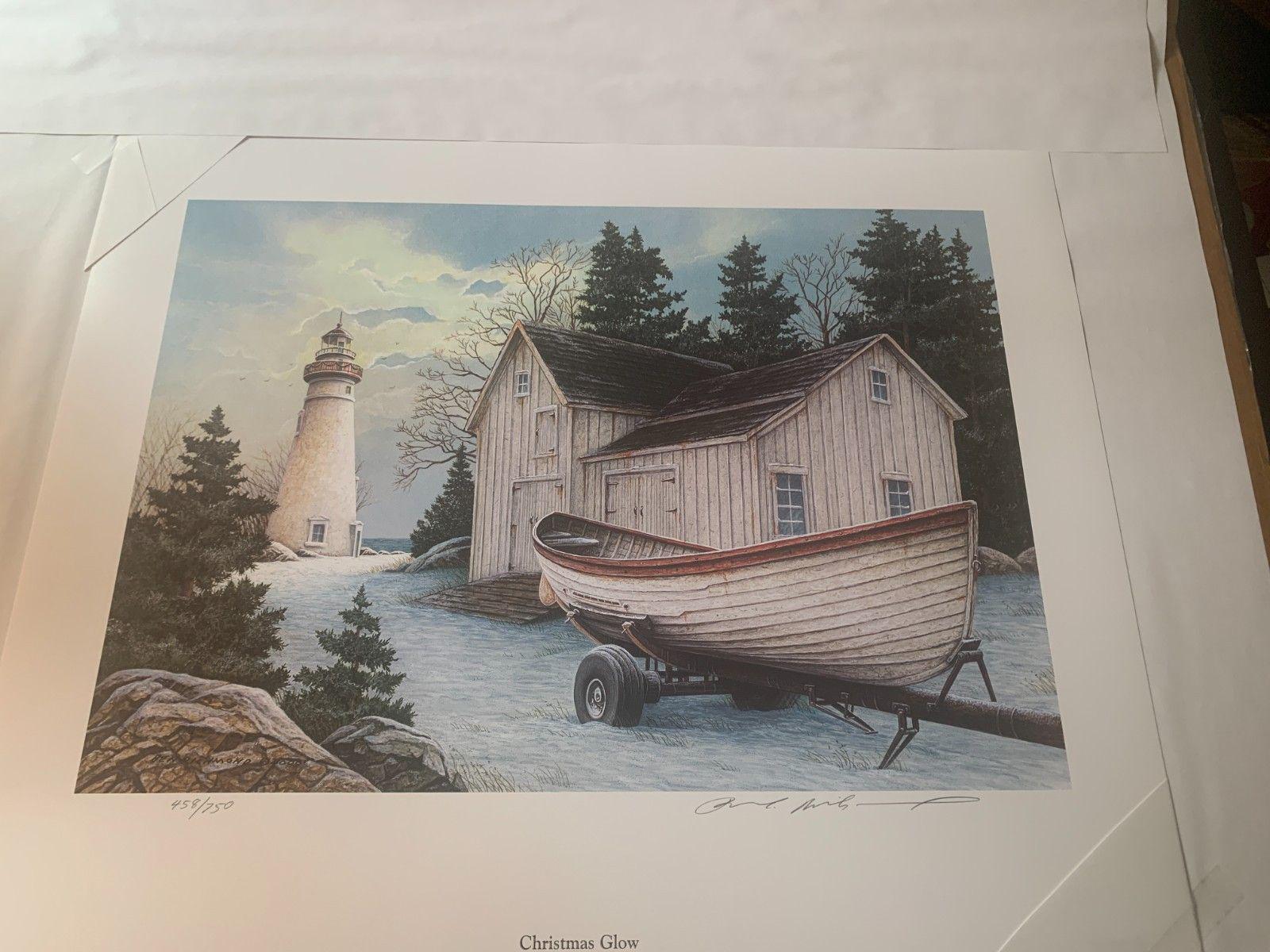 A rustic winter setting at the lighthouse with light snow and the sun rising in the background is captured in "The Christmas Glow" by Ben Richmond. This hand-signed lithograph captures the essence of life during the winter at the lighthouse in years past!